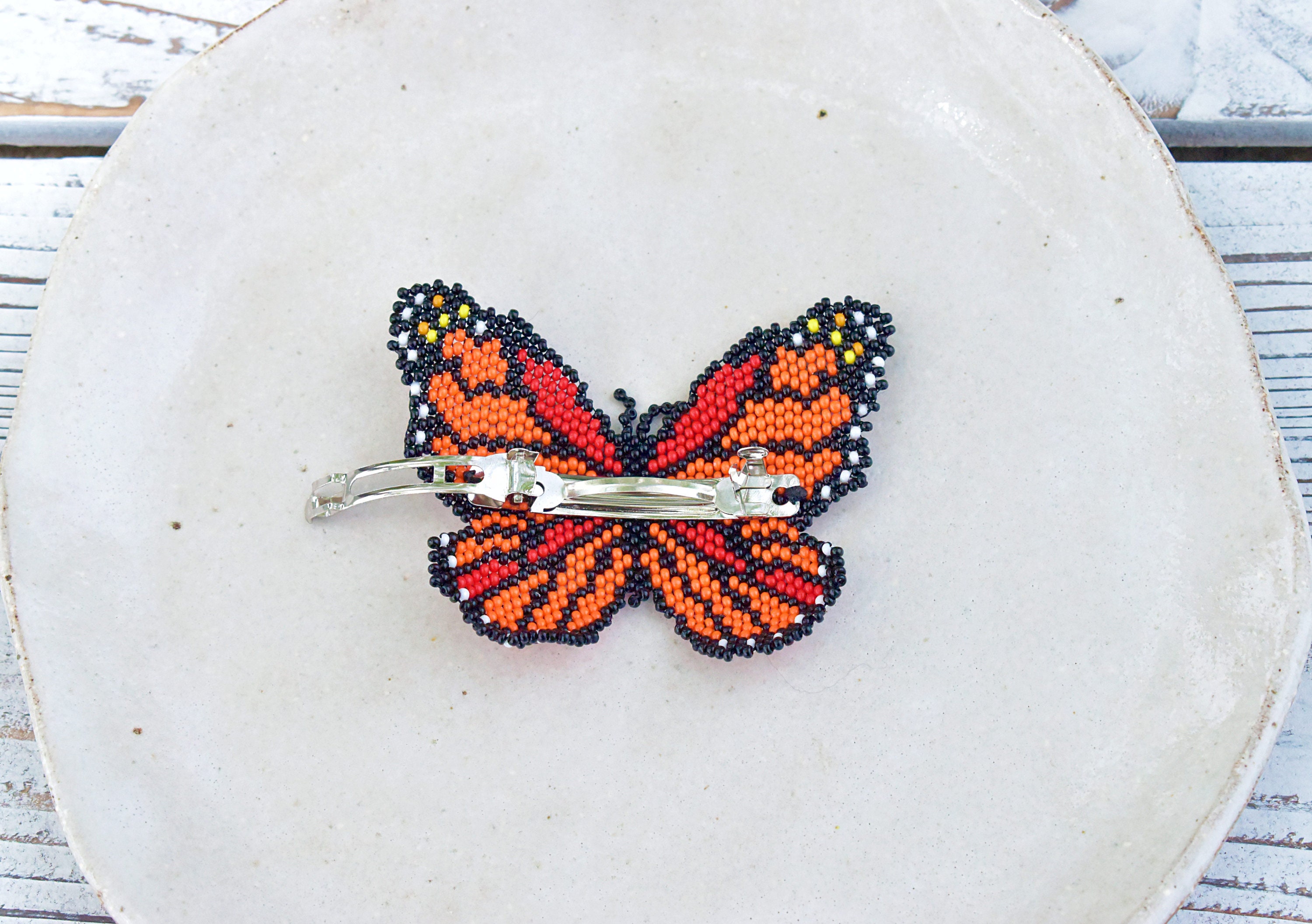 This handmade beaded hairclip features a beautiful butterfly design with an orange, red and black base. This piece is meant for everyday use and can be applied to a variety of hairstyles. It will surely add a wonderful pop of color to your hair (a place often overlooked) and it will most definitely add a special touch to virtually any outfit, formal and casual.
