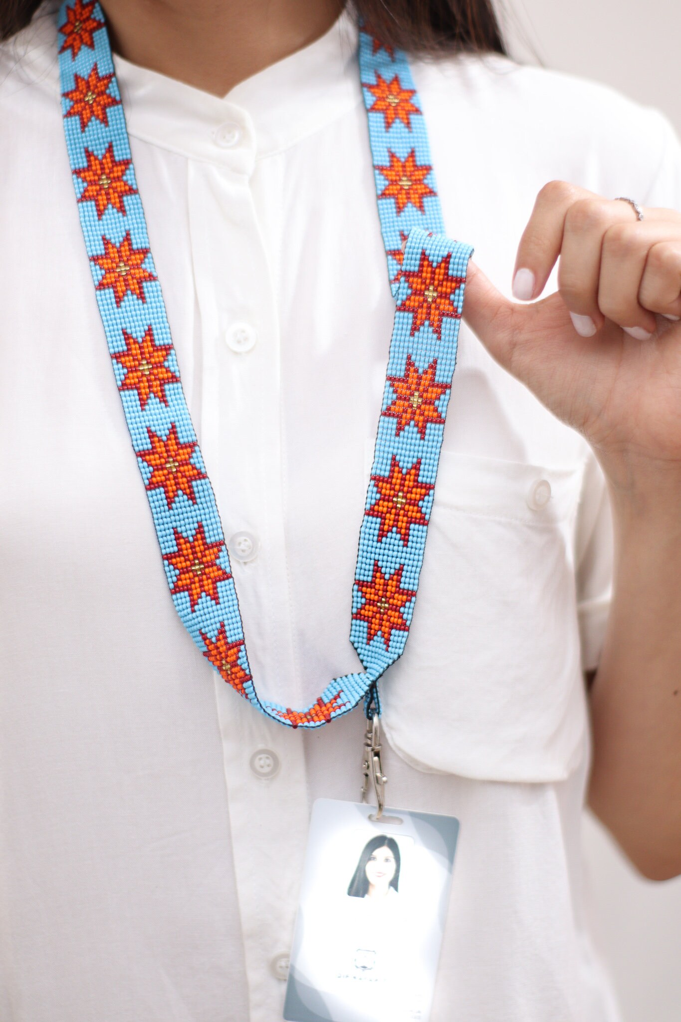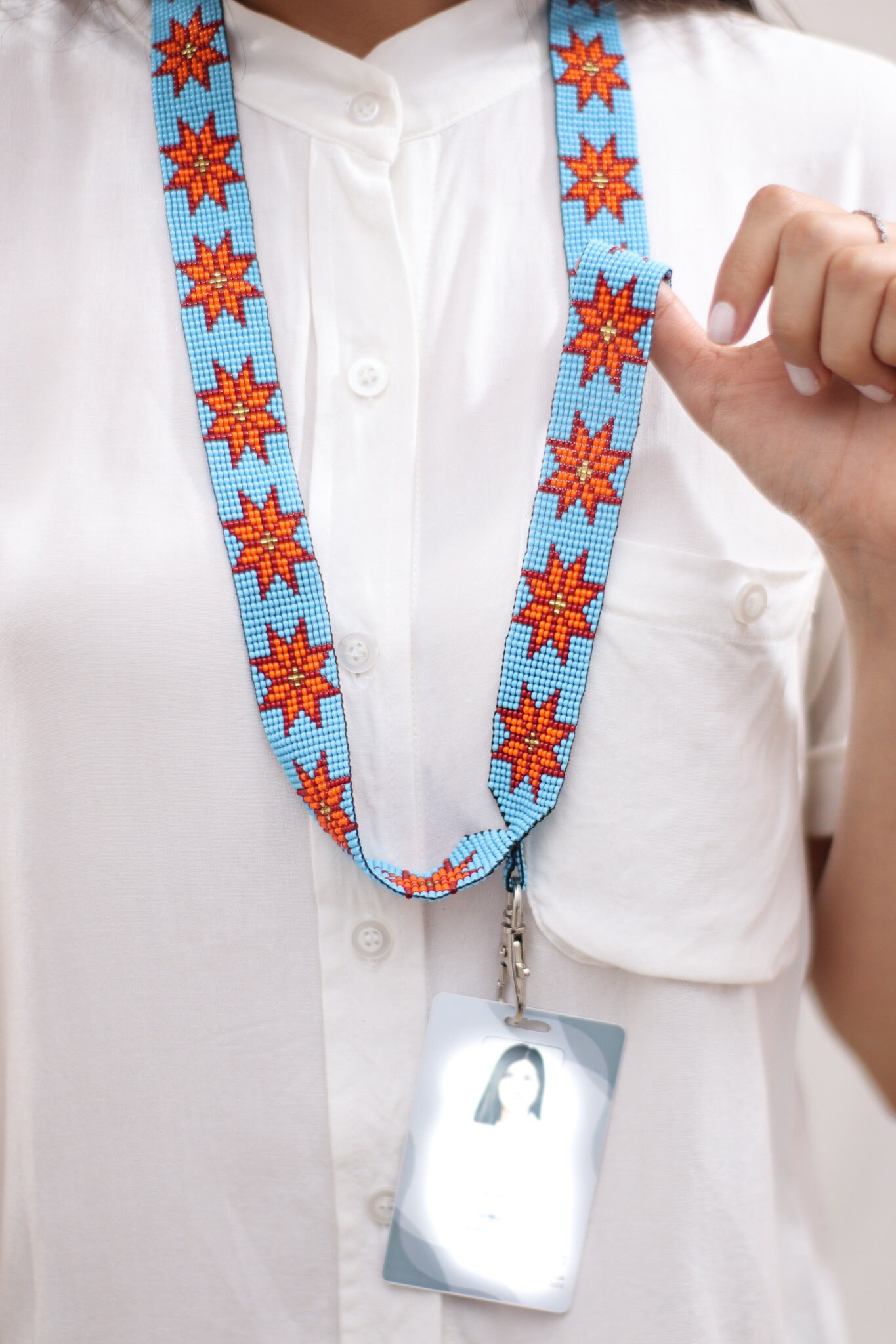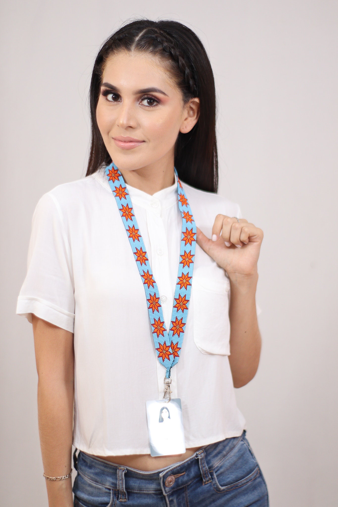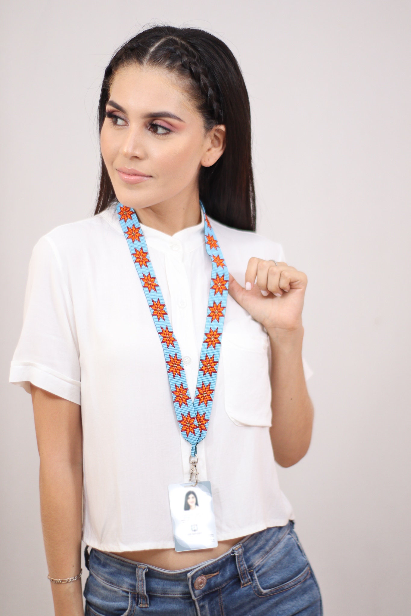 This lanyard features a pullover design, blue base and star/sun pattern. Sturdy handloomed construction ensures longevity and the colors are sure to add a nice "pop" to your attire. Suitable for all genders and ages.
