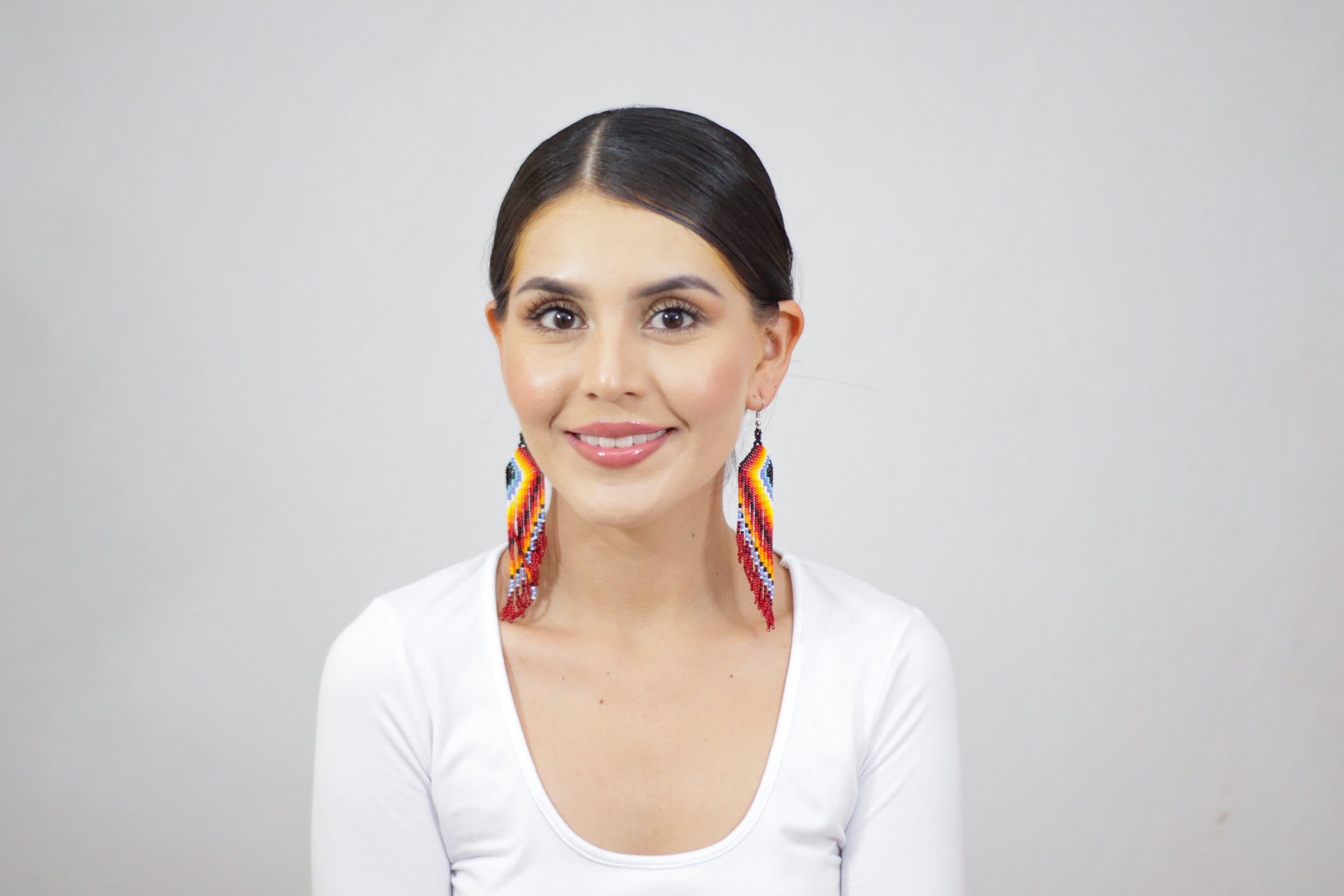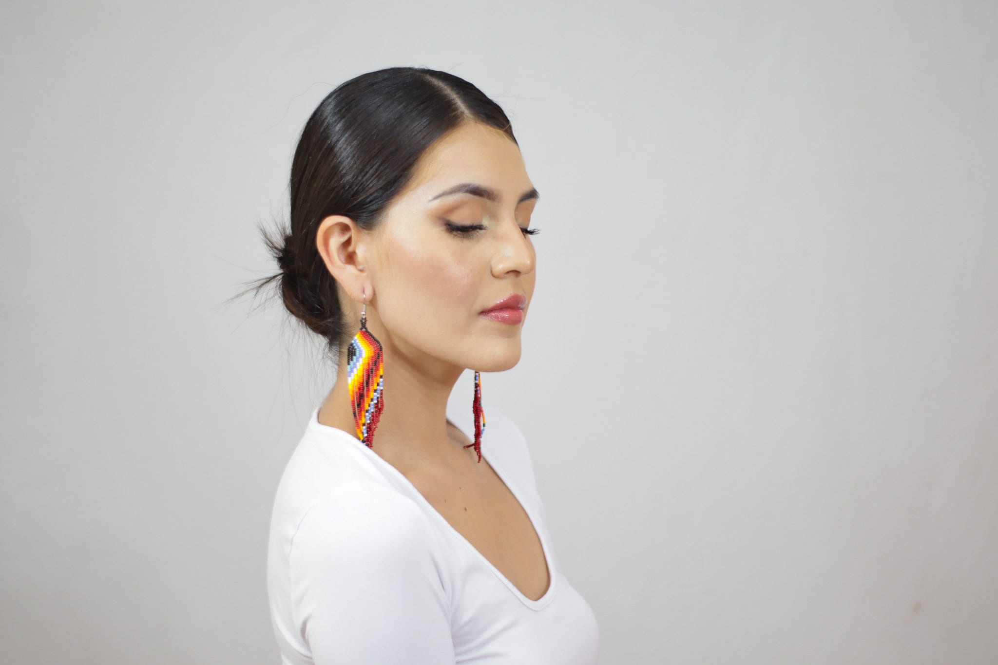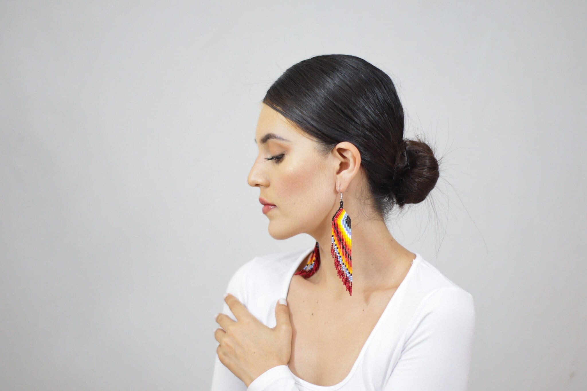 - These feather-inspired beaded earrings feature a beautiful color sequence included red, yellow and orange and have black and violet accents to contrast. The dangles sequentially go from short to long, giving an attractive and exotic effect.