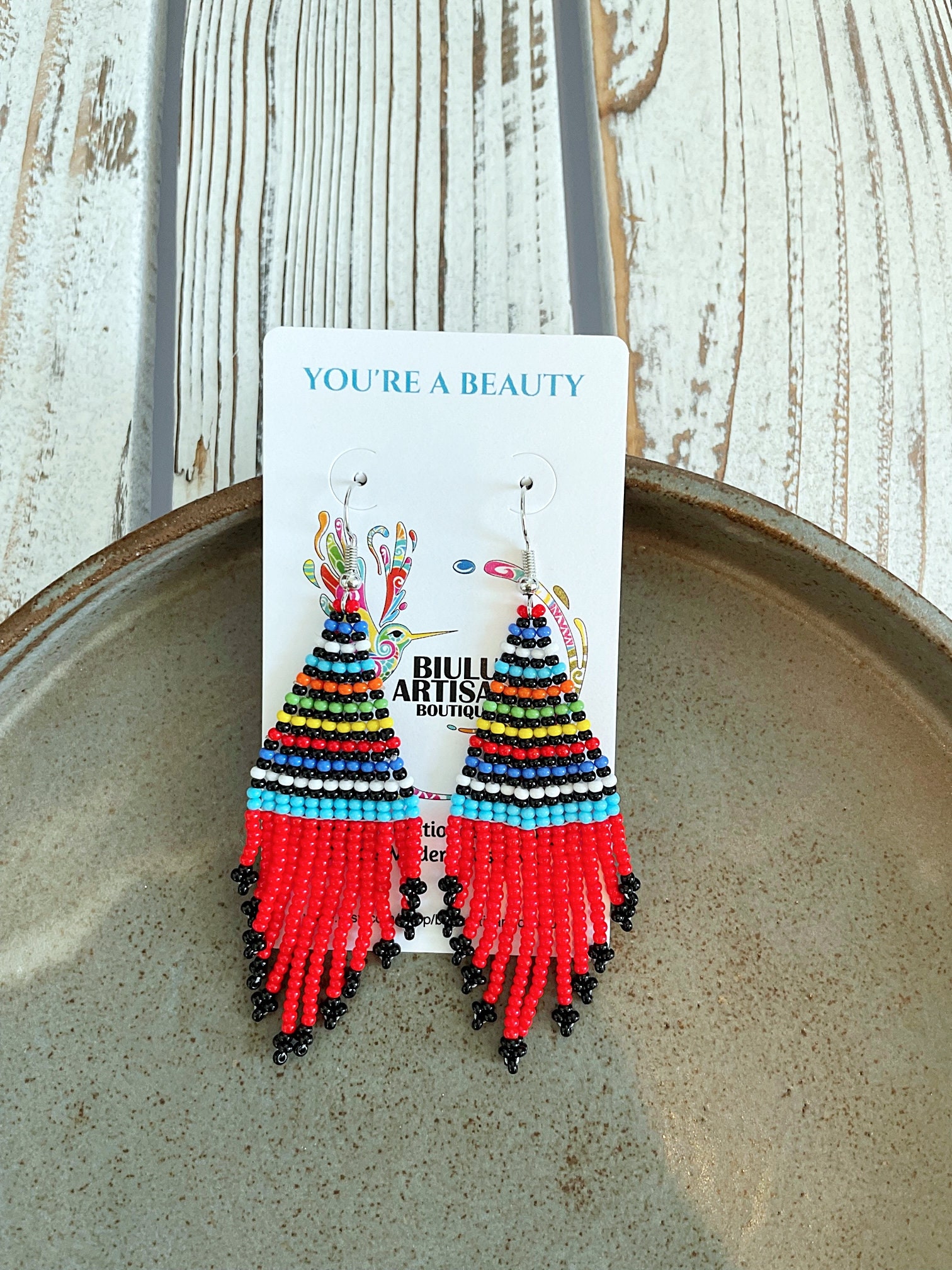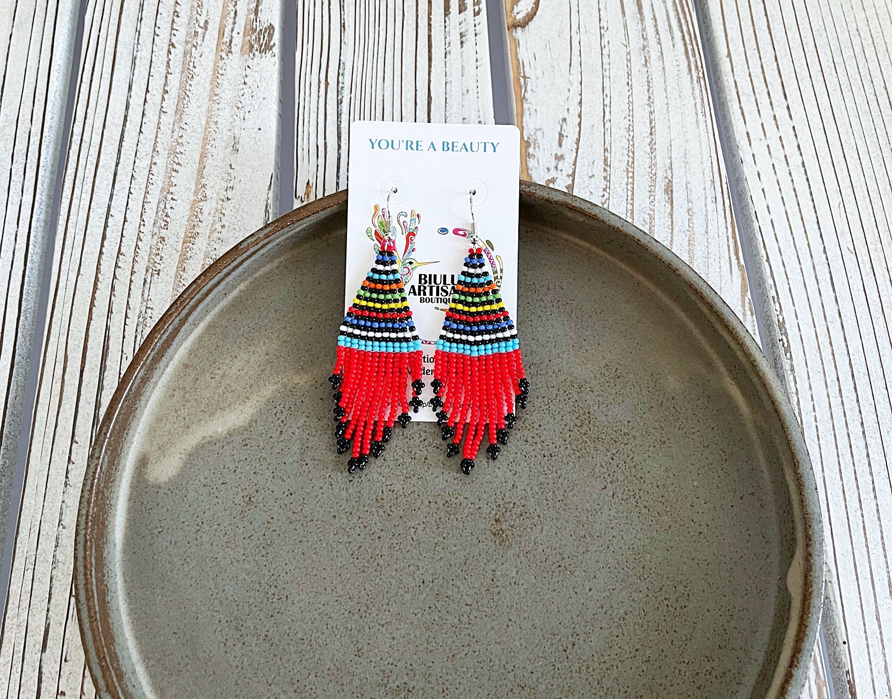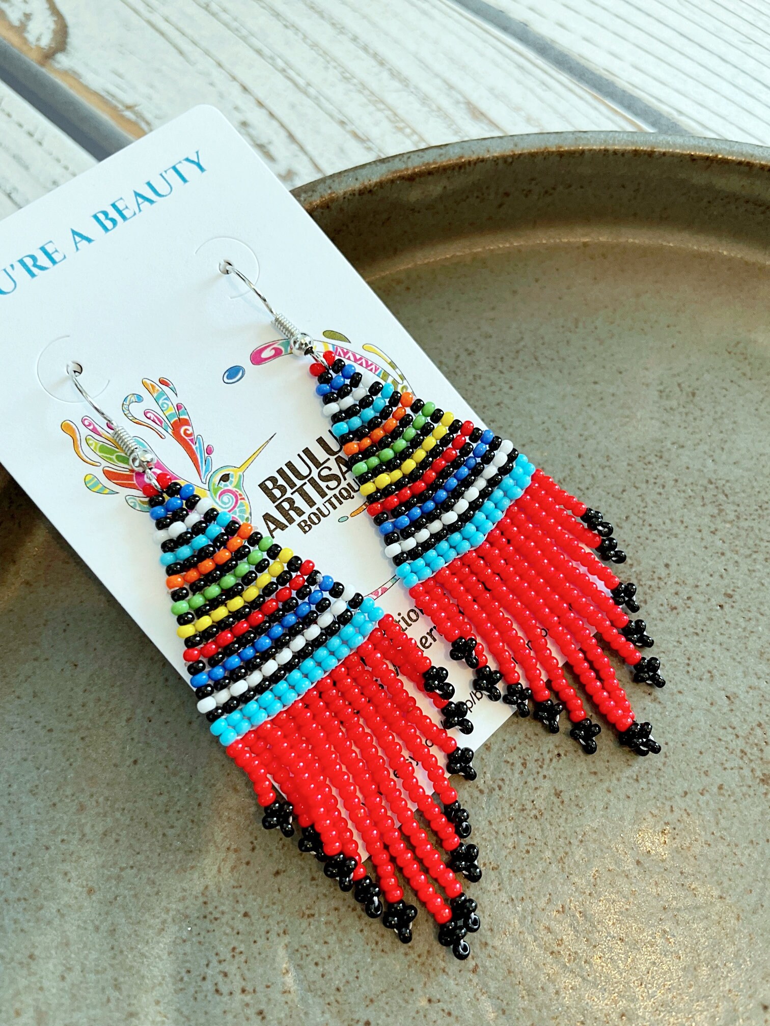 These beautiful contemporary Native/boho style earrings feature a colorful contrasting striped pattern with a splash of bright red in the dangles. These are a great option for anyone not looking for overly long dangles - dainty yet with tons of character.
