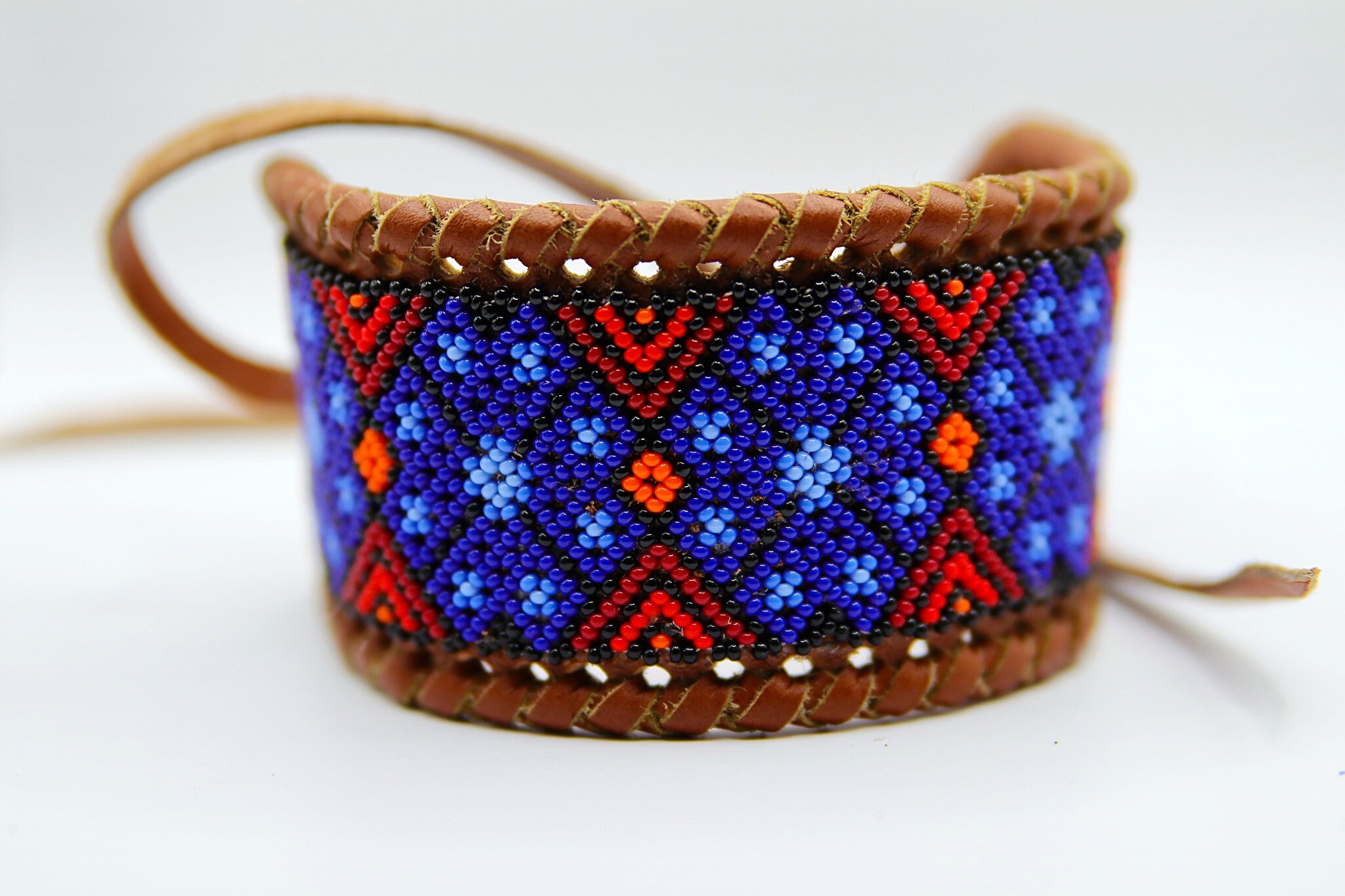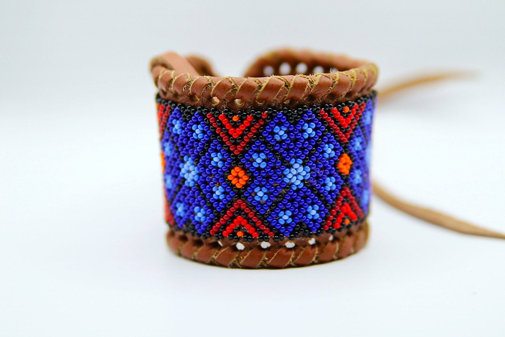This 100% handmade bracelet starts with a thick, premium quality leather band (brown) which has decorative braided edges. The beadwork is then made with a traditional hand loom and securely stitched in place for seamless contact. The art features a blue peyote pattern. The bracelet is secured by leather ties.