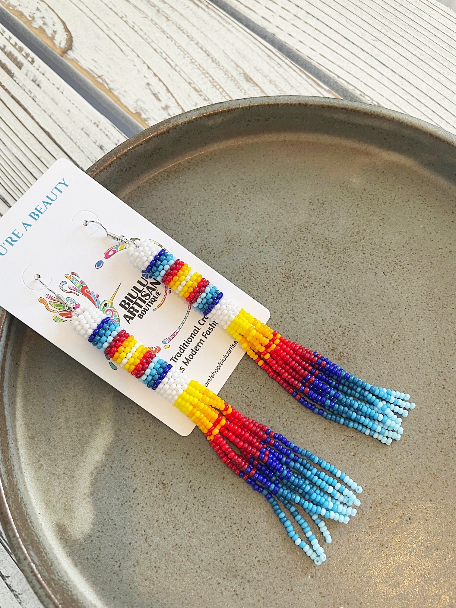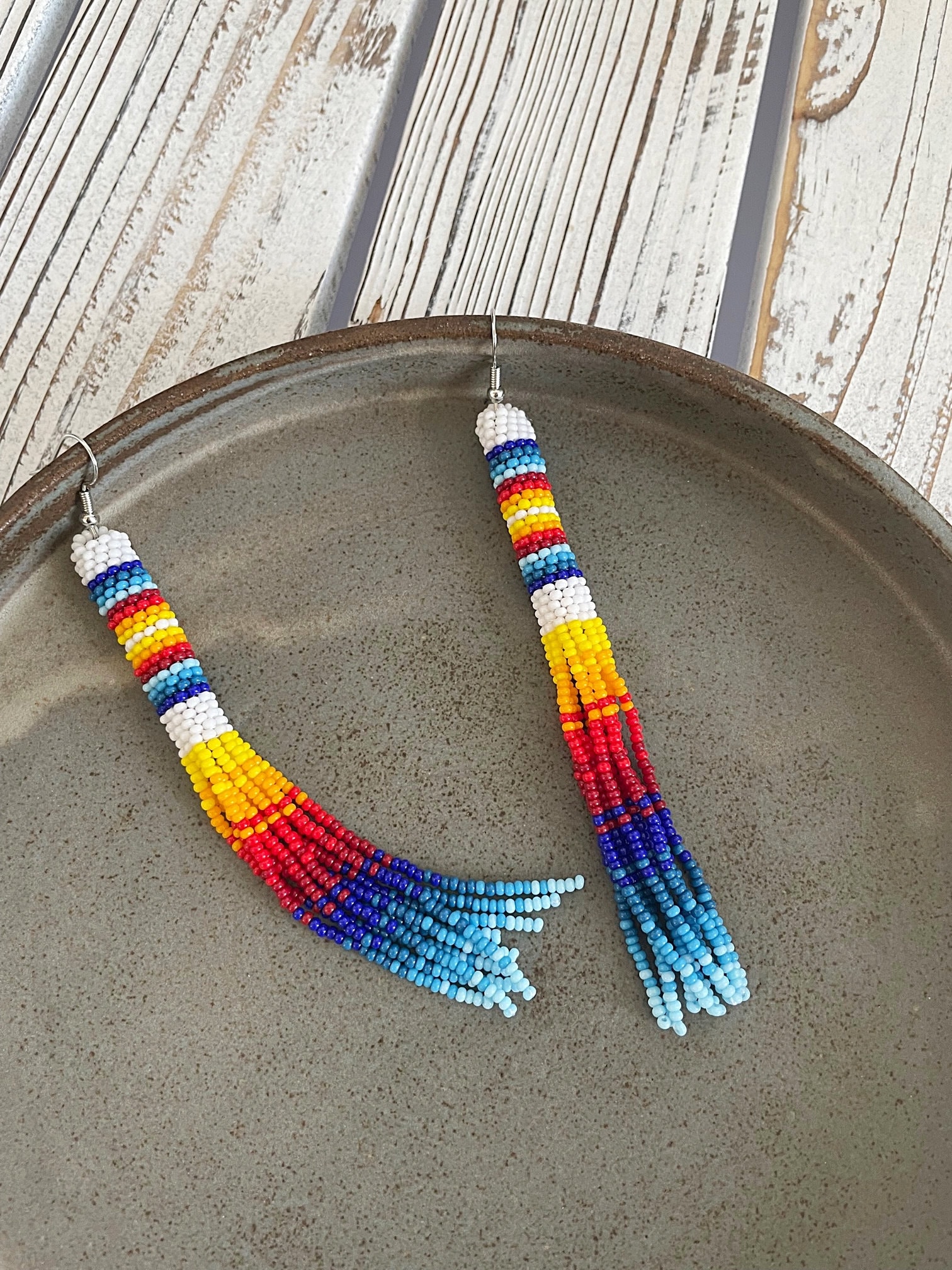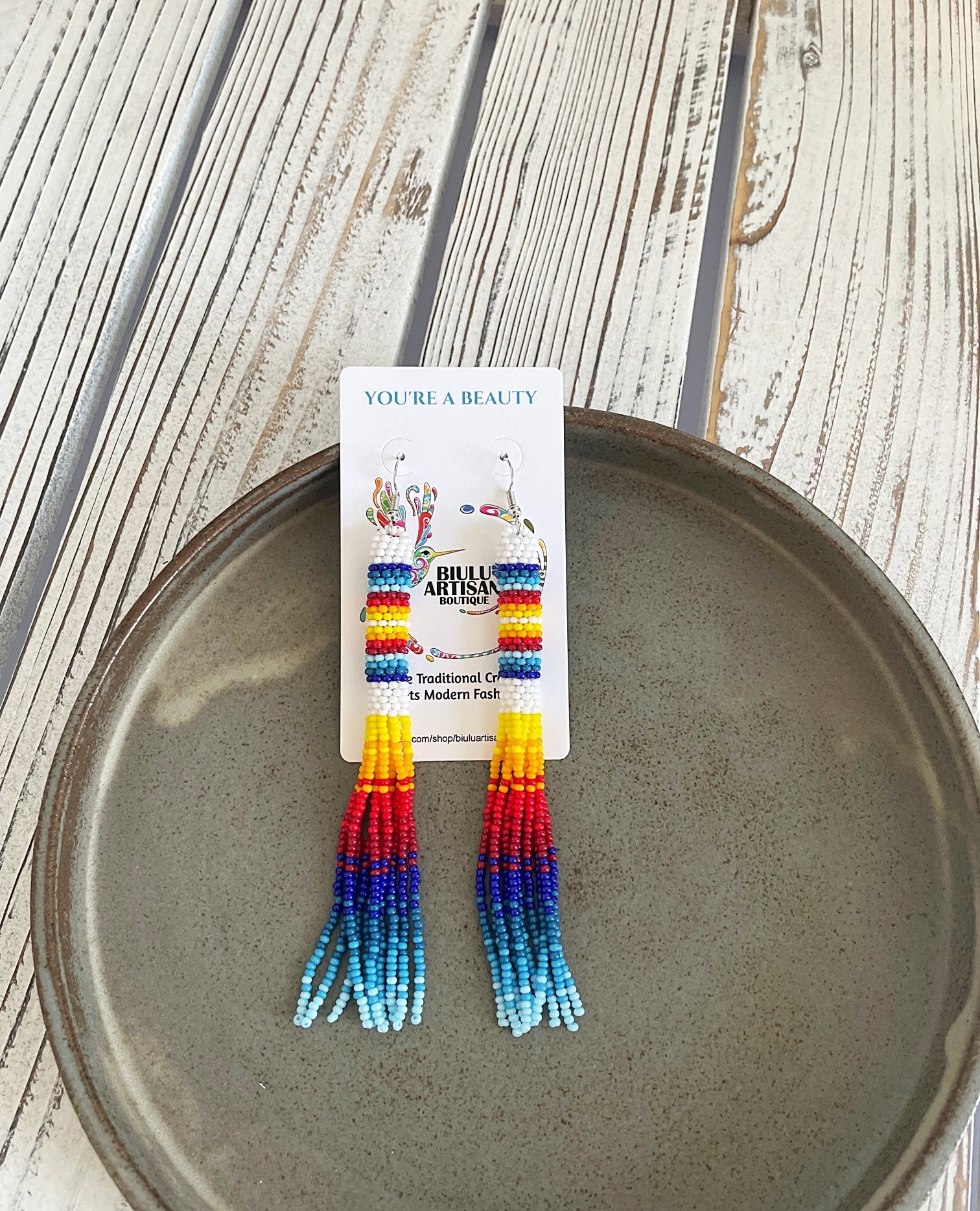 A standout look and a lightweight feel. Long, thin-bodied tube earrings featuring a white base with contrasting colors.