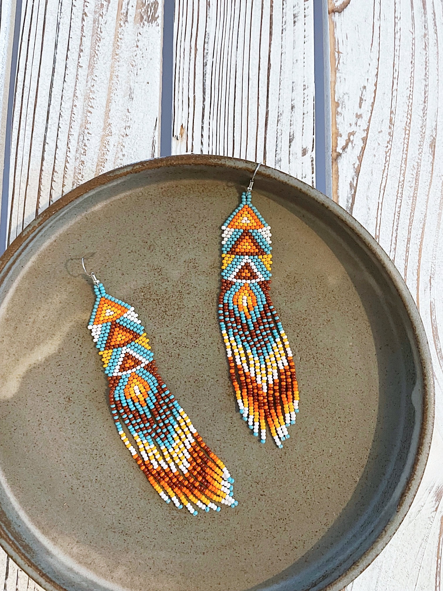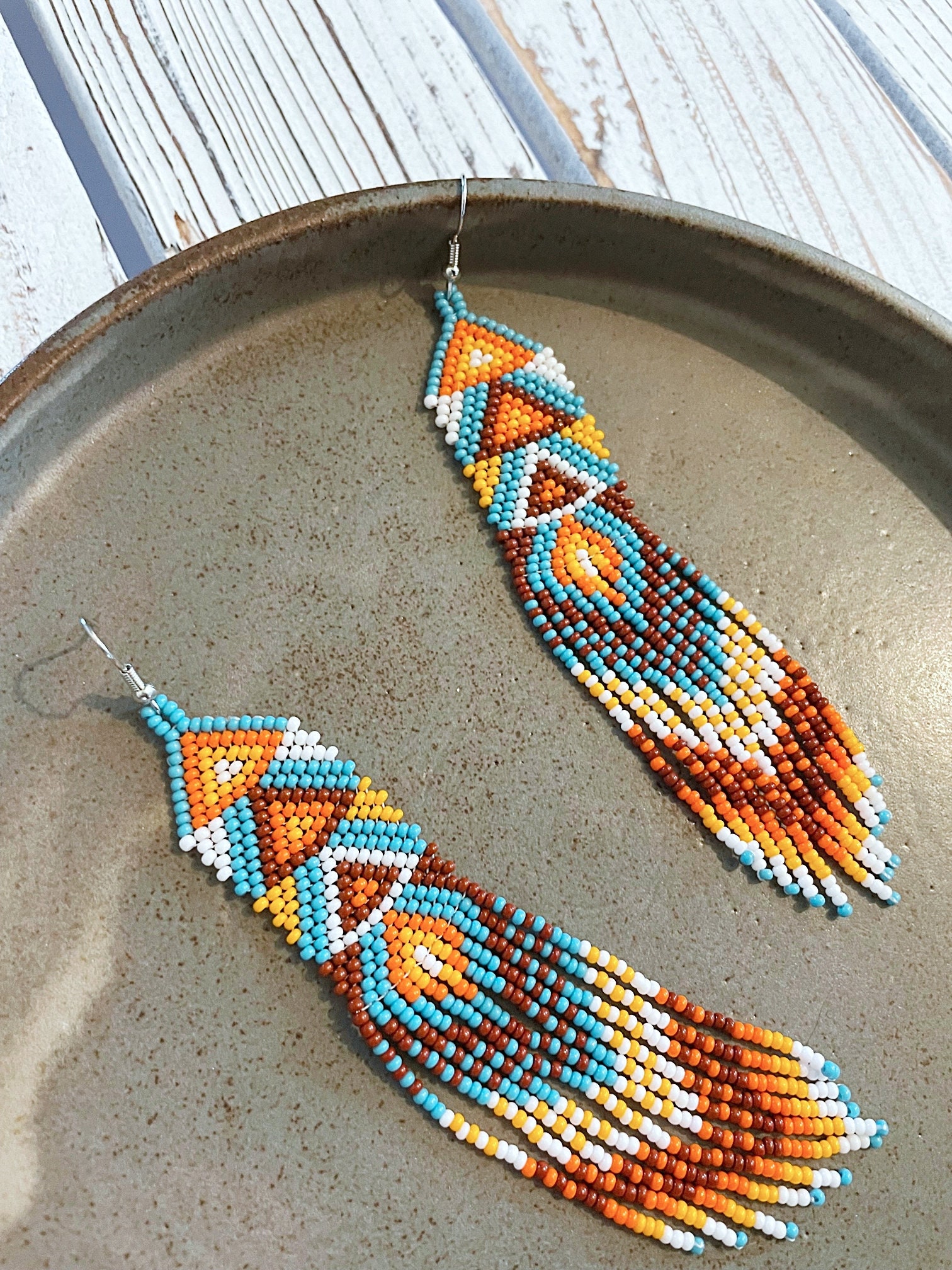 - Exotic long dangling earrings with a geometric pattern.
