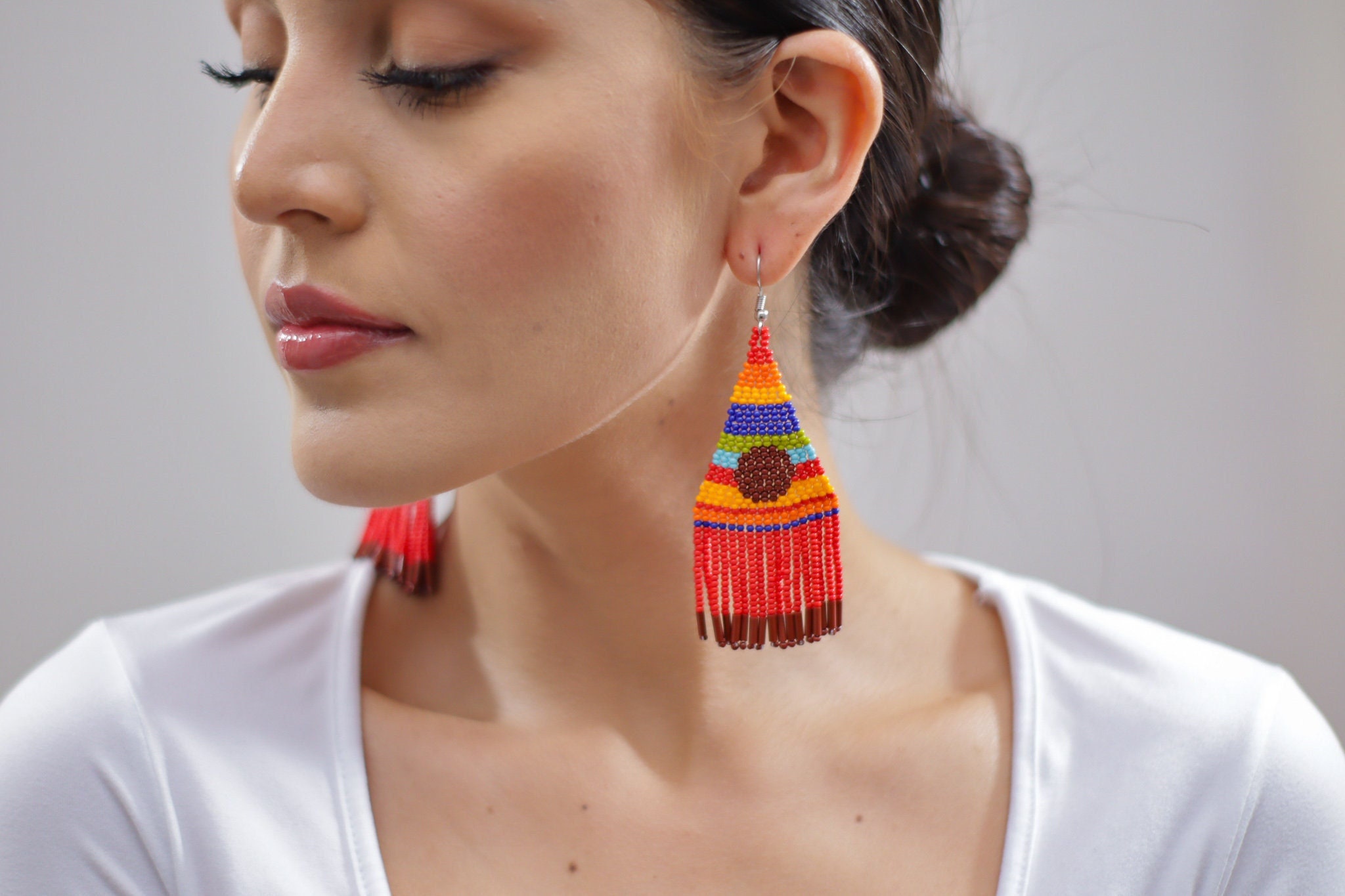 These beaded bohemian beauties feature a vintage-style striped pattern featuring a red base with vibrant and earthy accents. Their ample size ensure that color will splash down to your jaw line and beyond, giving your daily that special touch.