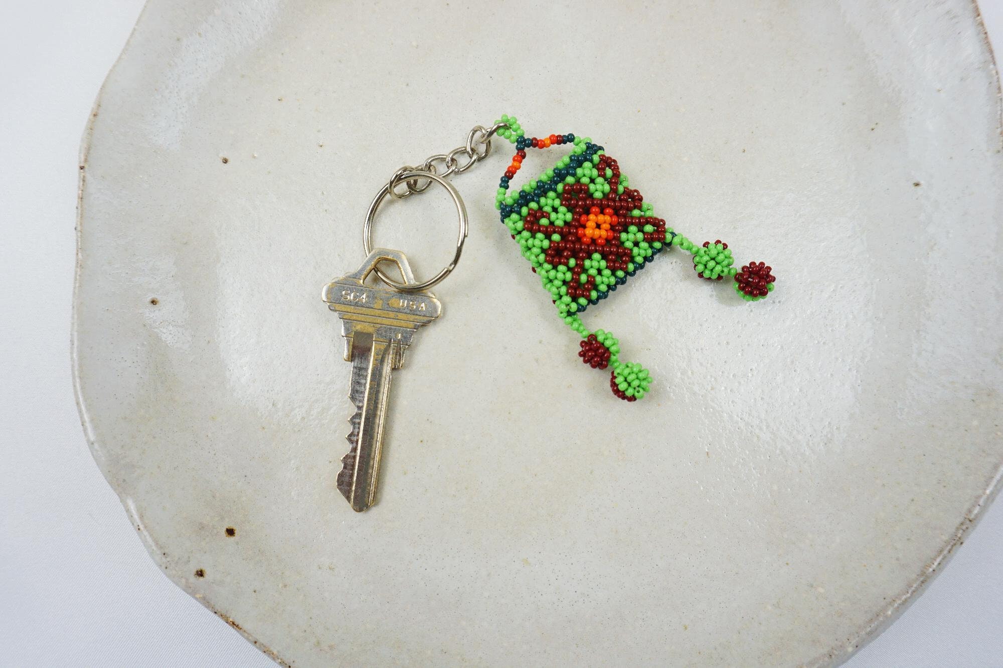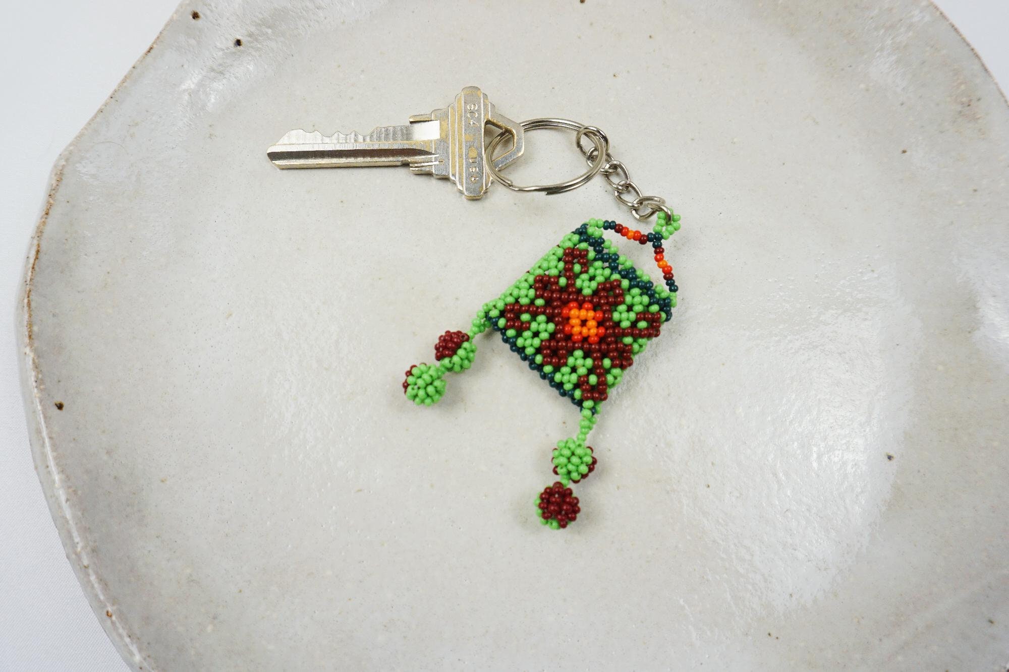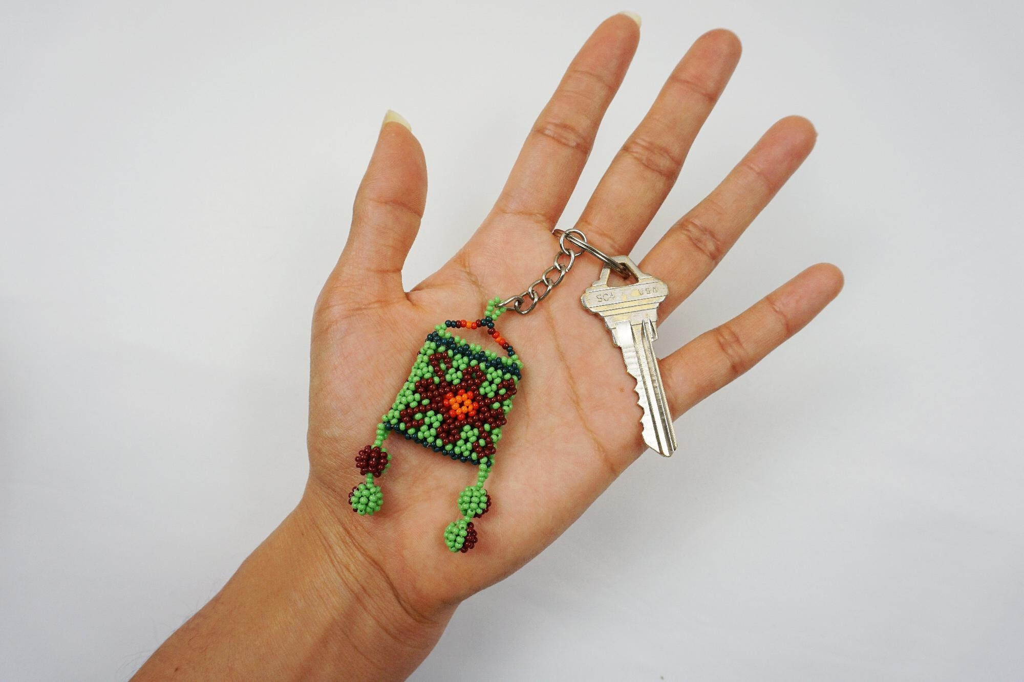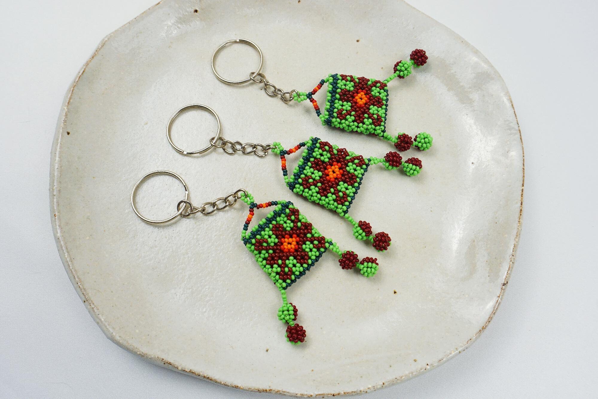 - This colorful, hand-beaded keychain features a small Huichol beaded bag with dangling poms. Suitable for men, women and children.