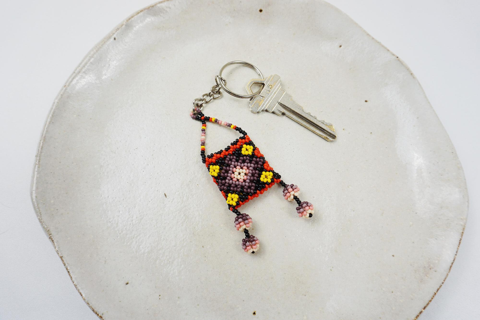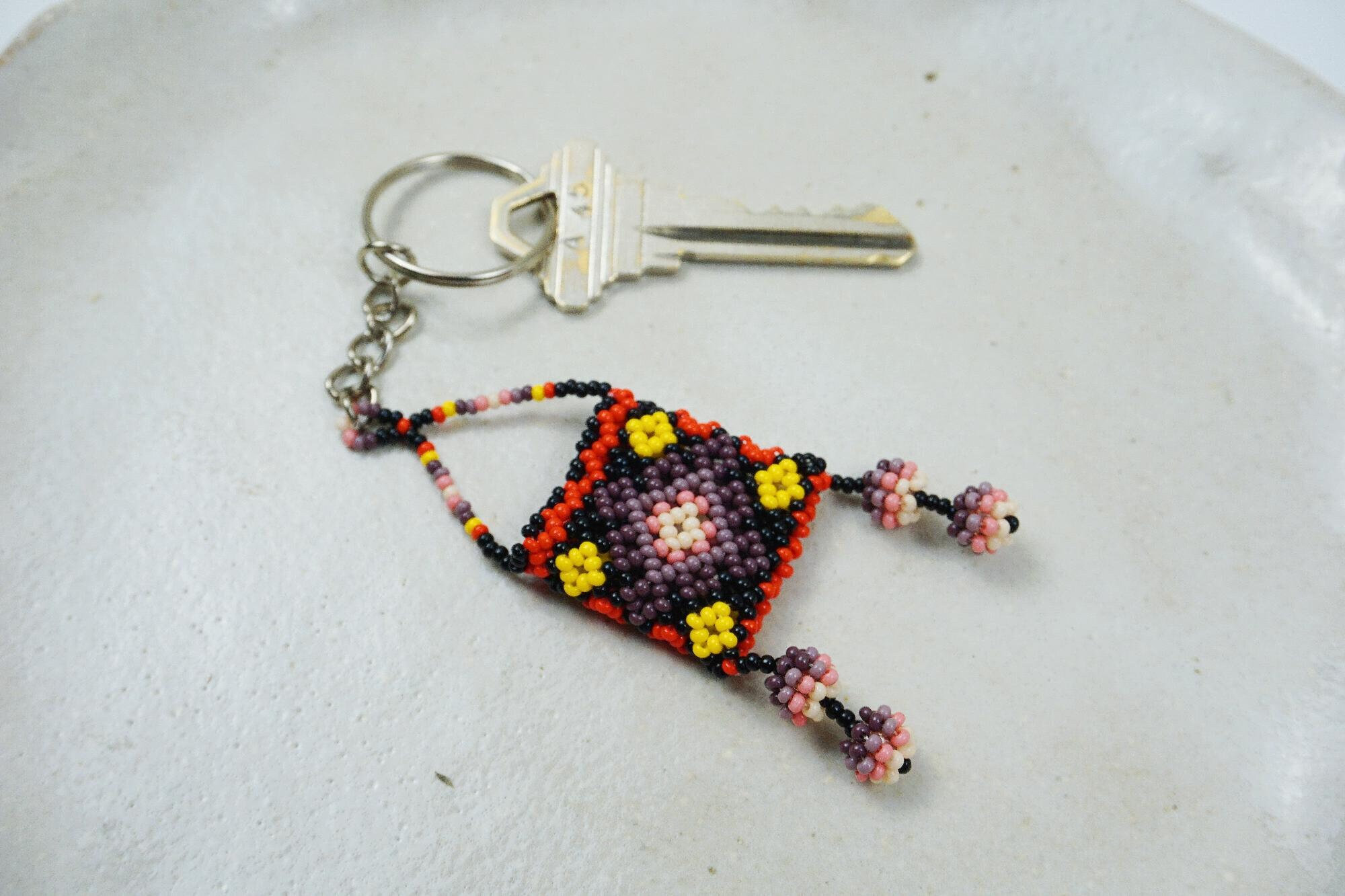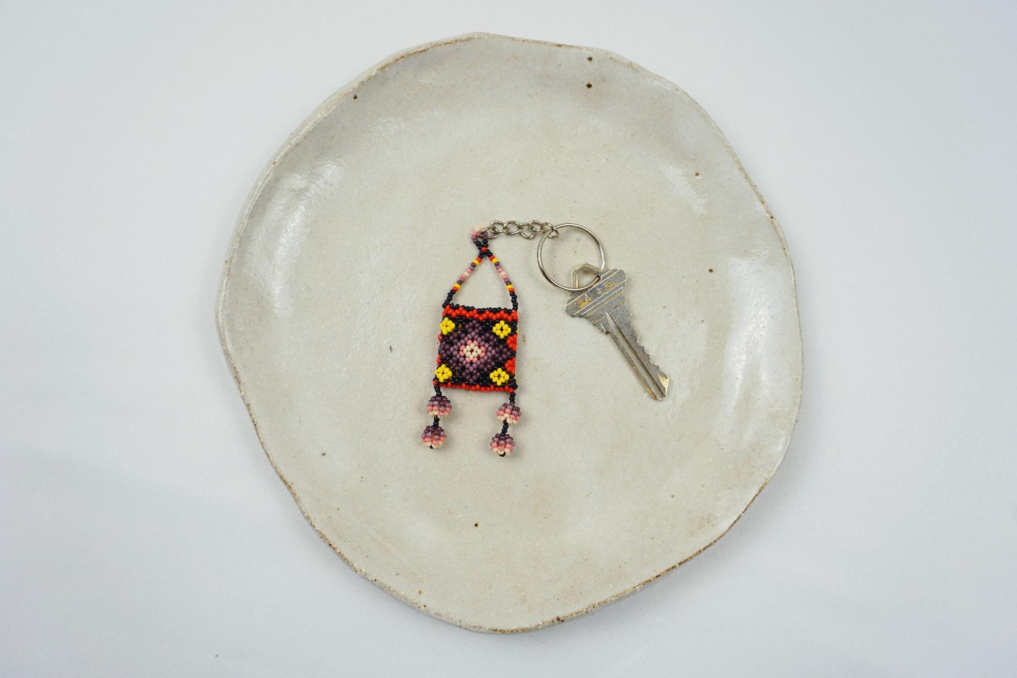 - This colorful, hand-beaded keychain features a small Huichol beaded bag with dangling poms. Suitable for men, women and children.