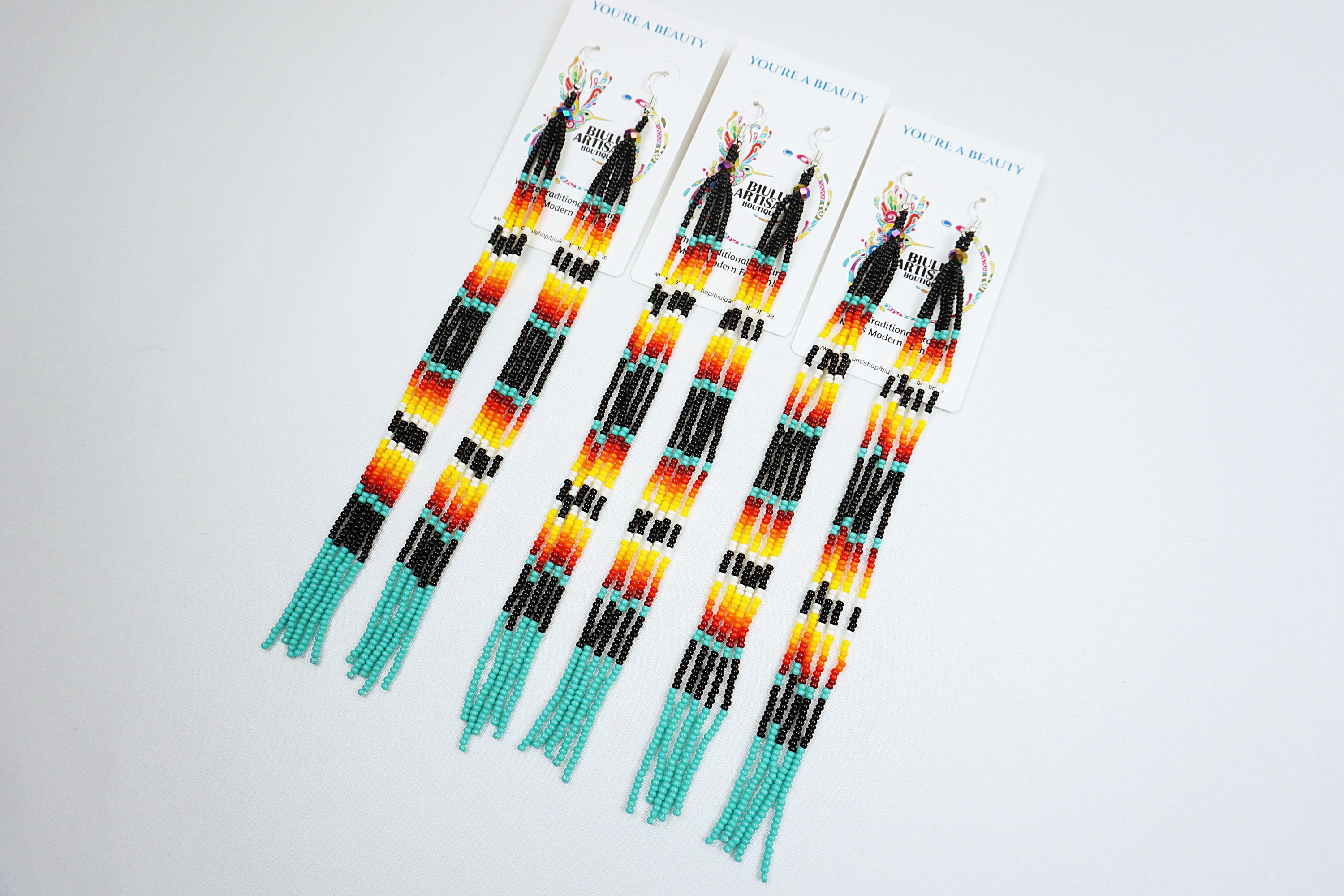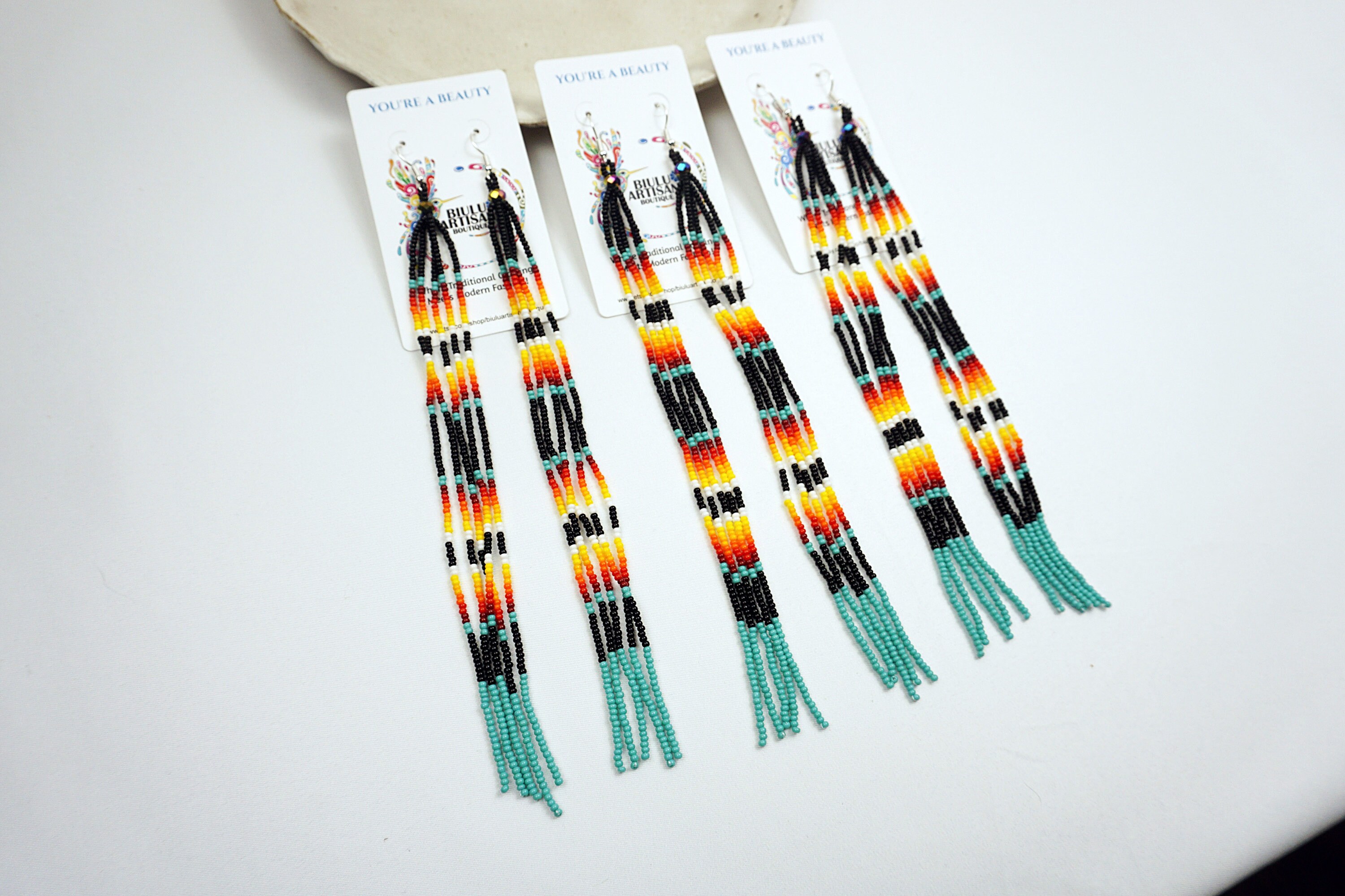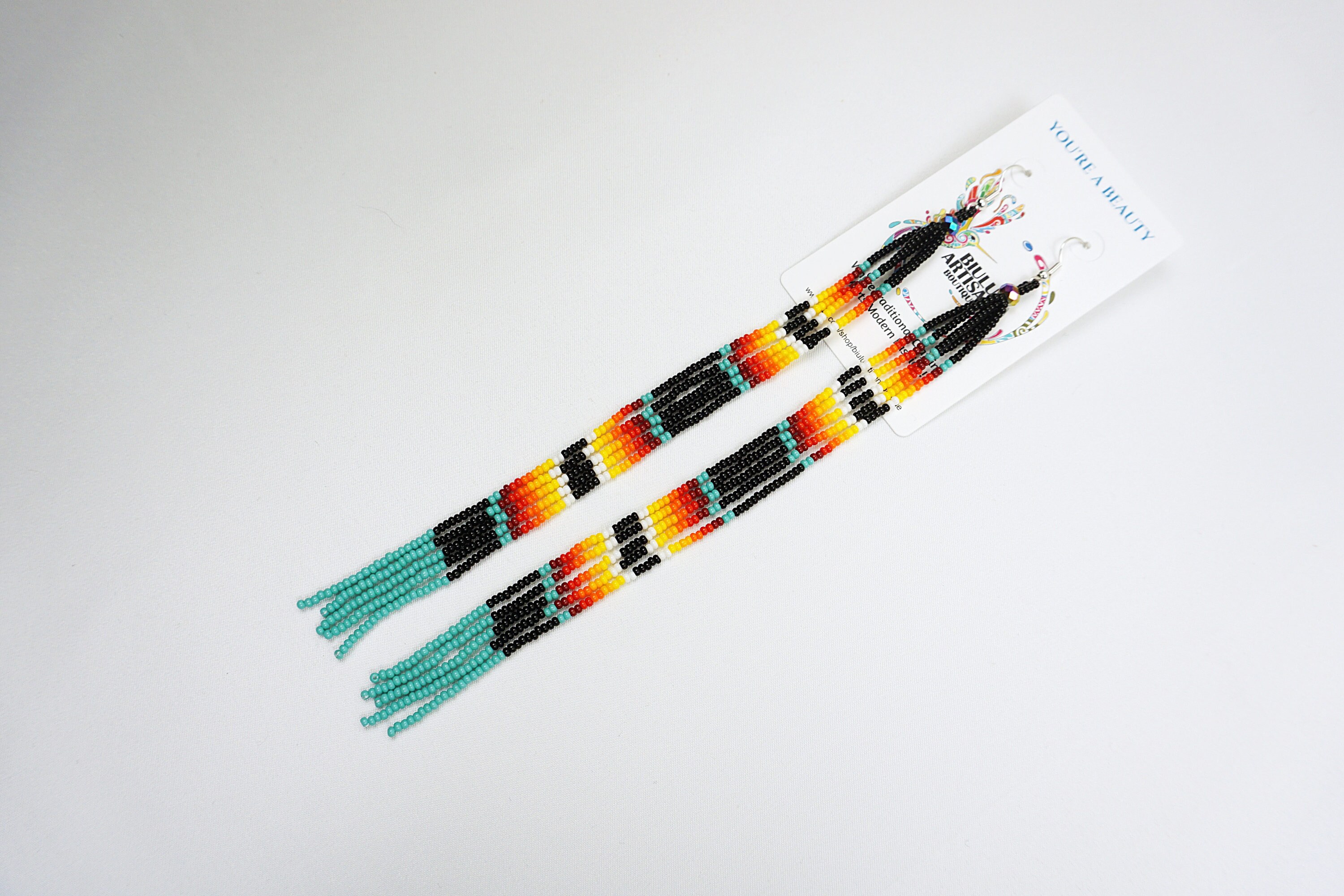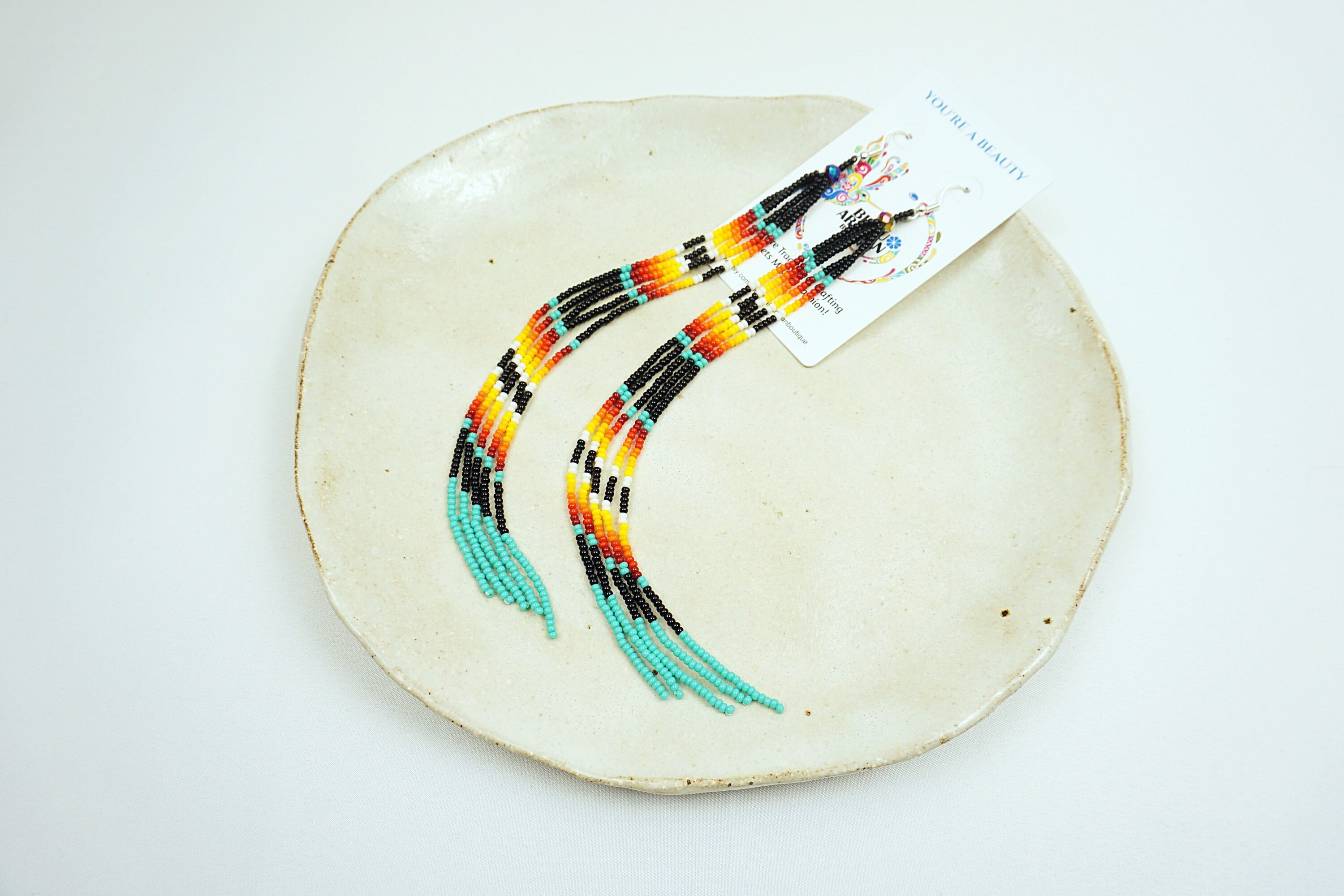 Splash color from your ears to your shoulders with these extra long beaded shoulder duster earrings. Surprisingly lightweight and comfortable, these easy-to-wear earrings are sure to be a daily consideration. The sequential colors feature turquoise, black, shades of red, shades of orange, yellow and white.