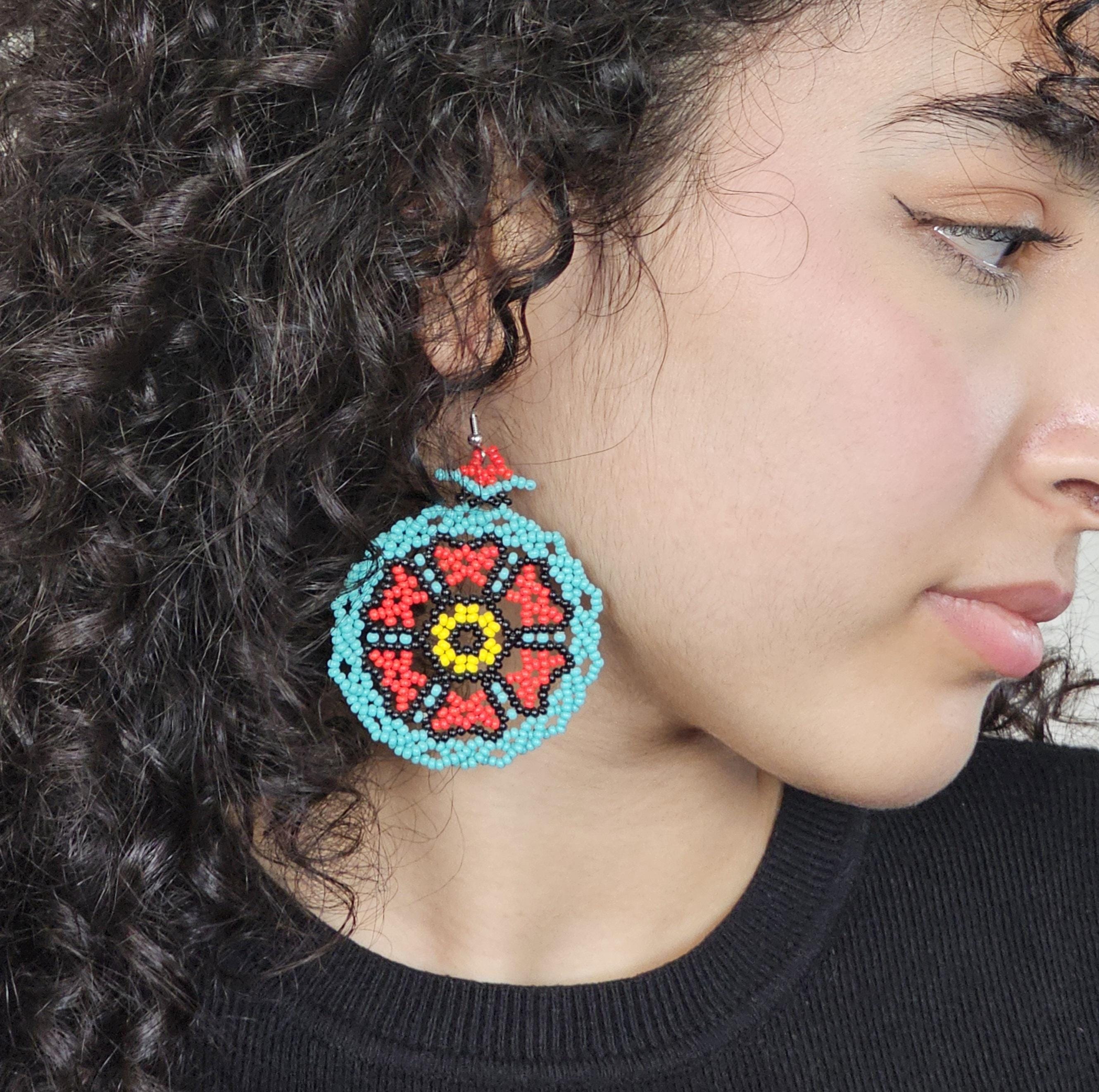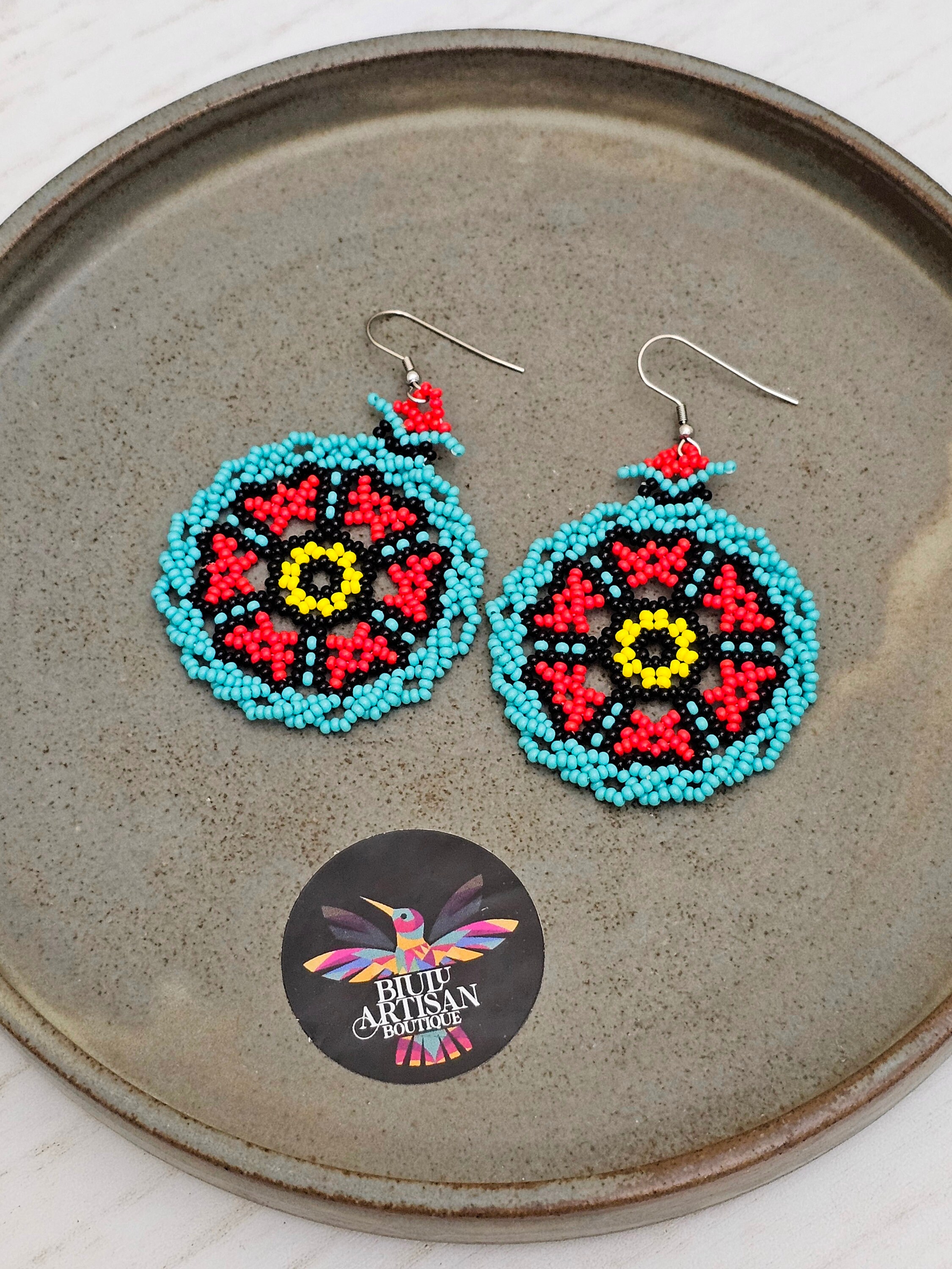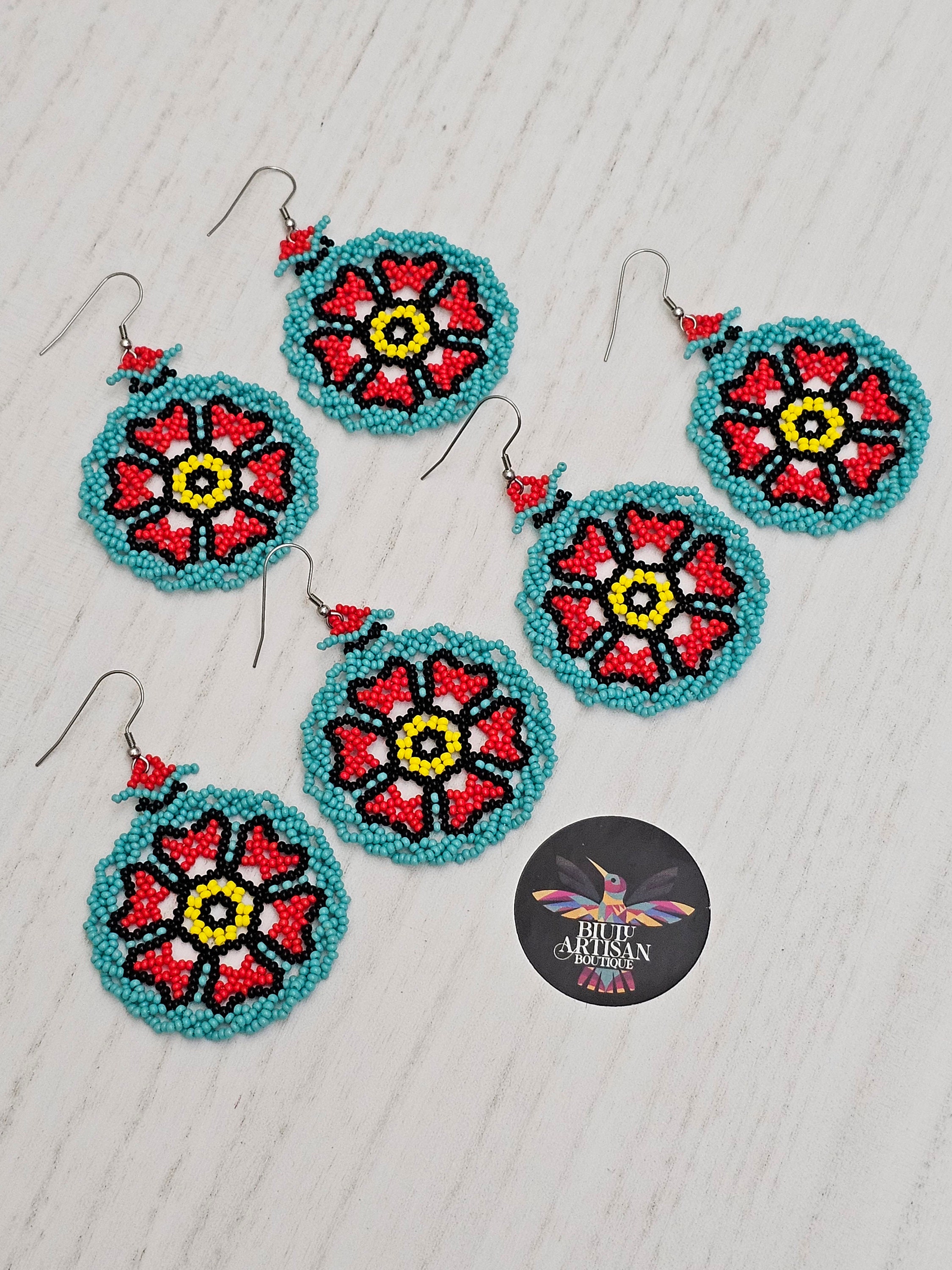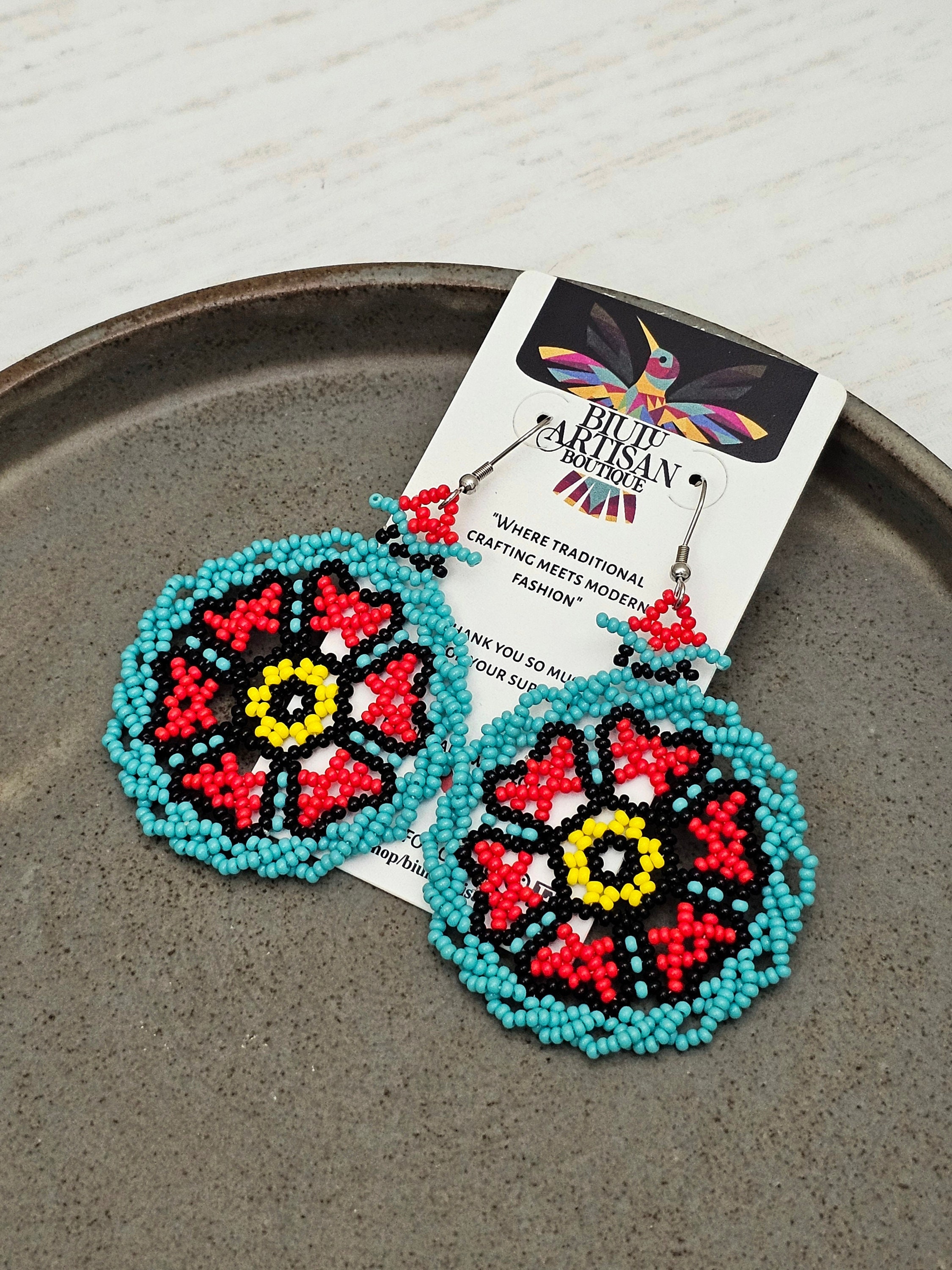 - Beautiful medium/small medallion earrings featuring a flower design in a pop art style.