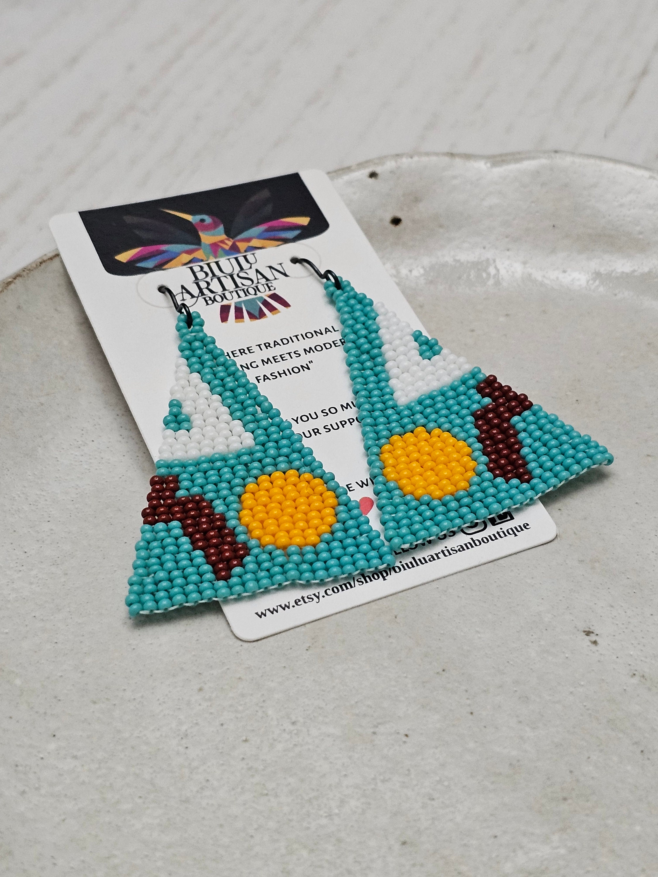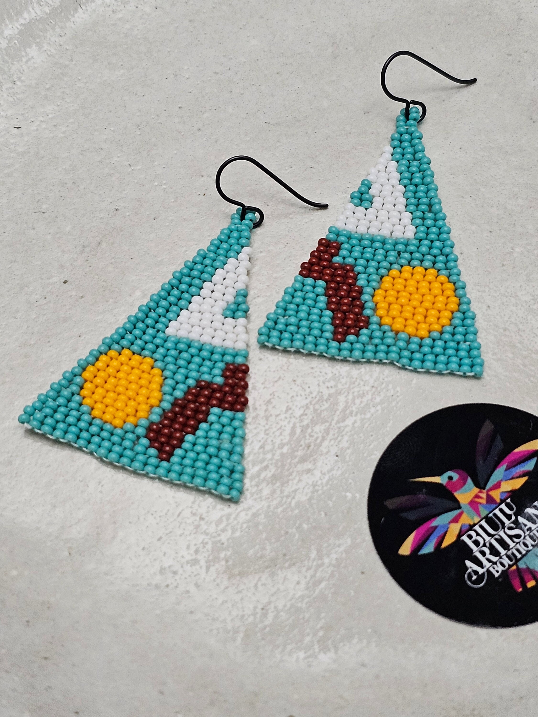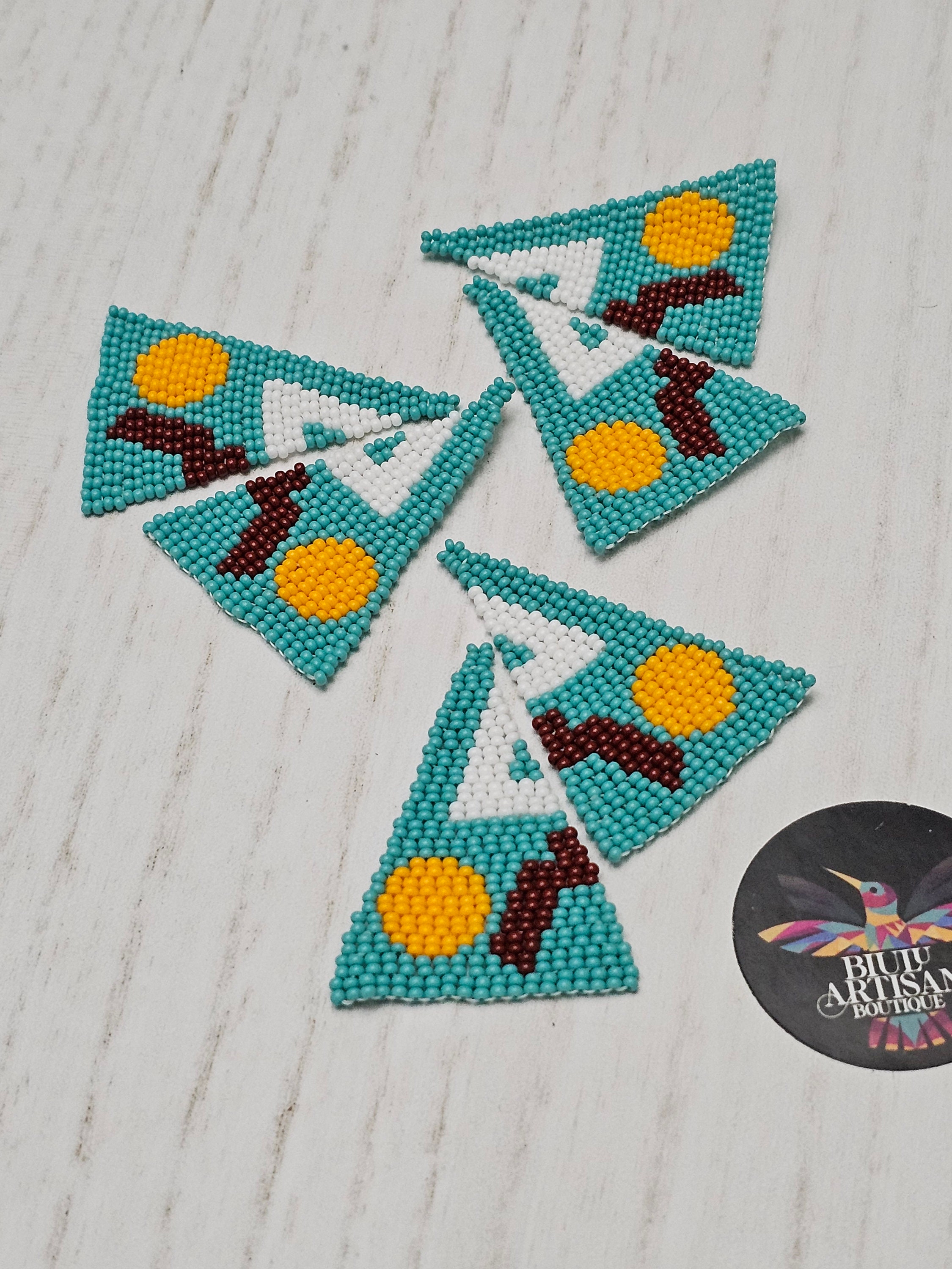 - These modern style beaded earrings feature a violet base with bright geometric patterns. Not overlarge, they'll still provide originality and splashes of color to your attire.