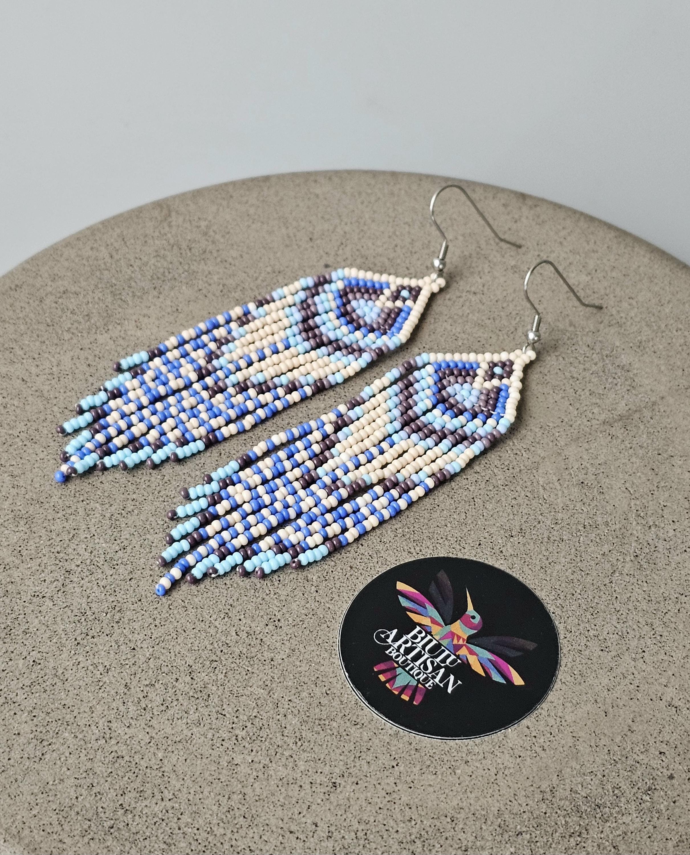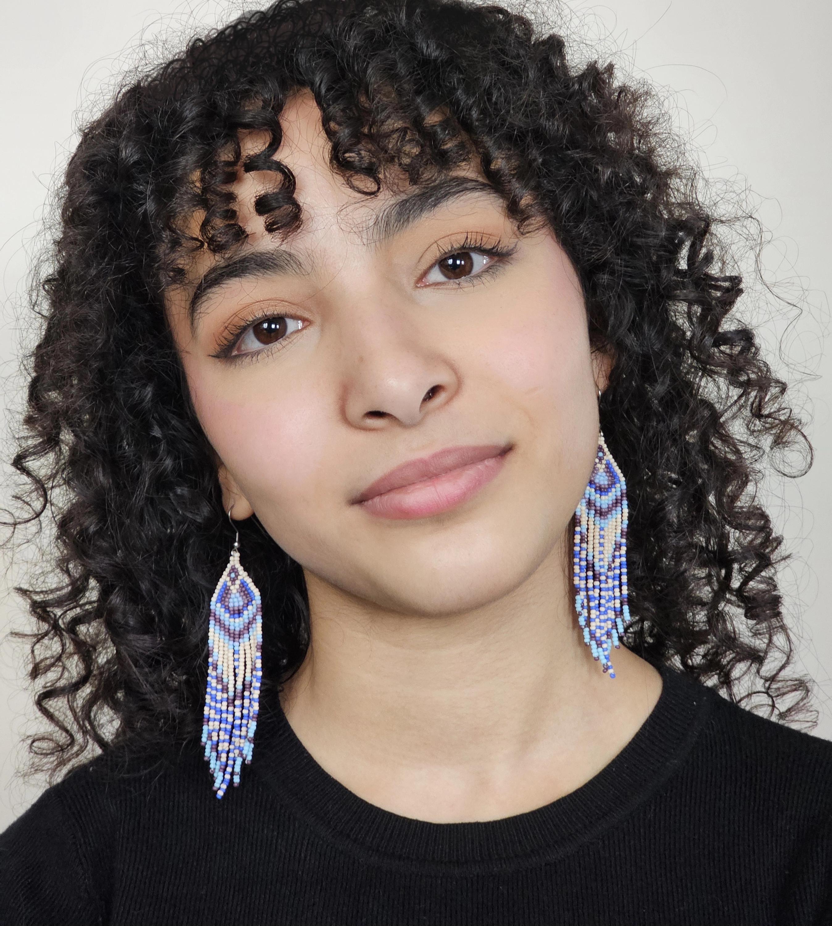These medium length beaded earrings feature different tones of blue and purples with a cream base.