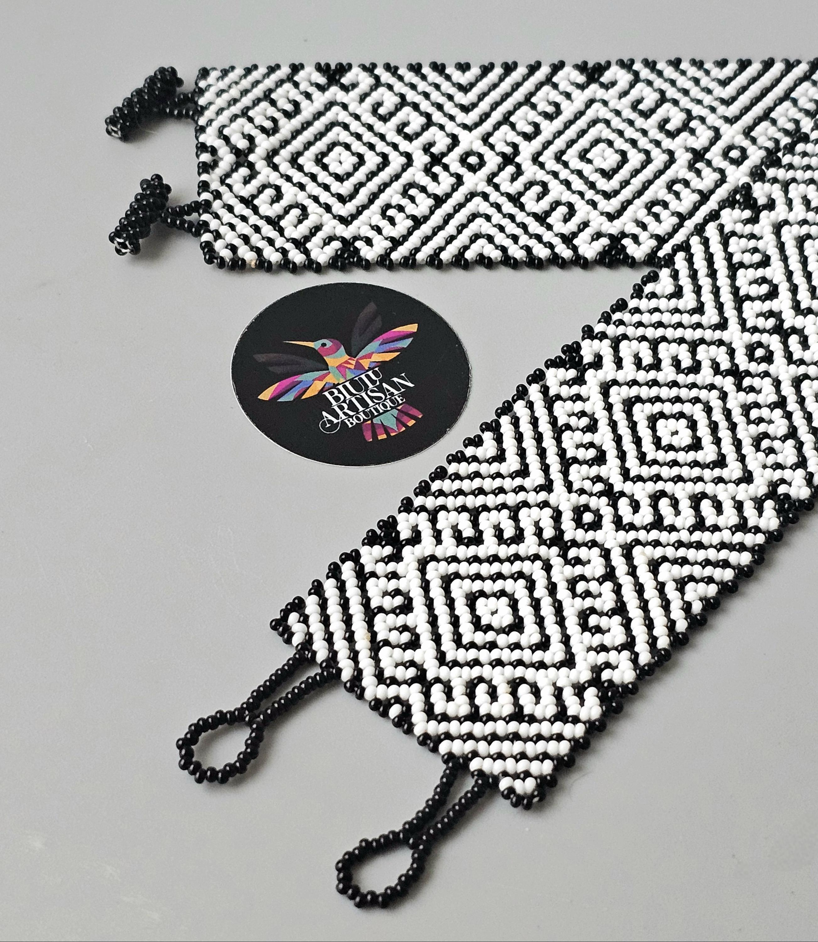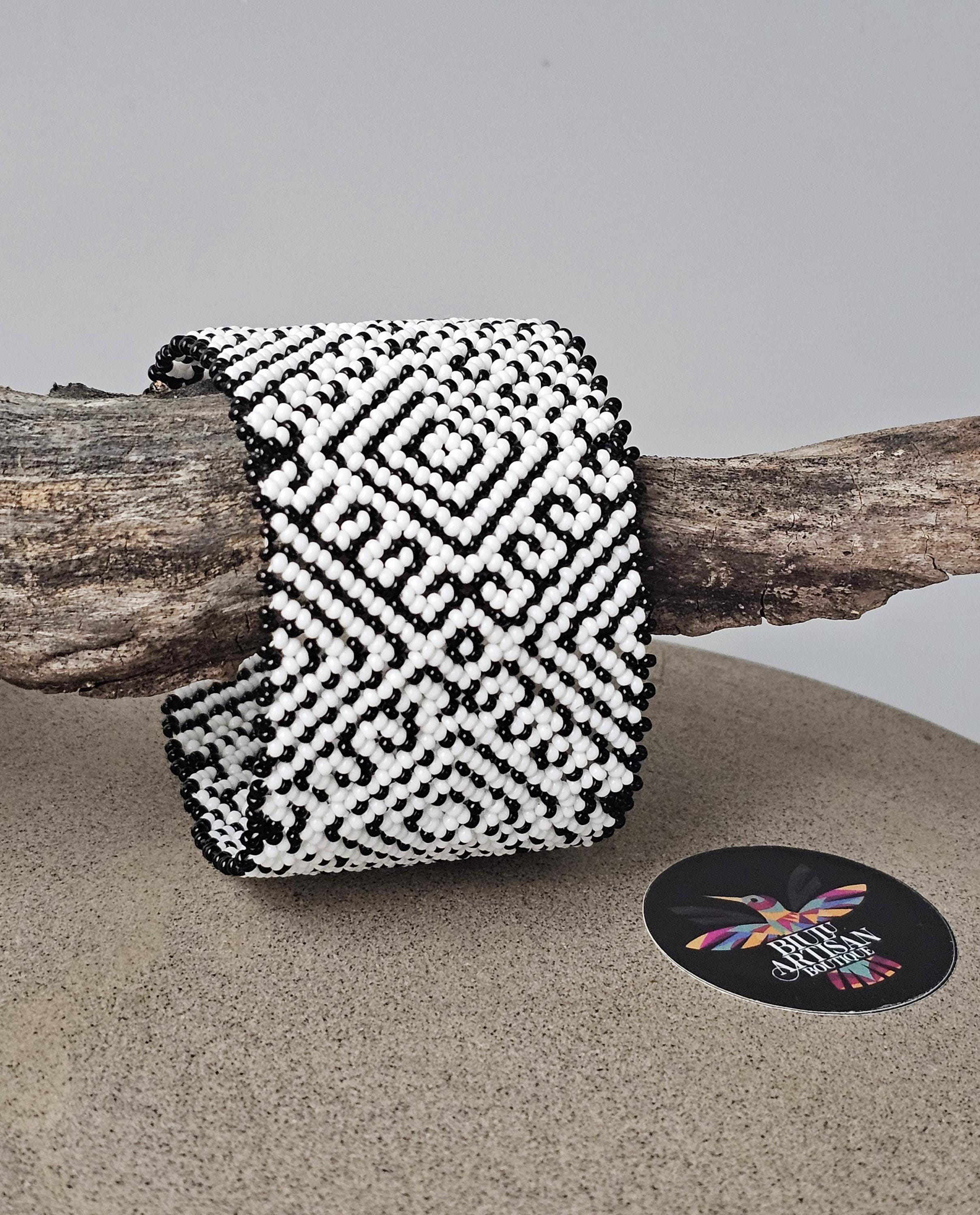- This beaded cuff bracelet features Black and White combination. The band has good width at 1.75" and definitely maintains a solid presence on the wrist.