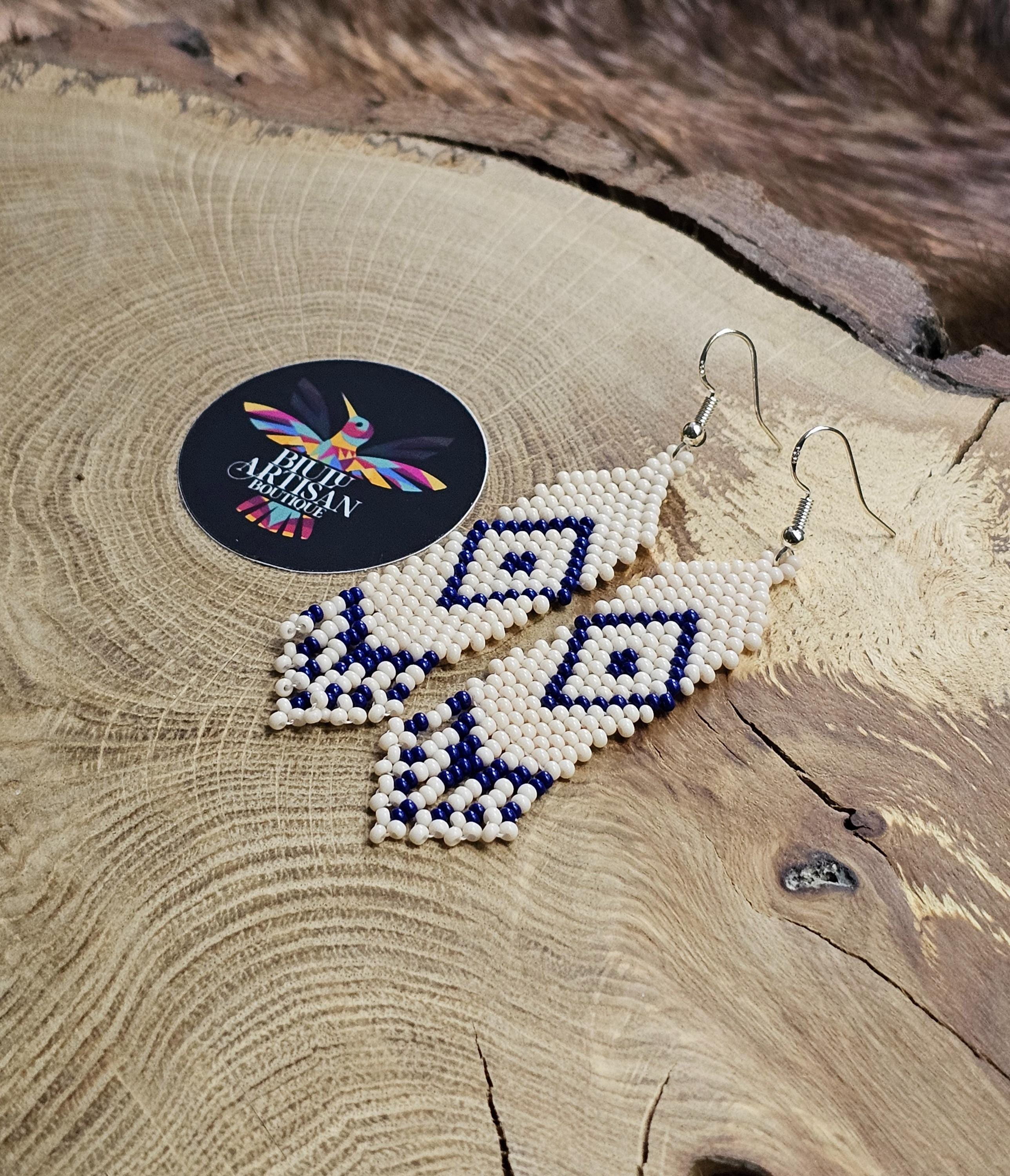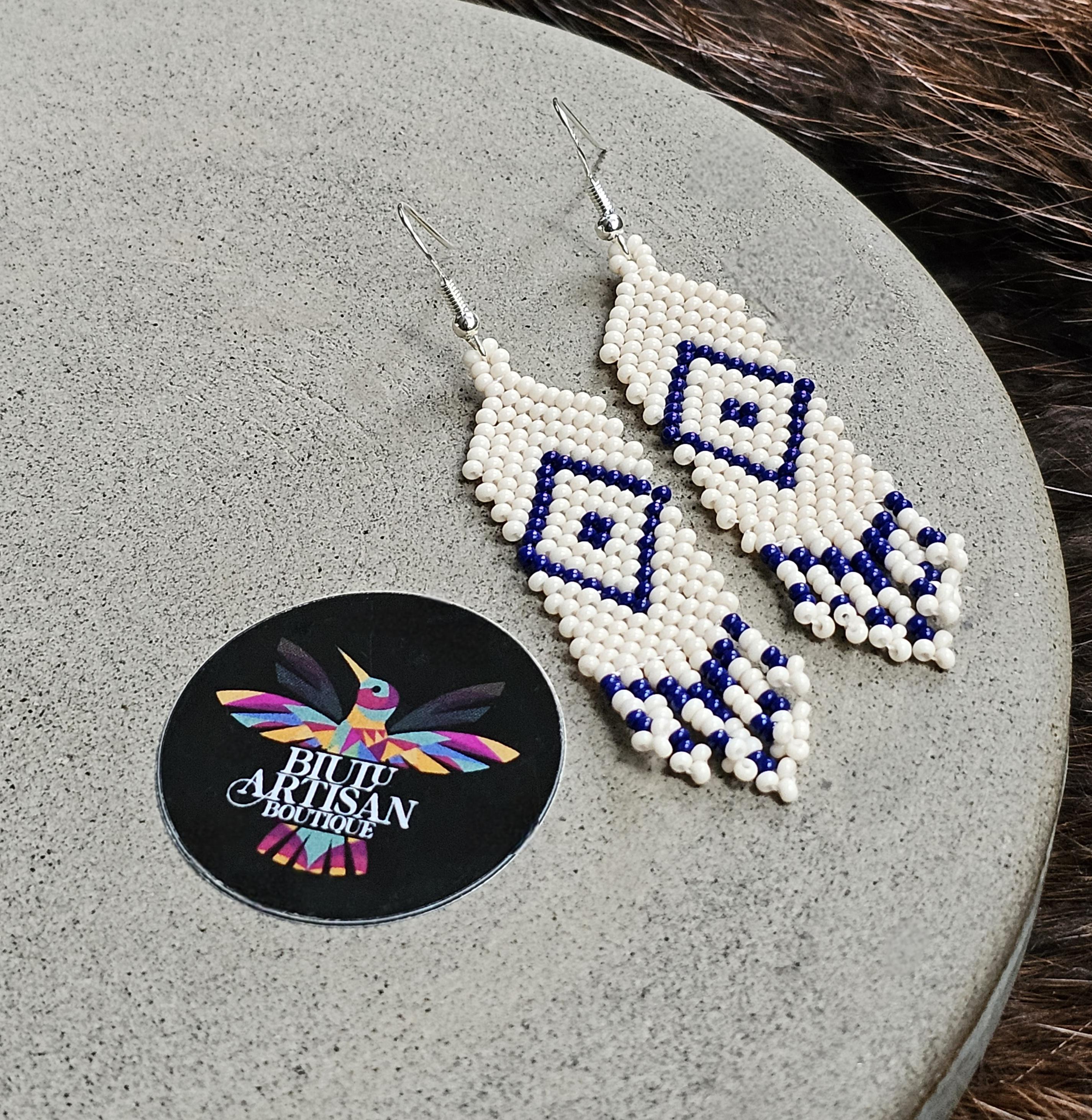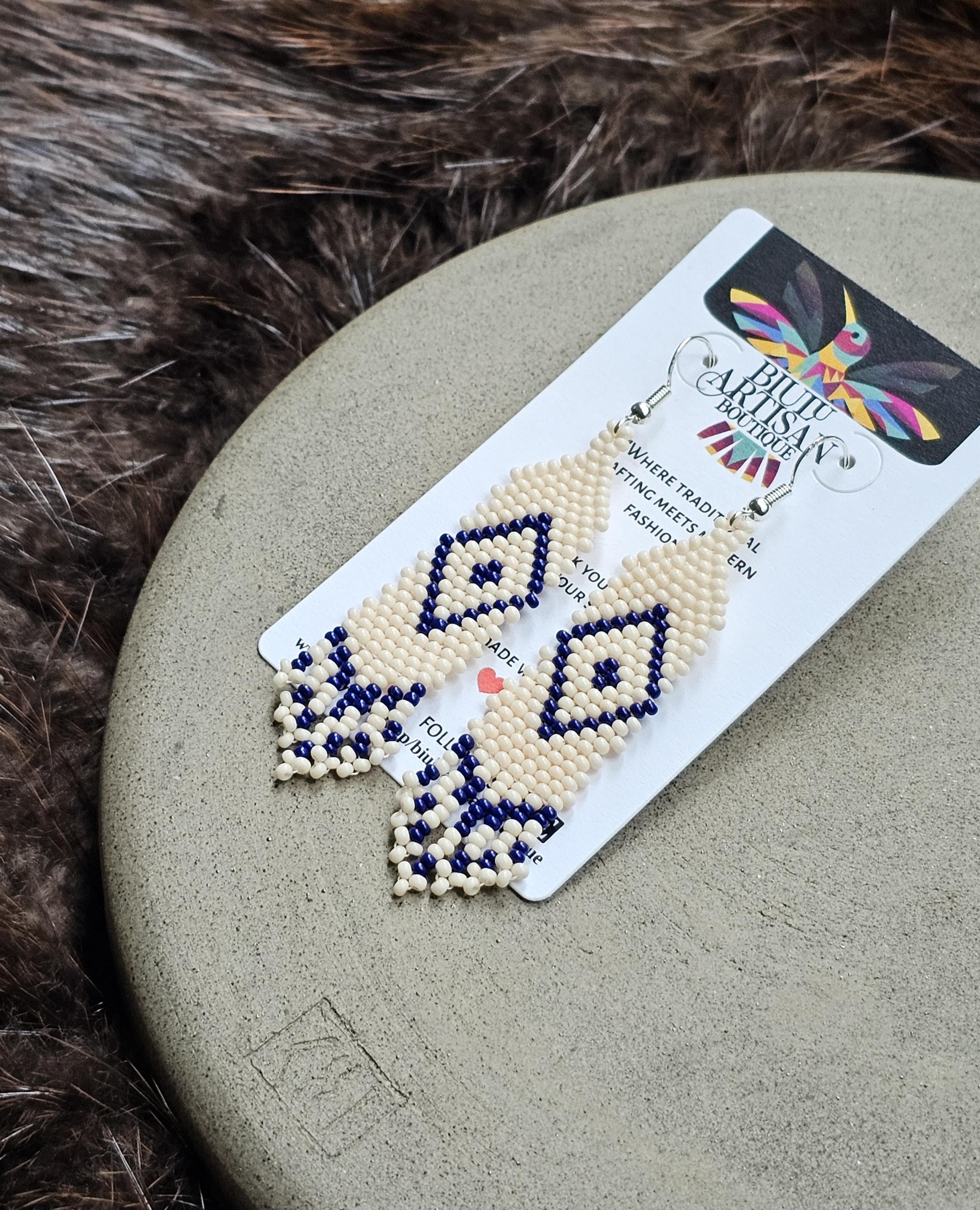 The earrings feature a beautiful minimalistic design with bone color beads as base and beautiful details of navy blue.
