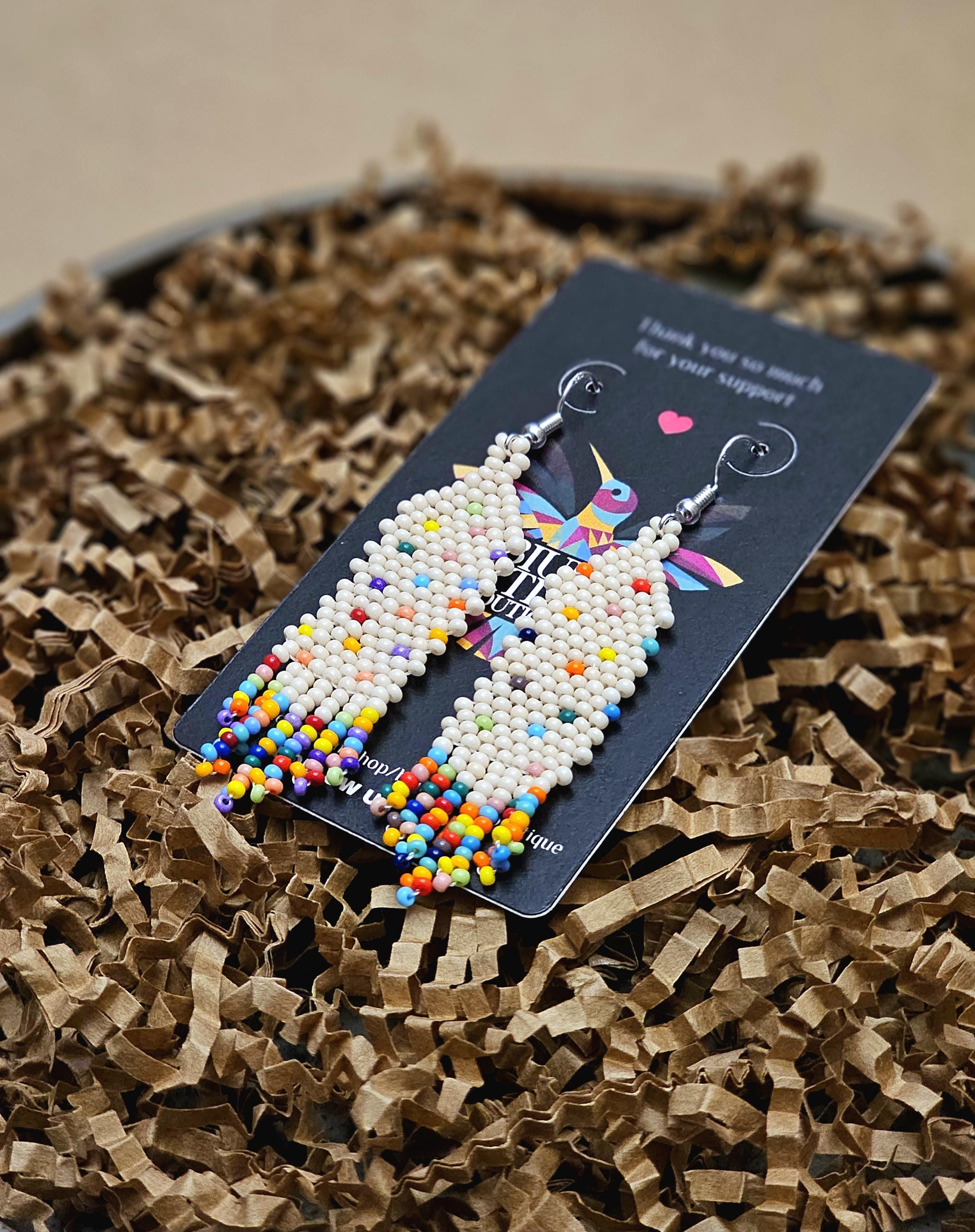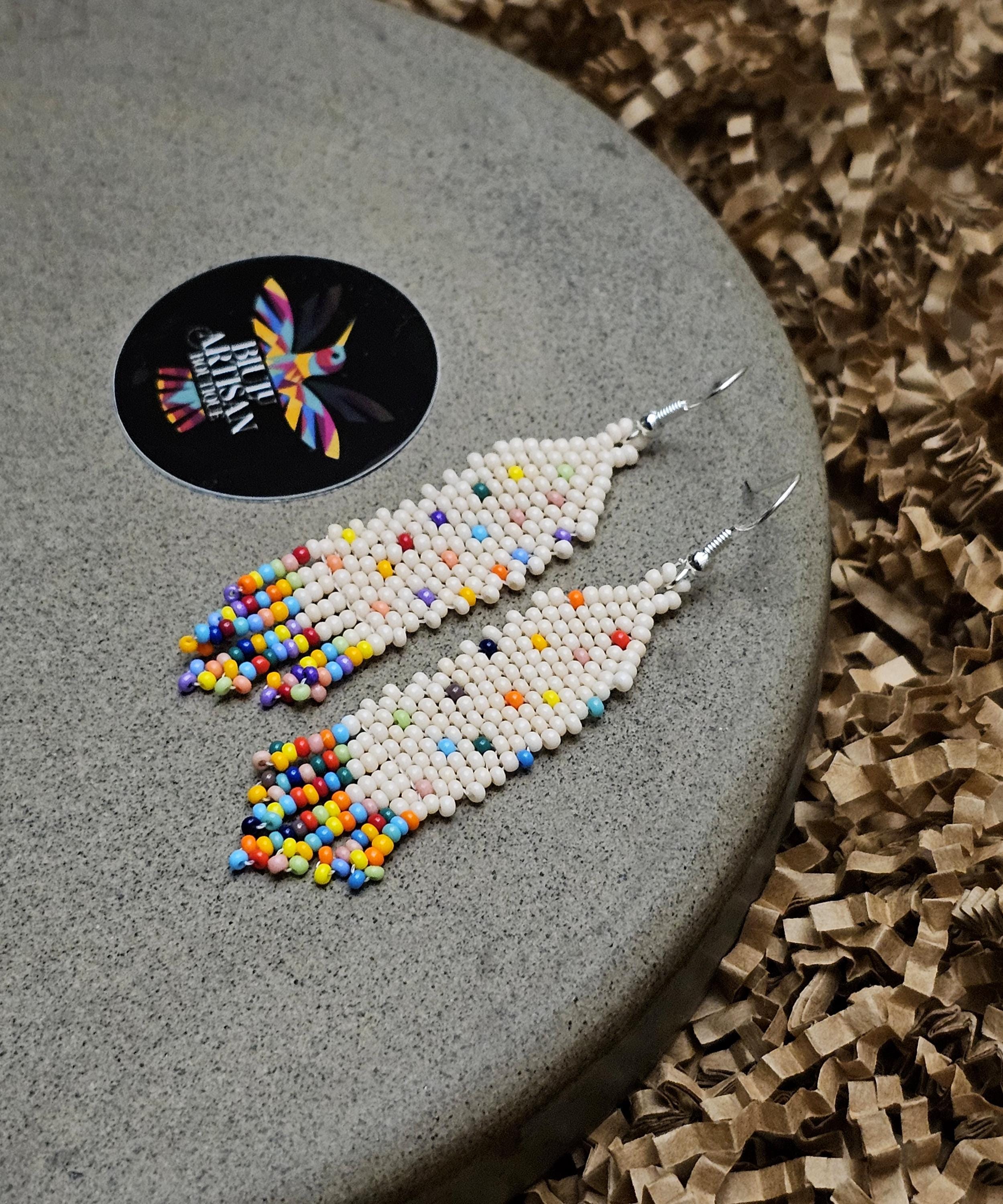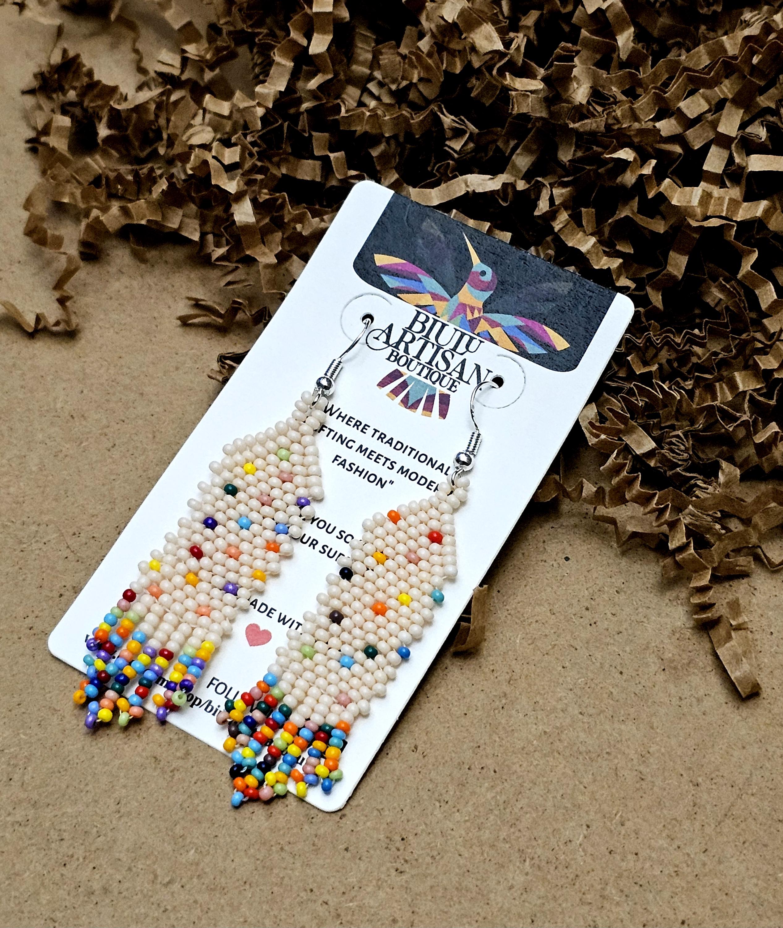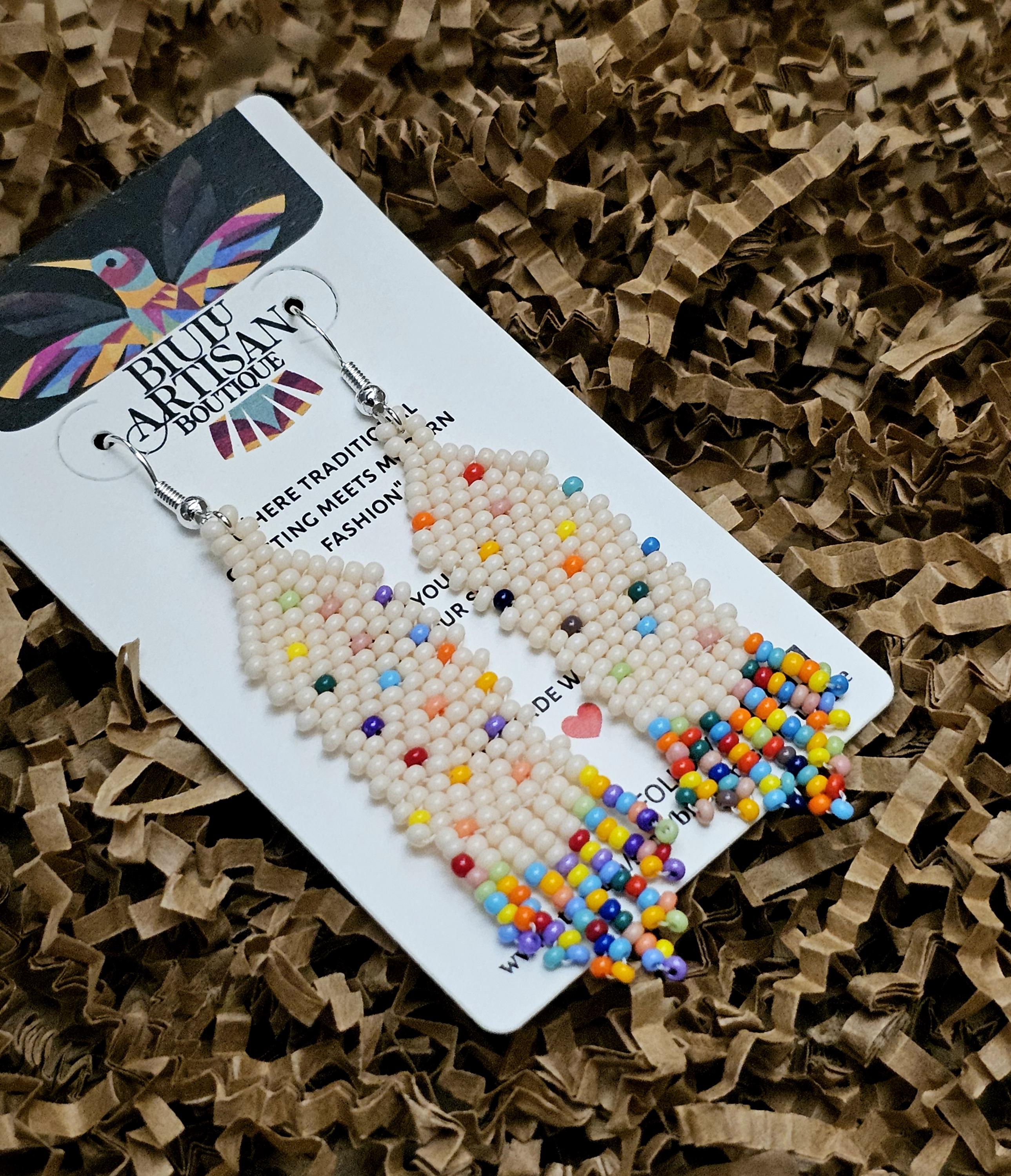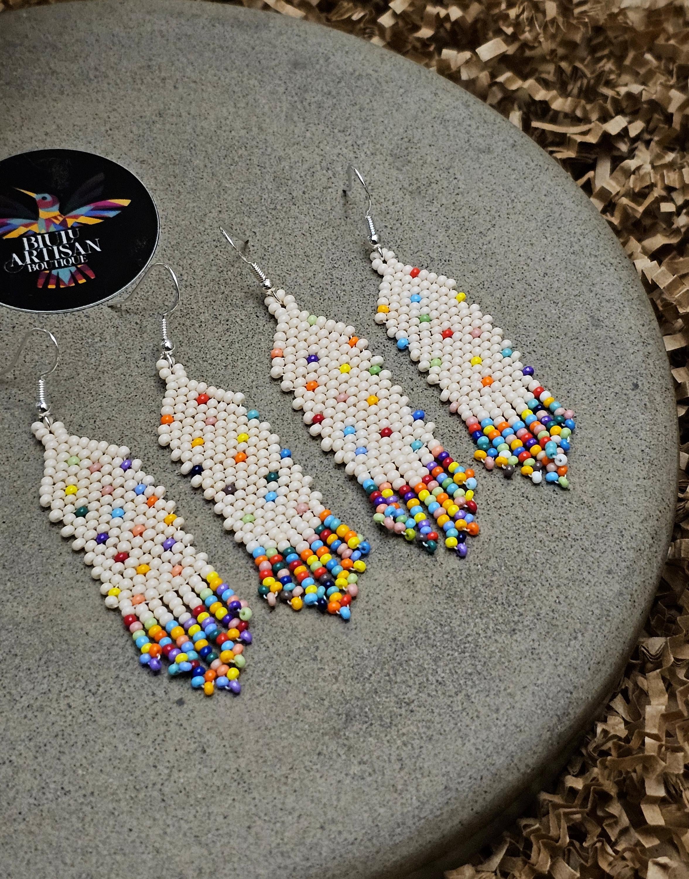 The earrings feature a beautiful palette of pastel pink, pastel yellow, baby blue and green turquoise pastel beads.