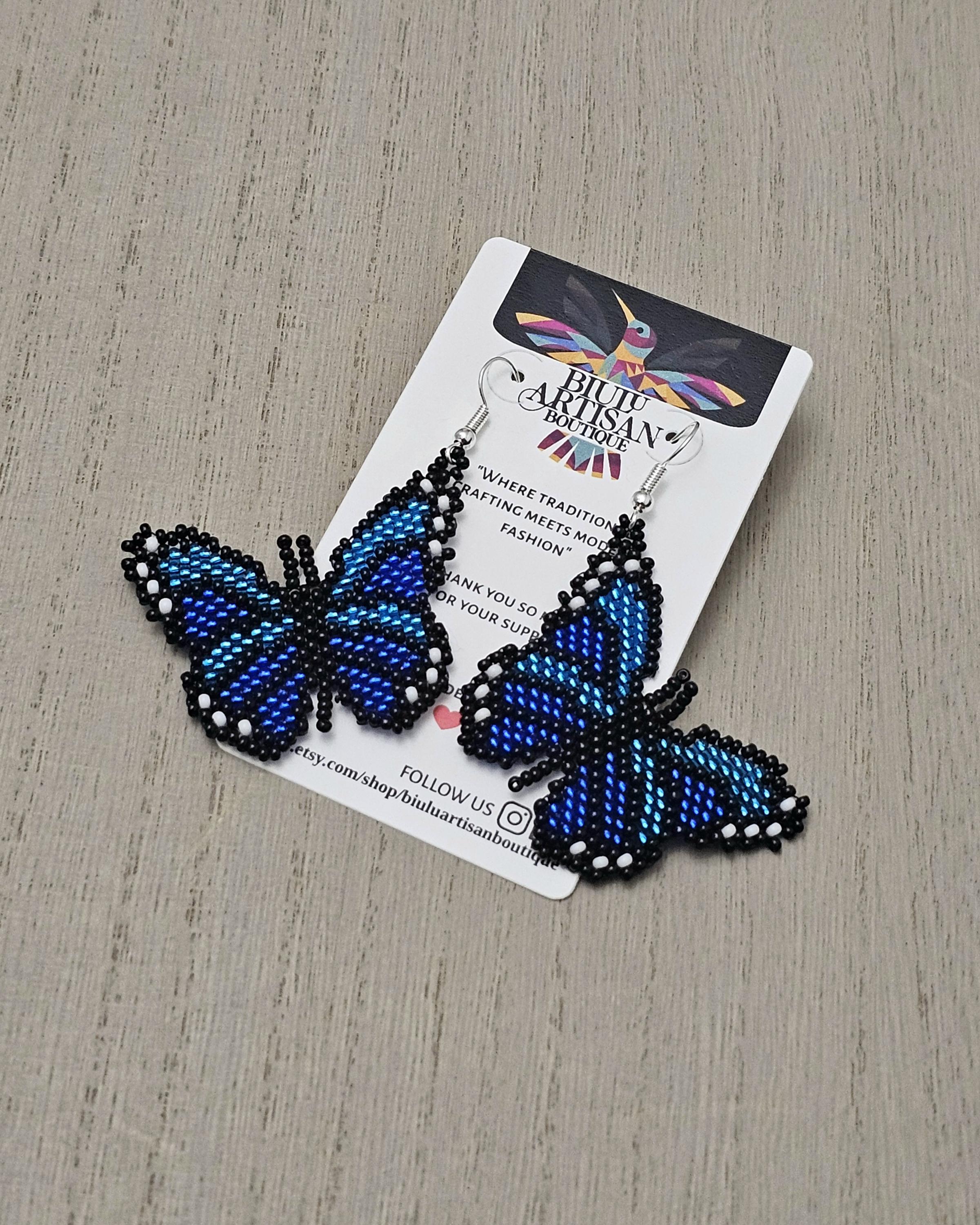 These earrings feature a beautiful butterflies with two tones of sparkly blue beads.