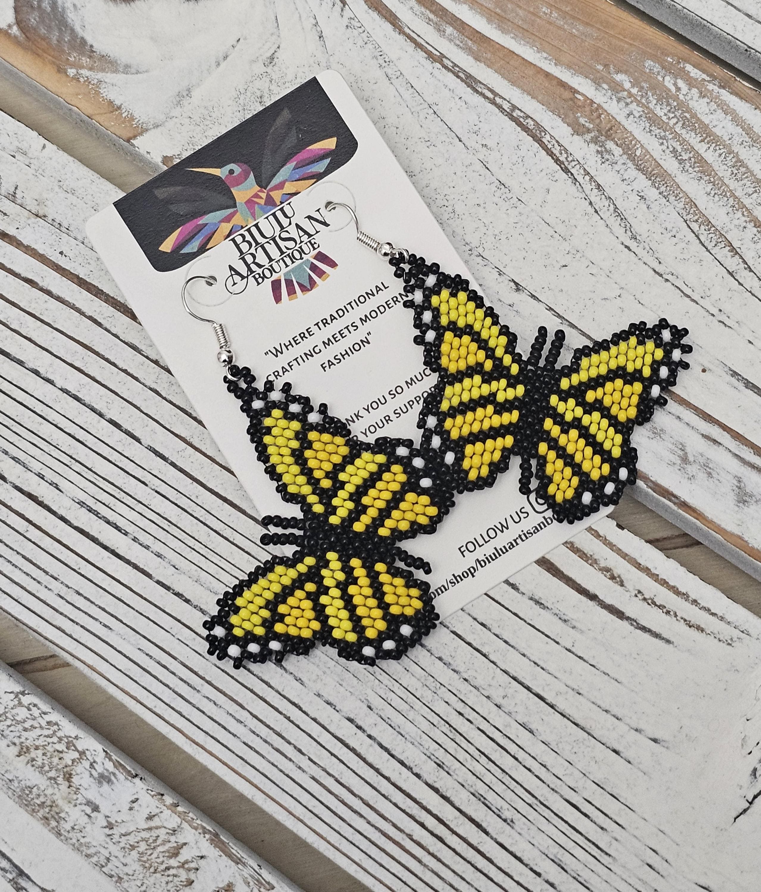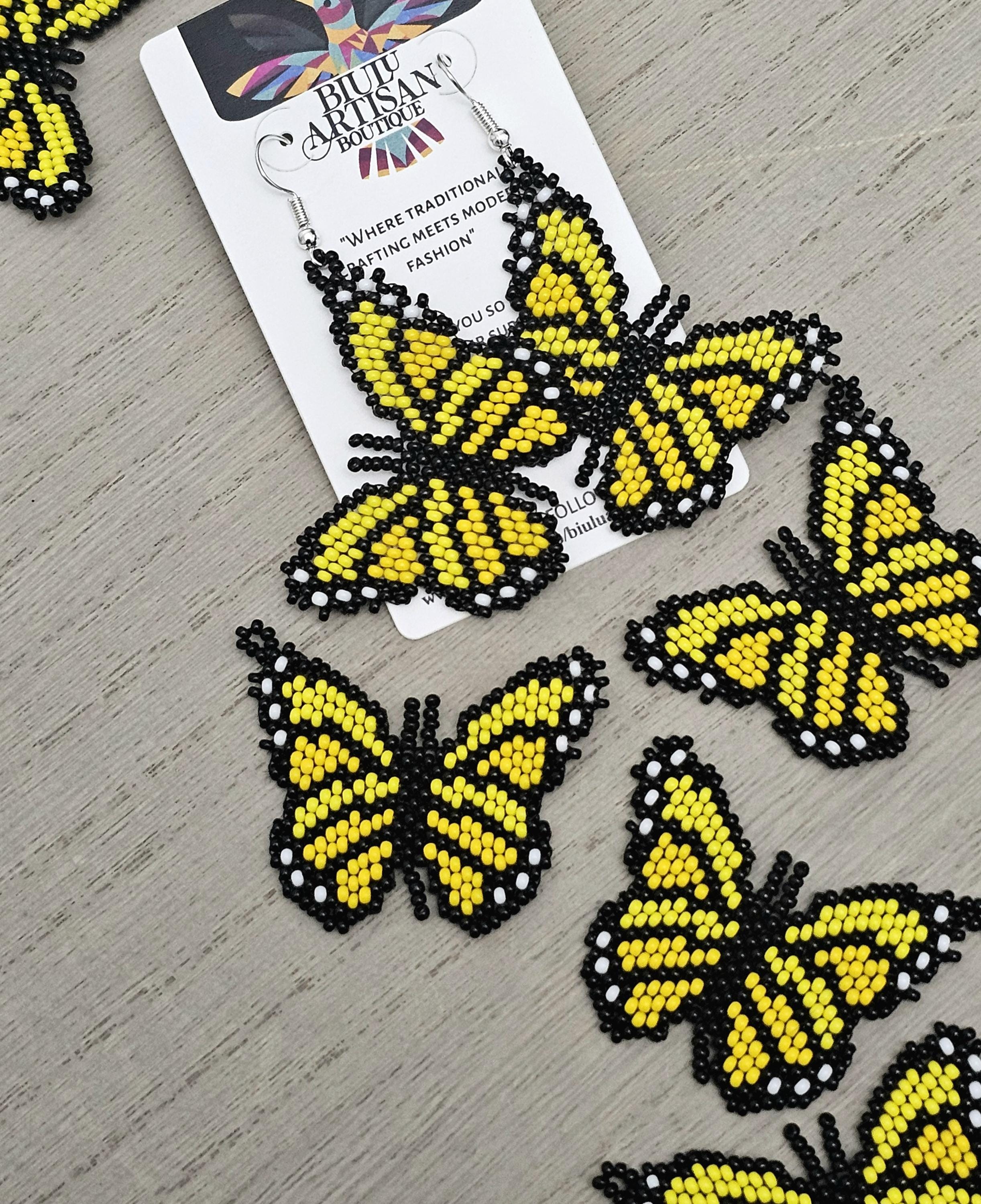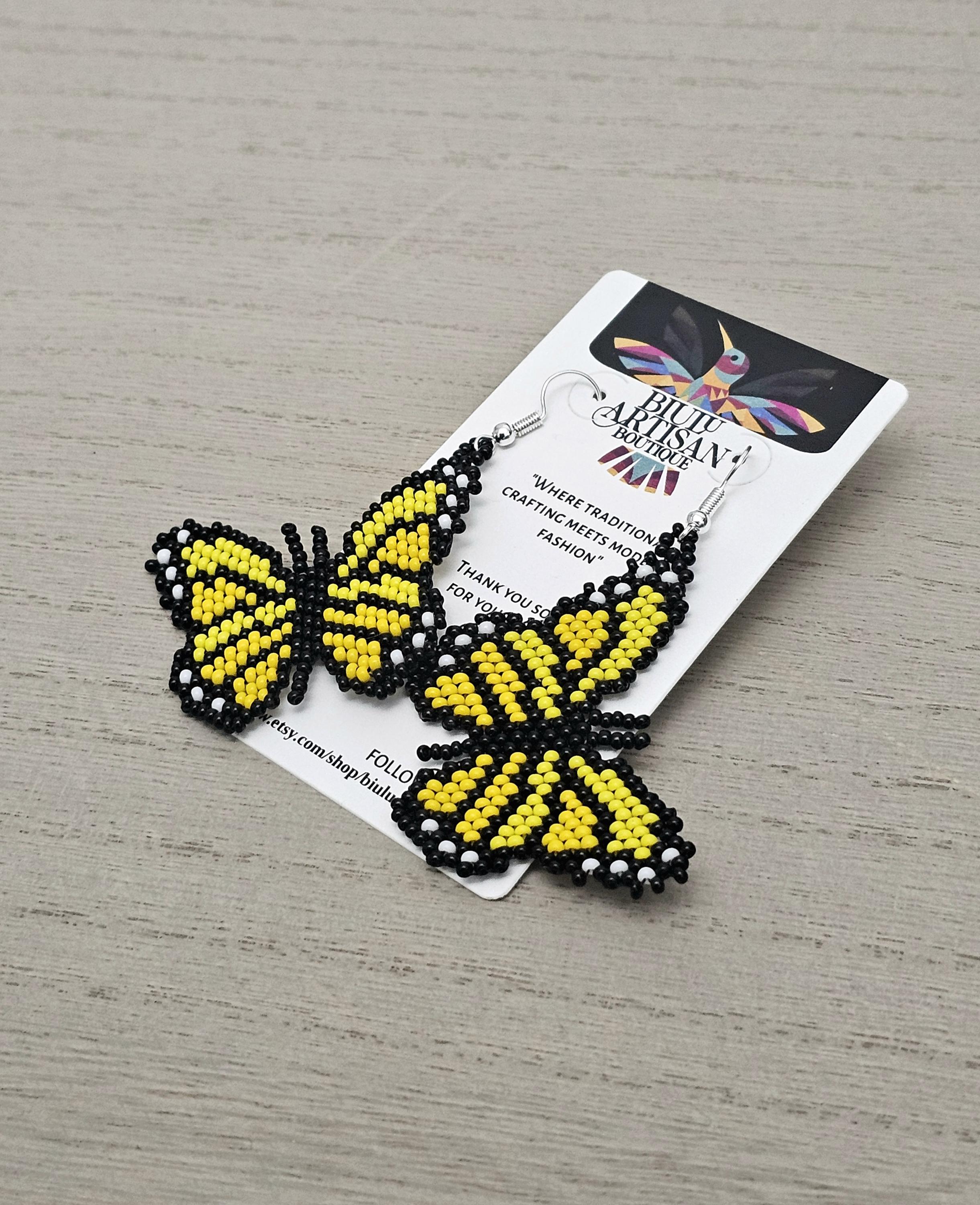 These earrings feature tones of yellow with black butterflies.