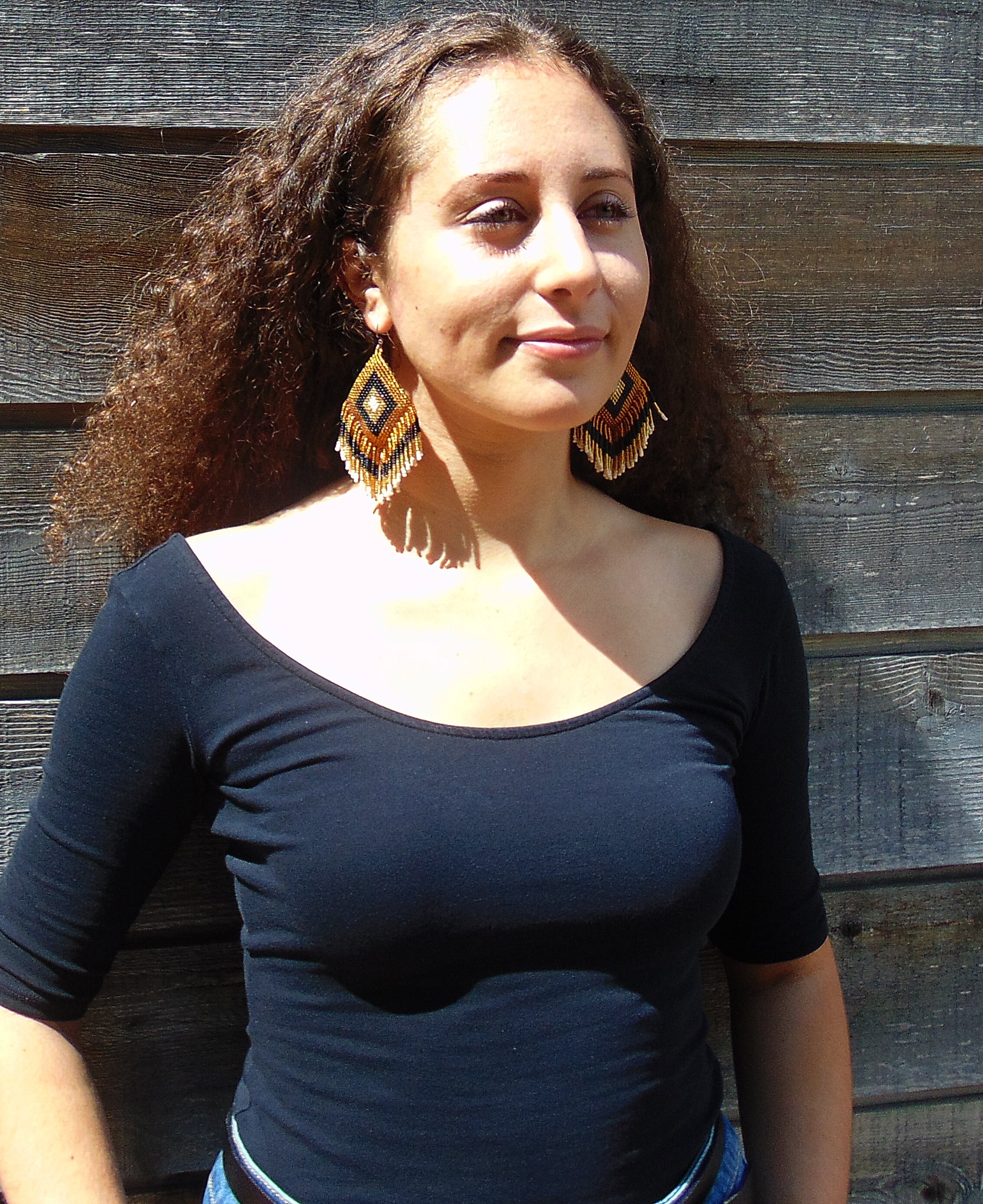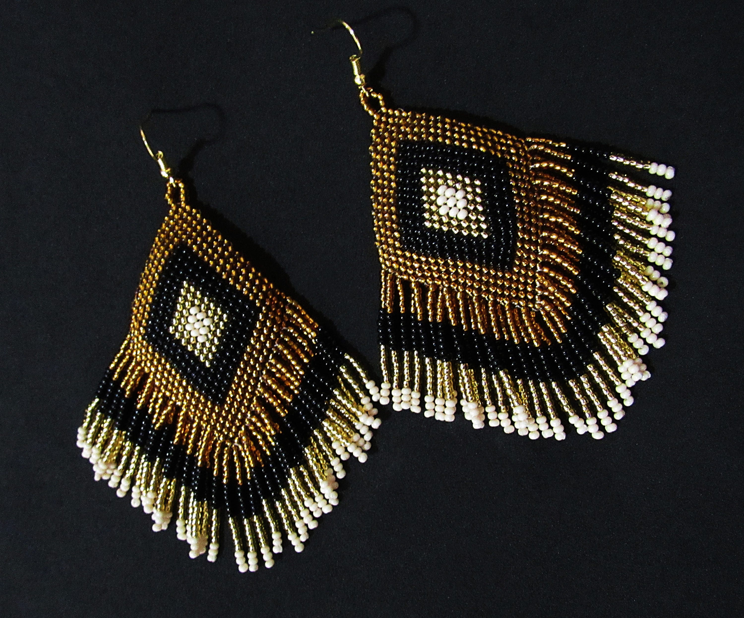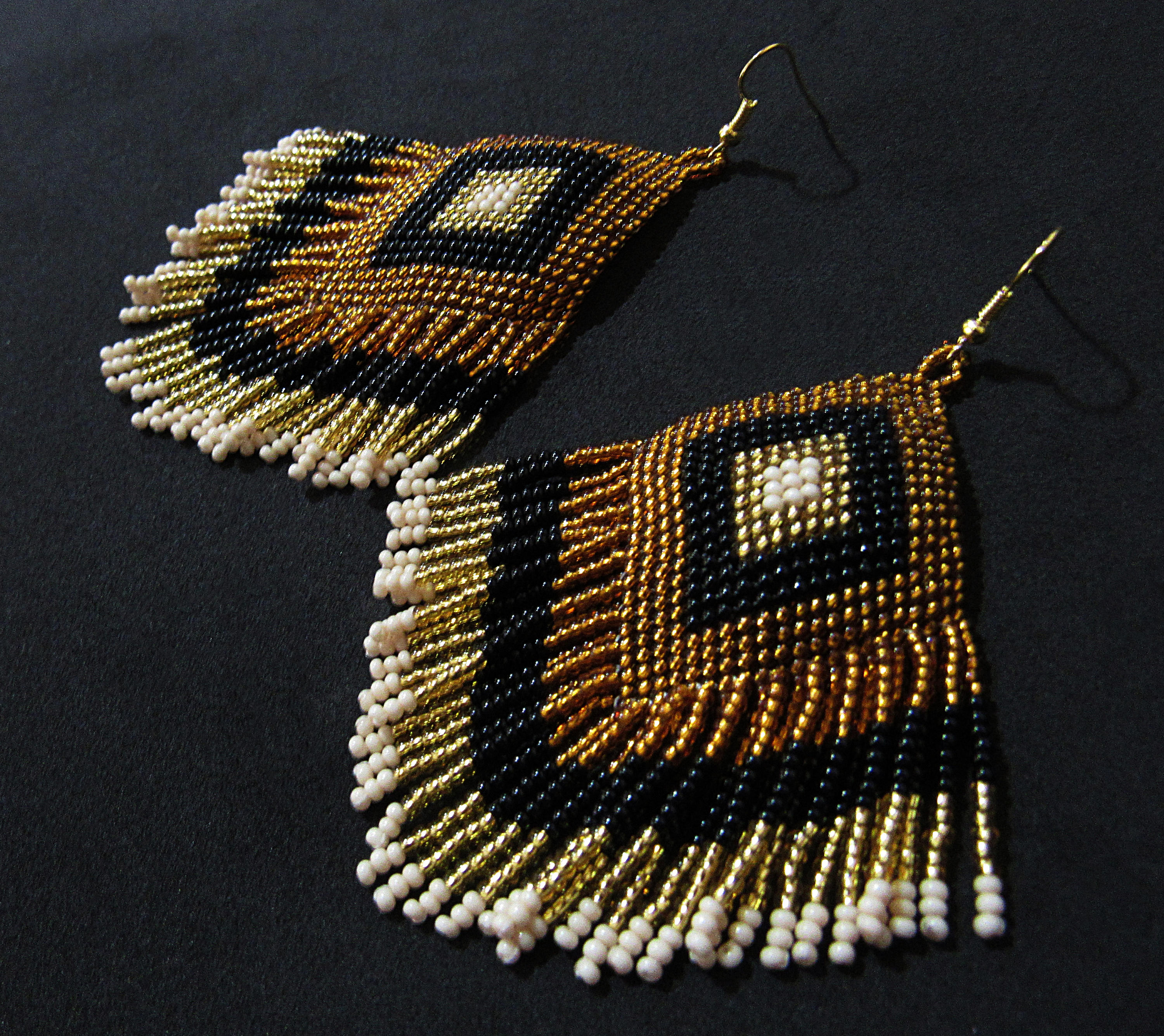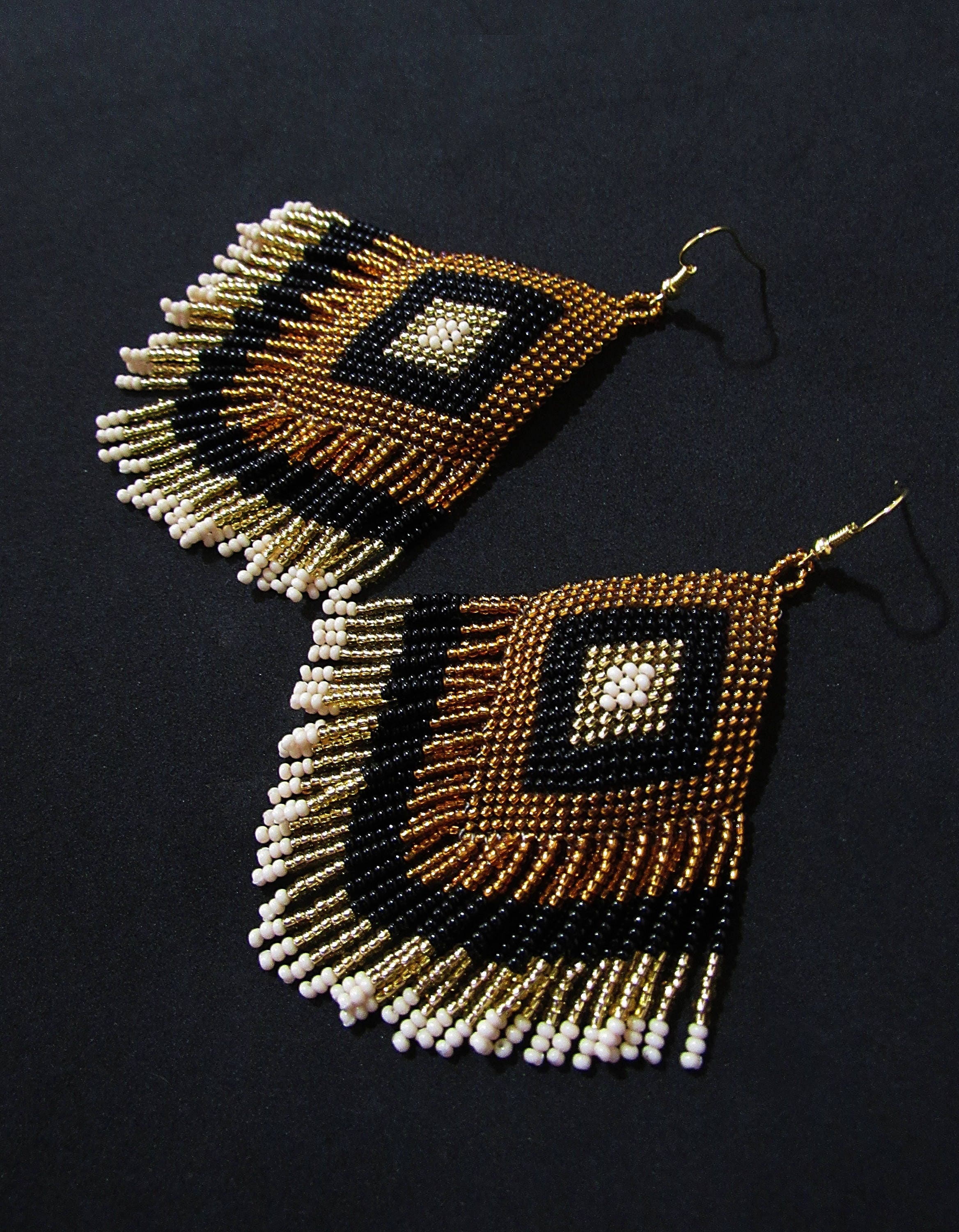 - Beautiful dangling earrings featuring an ojo de dios pattern with an exotic, elegant dark gold and black color theme.