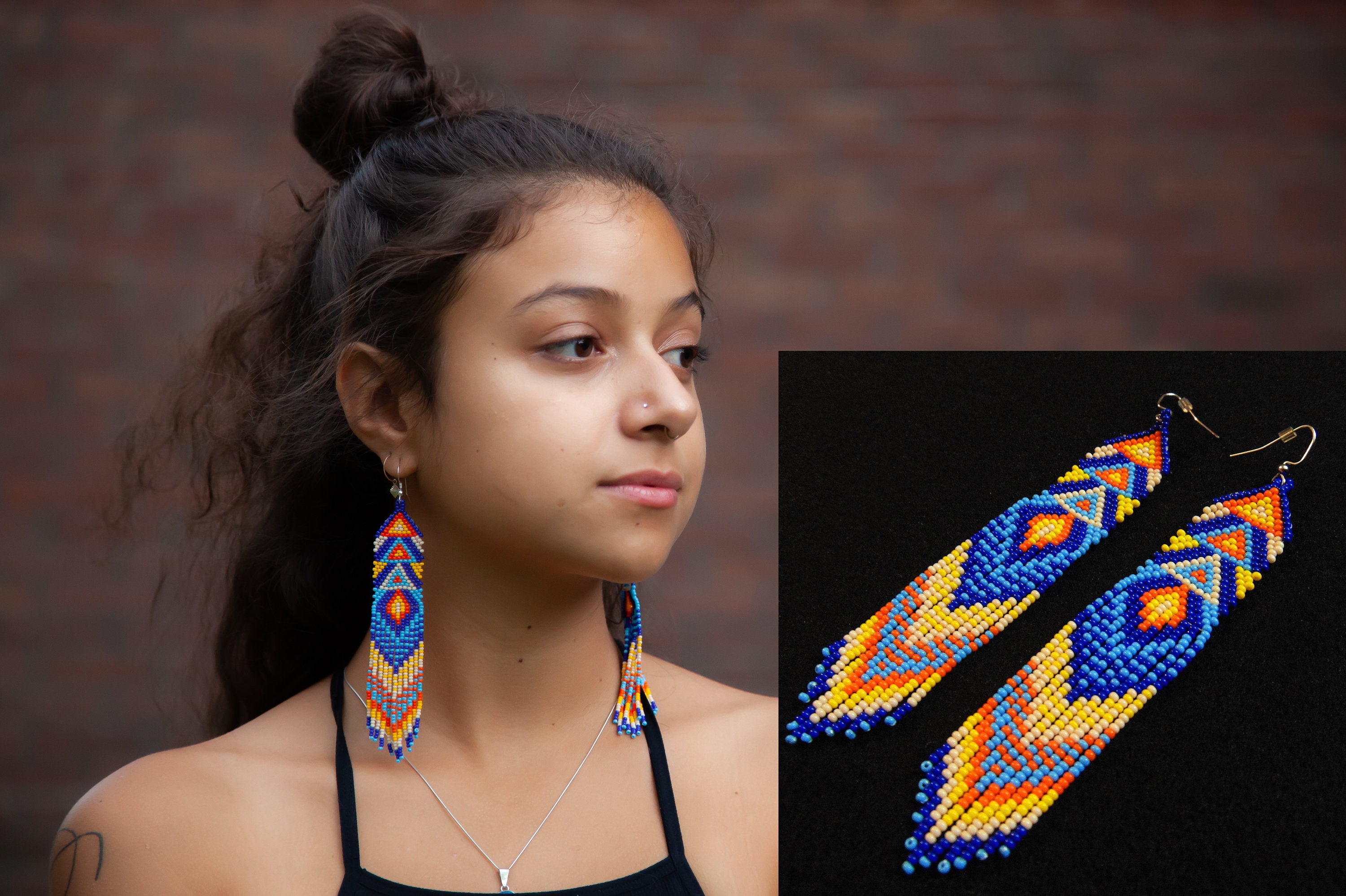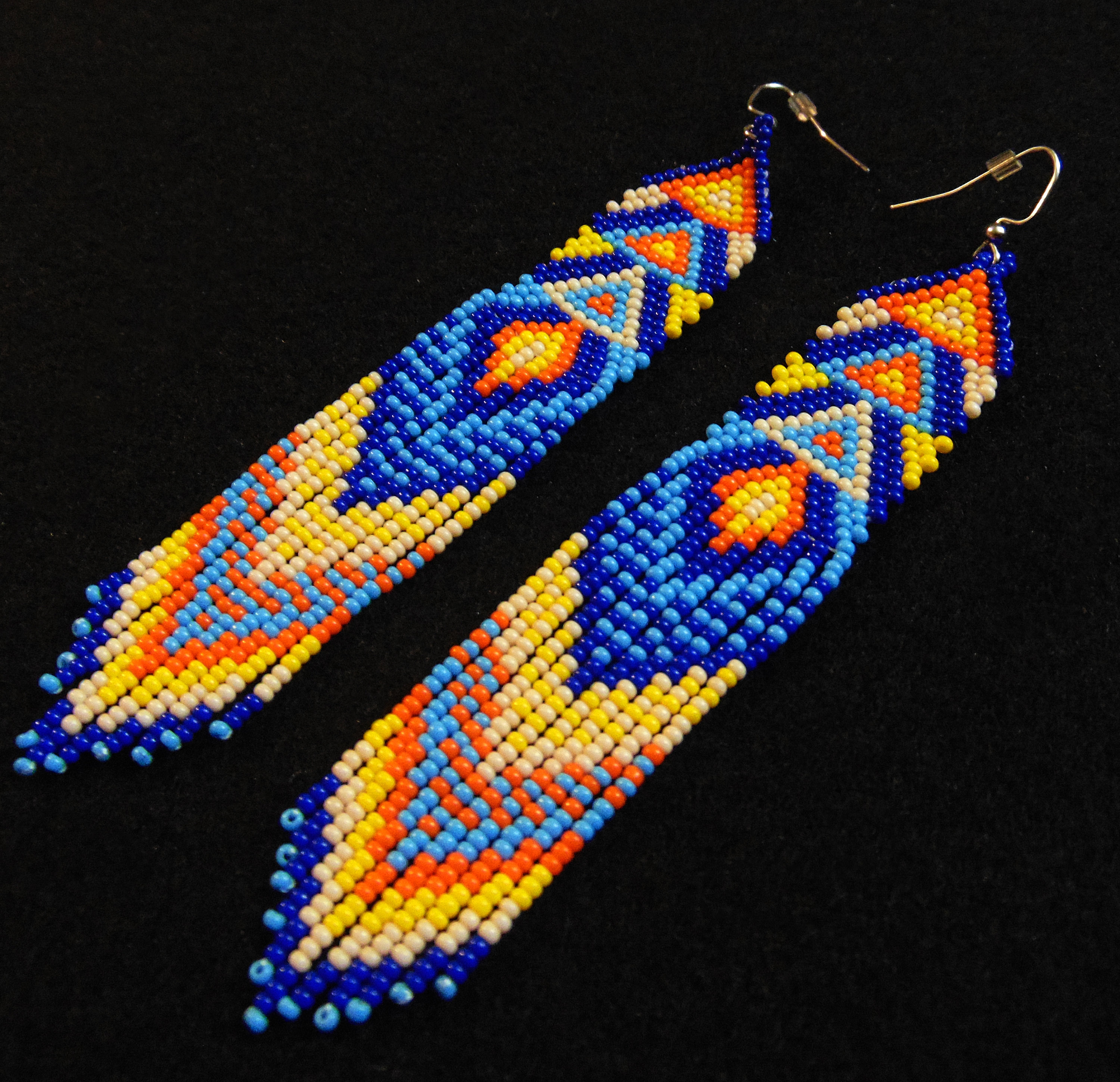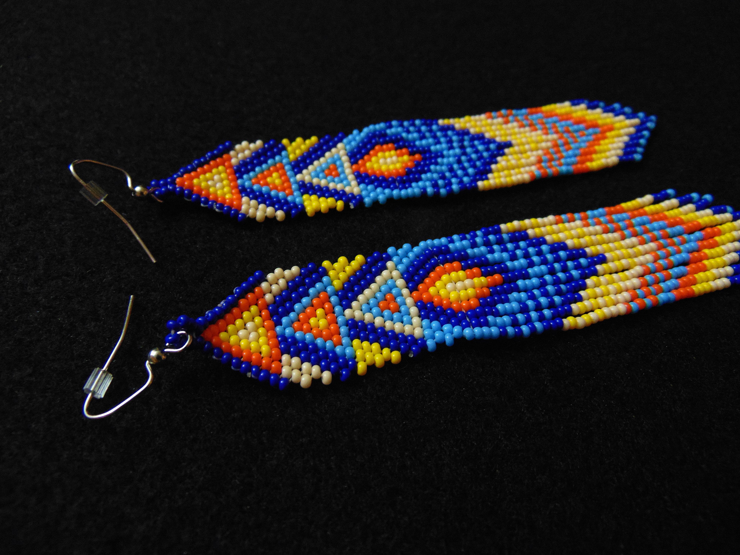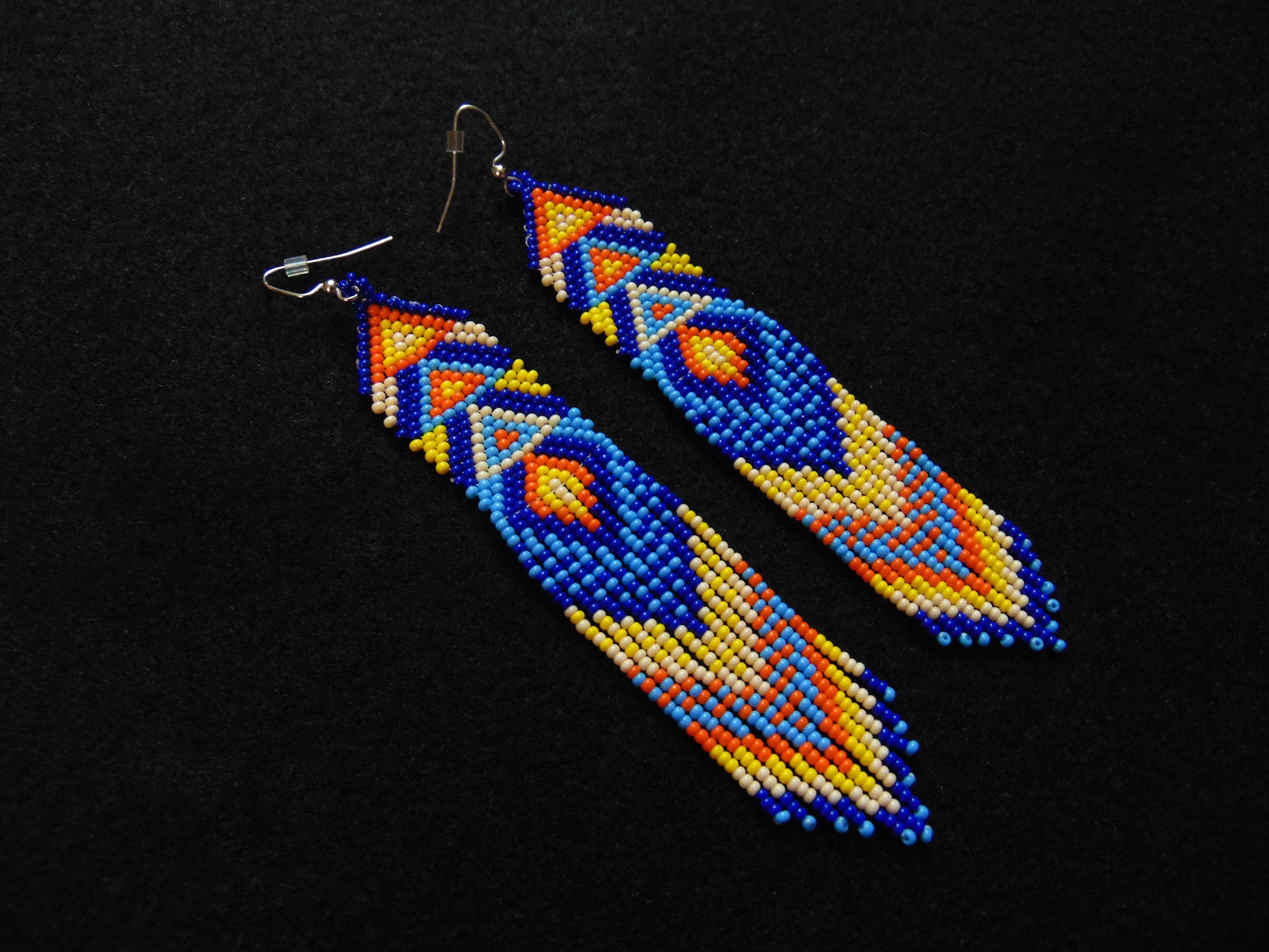 Inspire confidence and turn heads! A unique geometric, pop art-esque body with long decorative dangles. A beautiful blend of blues contrasts against brighter colors.