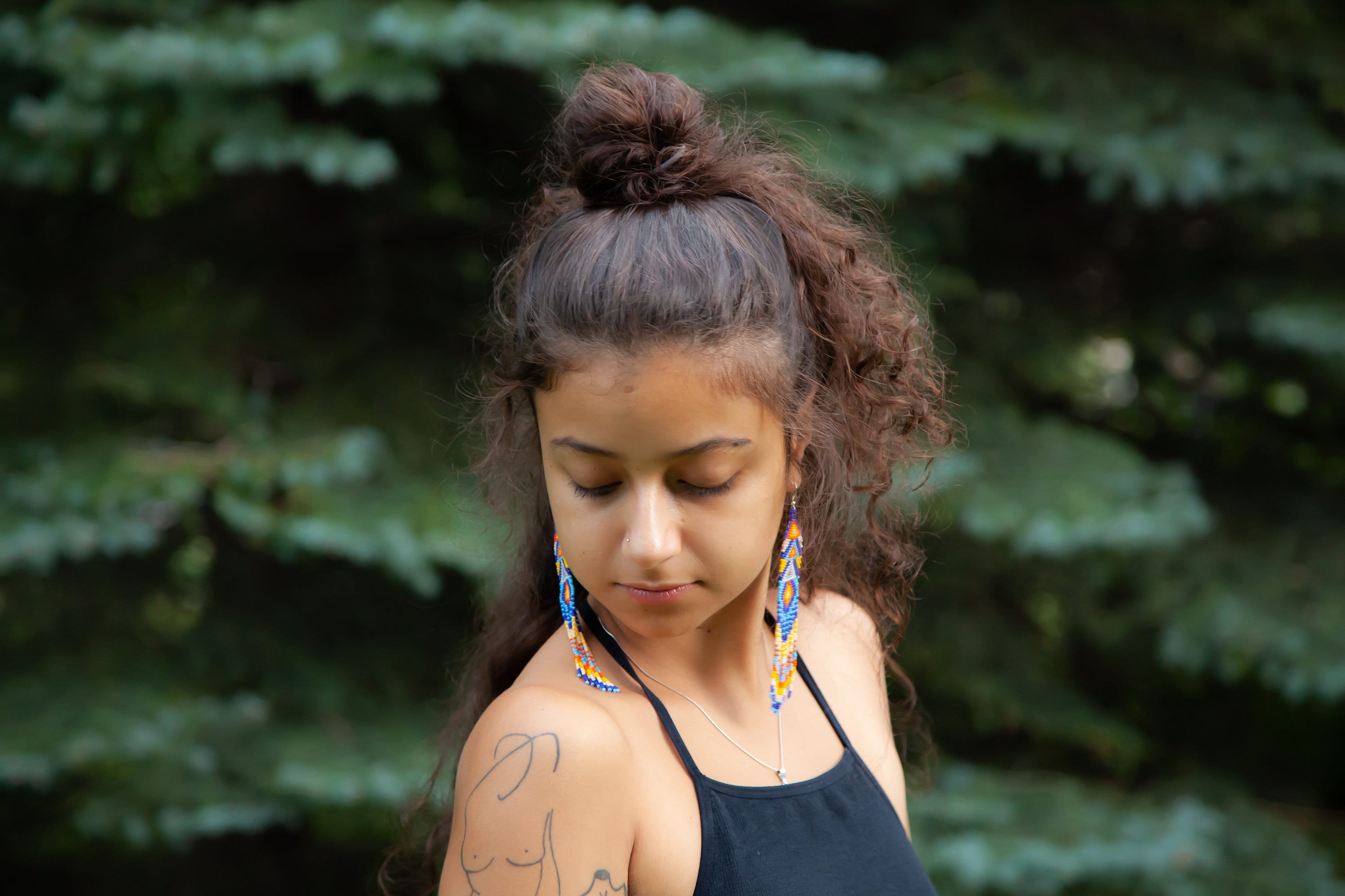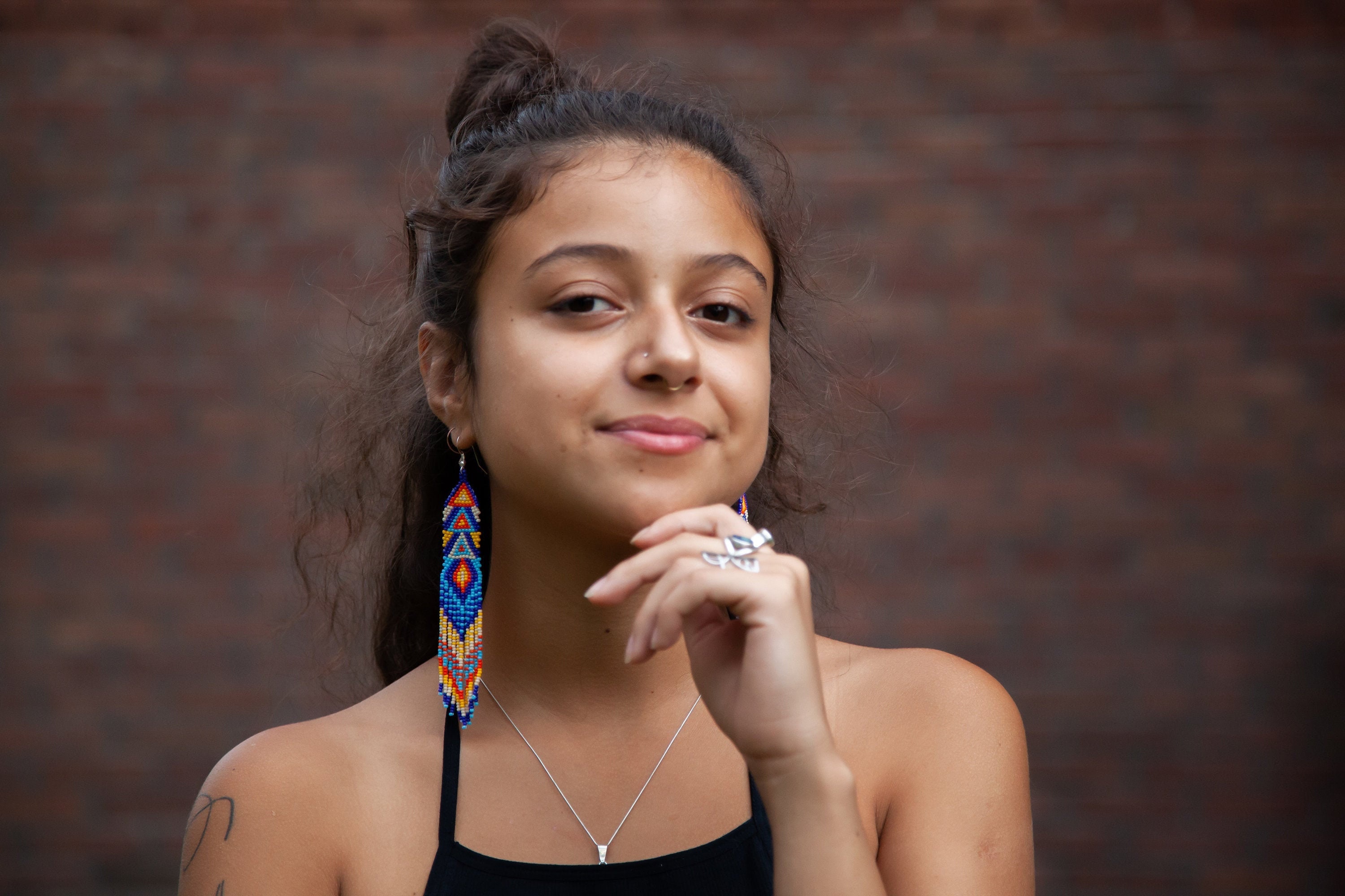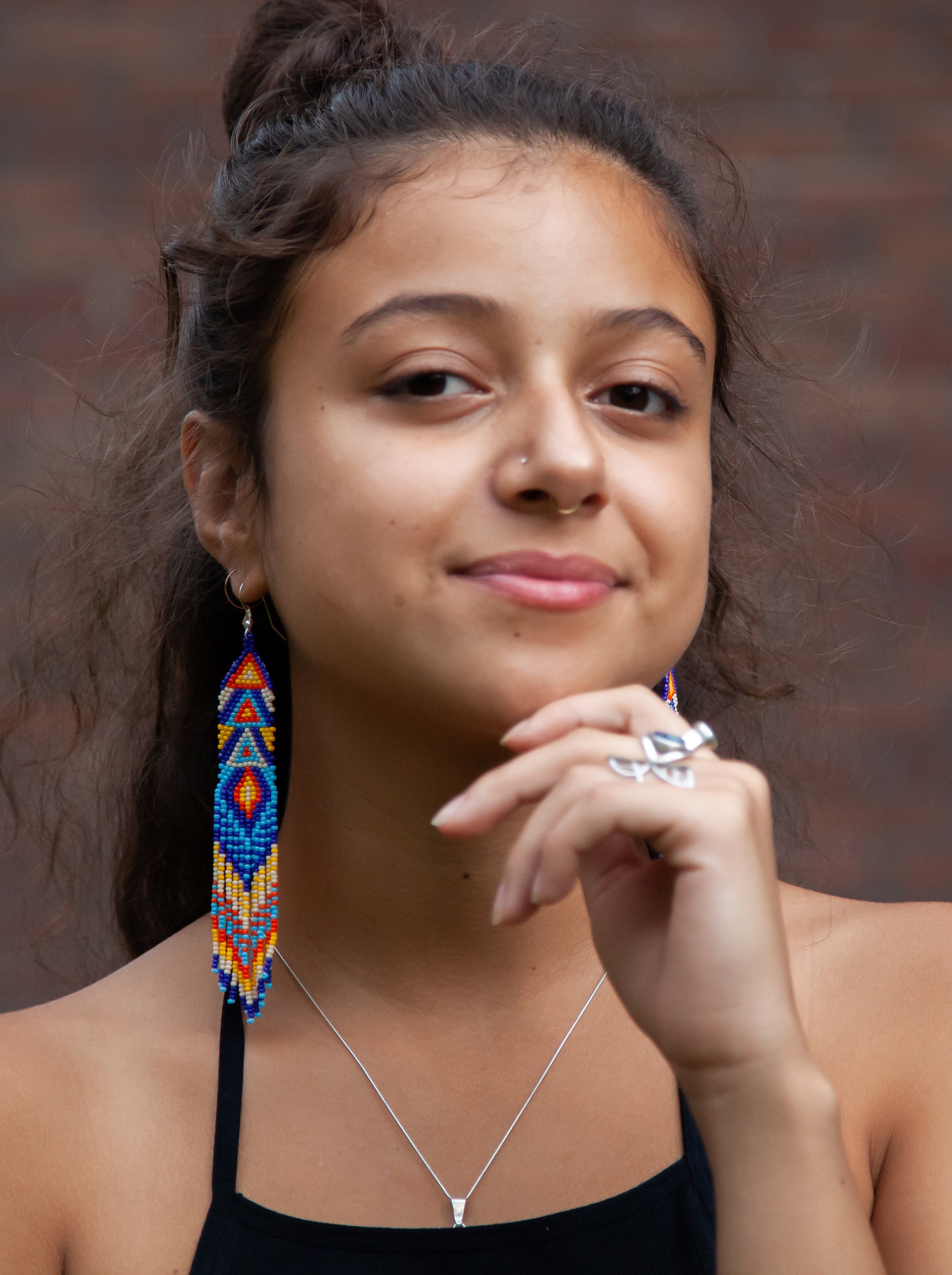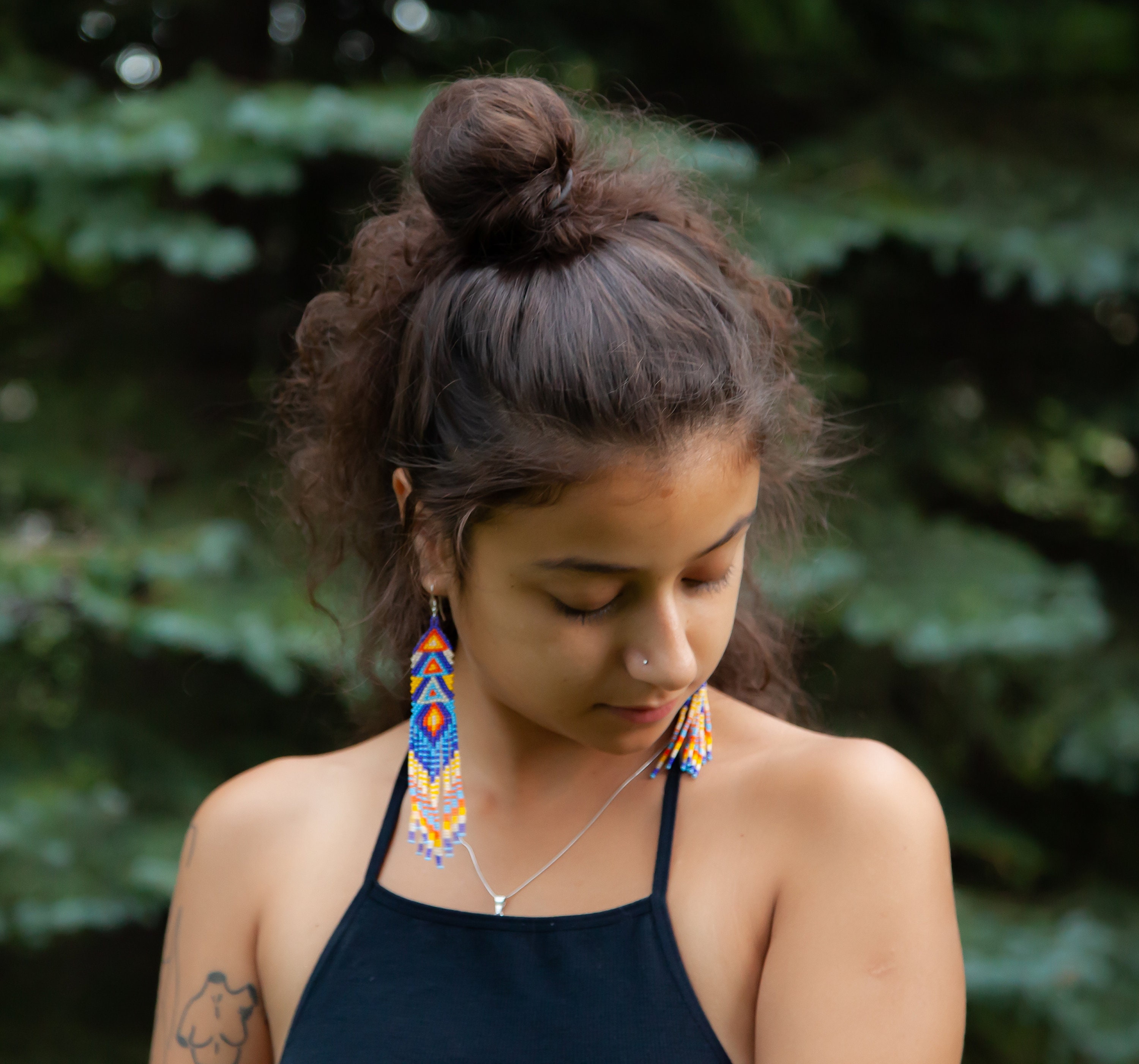 Inspire confidence and turn heads! A unique geometric, pop art-esque body with long decorative dangles. A beautiful blend of blues contrasts against brighter colors.