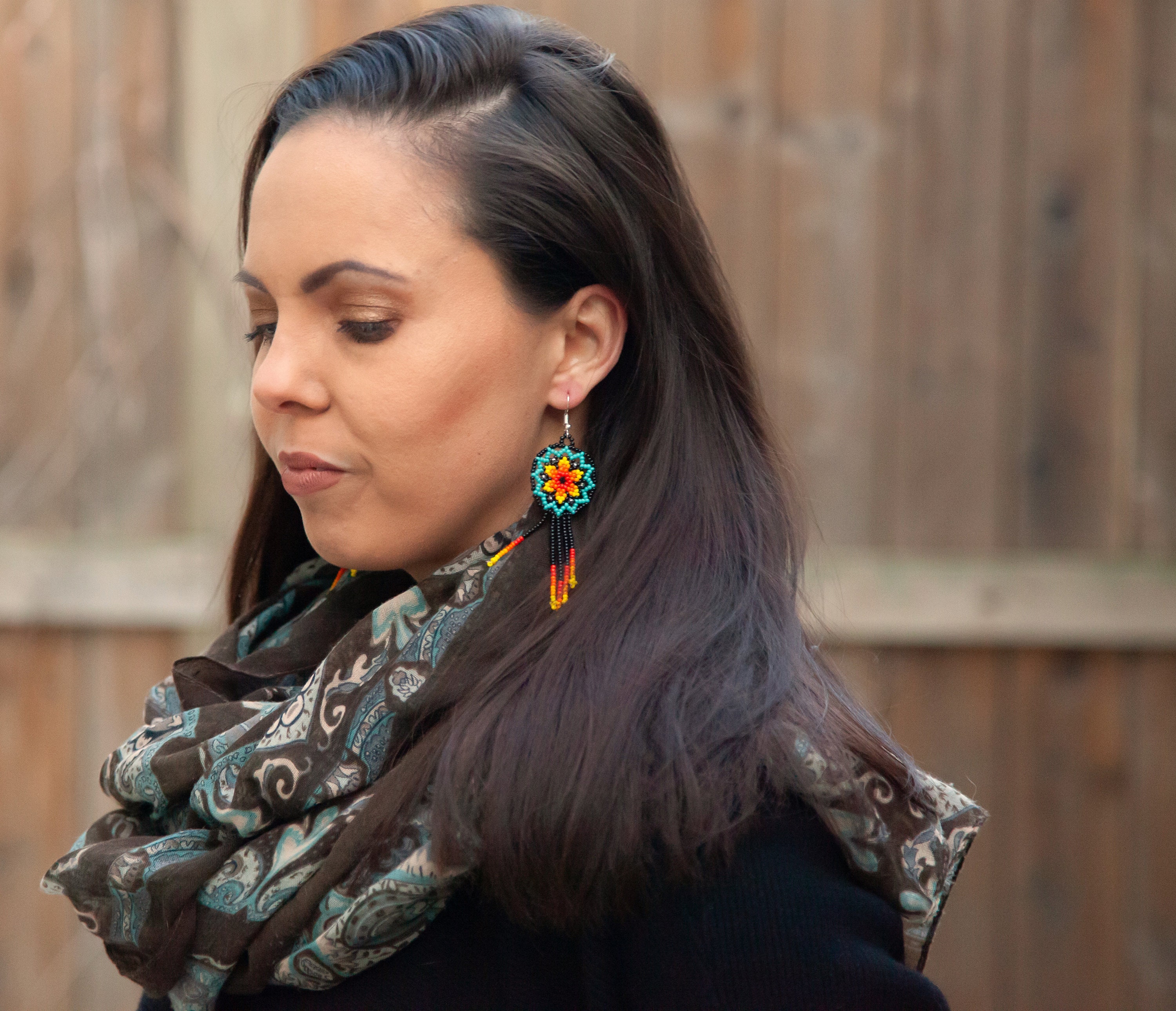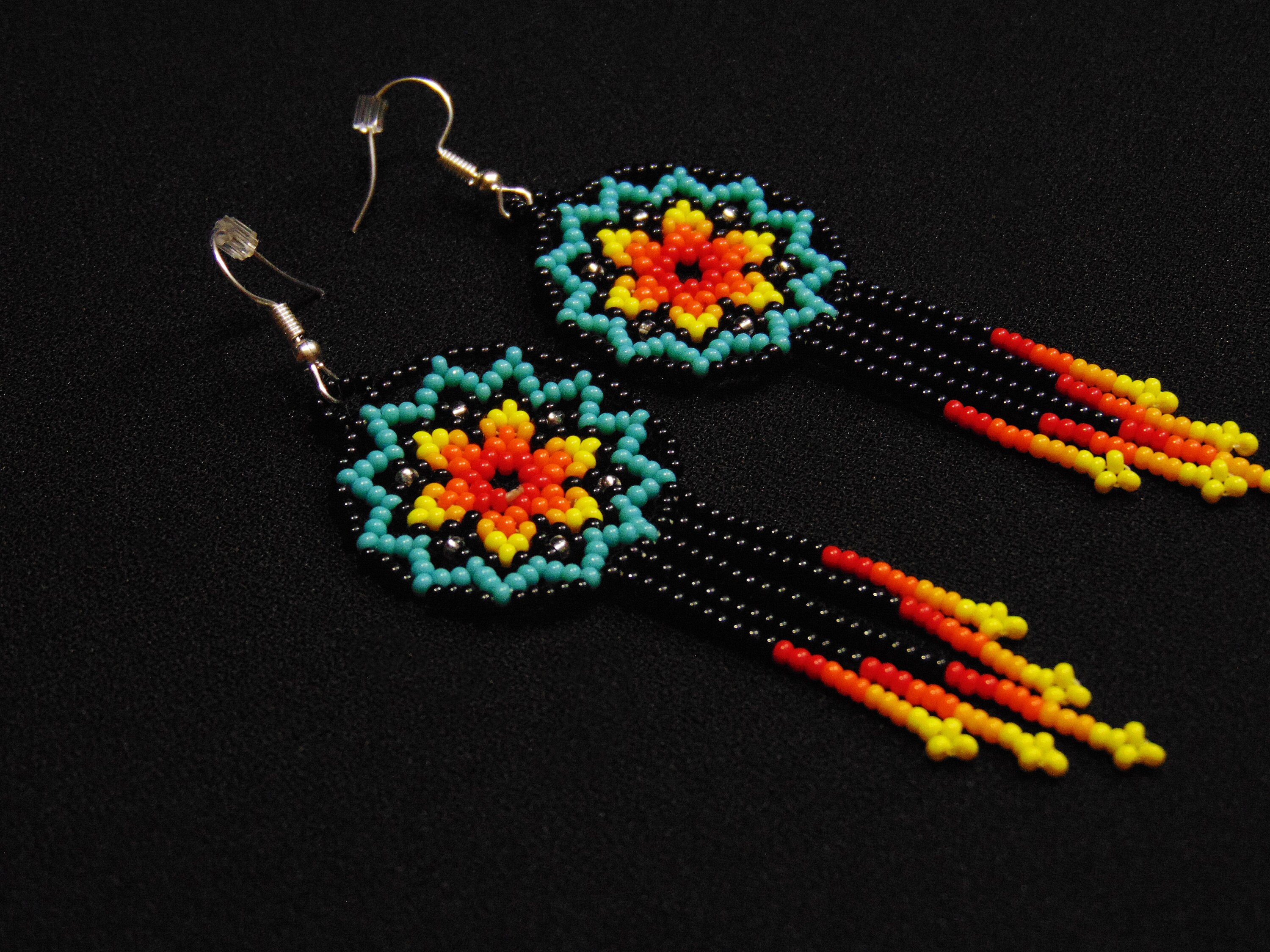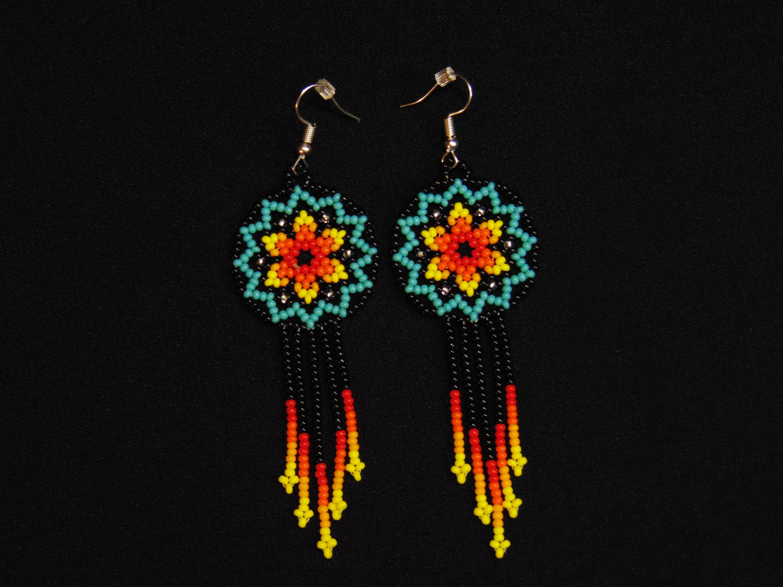 Super cute and colorful, these earrings are humble in size but big in presence. The turquoise and orange dominant starburst pattern pops with the black background.