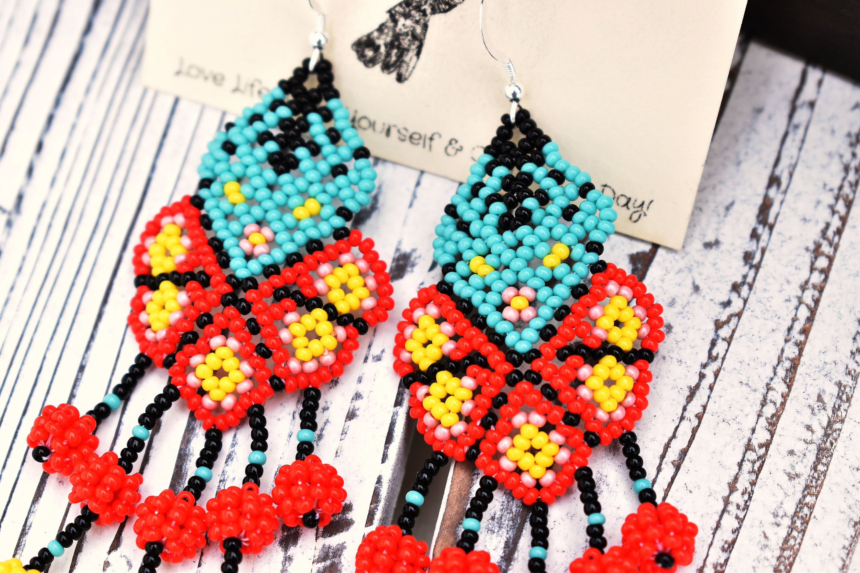 A fun and traditional Huichol design for any occasion. These beaded earrings feature the Mexican folk art of El Venado (a Deer) in a peyote pattern.
