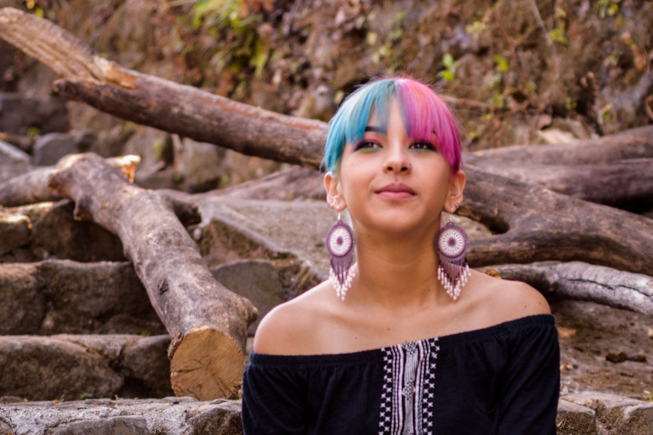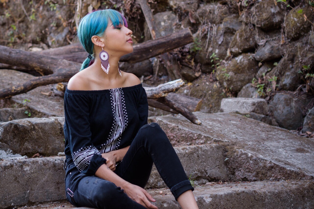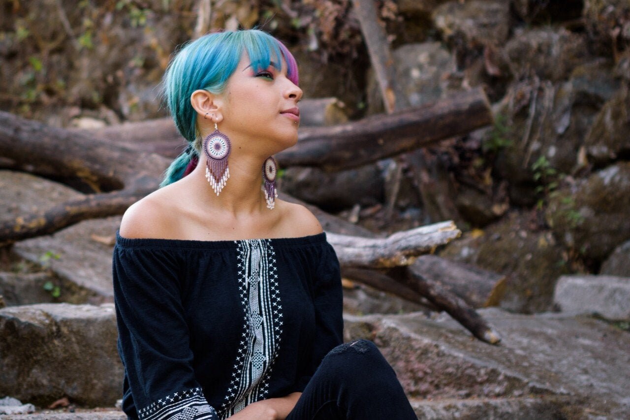 - These boho earrings express an earthy femininity with a purple base and white accents. More mellow than a blue blend...an exotic tranquility.