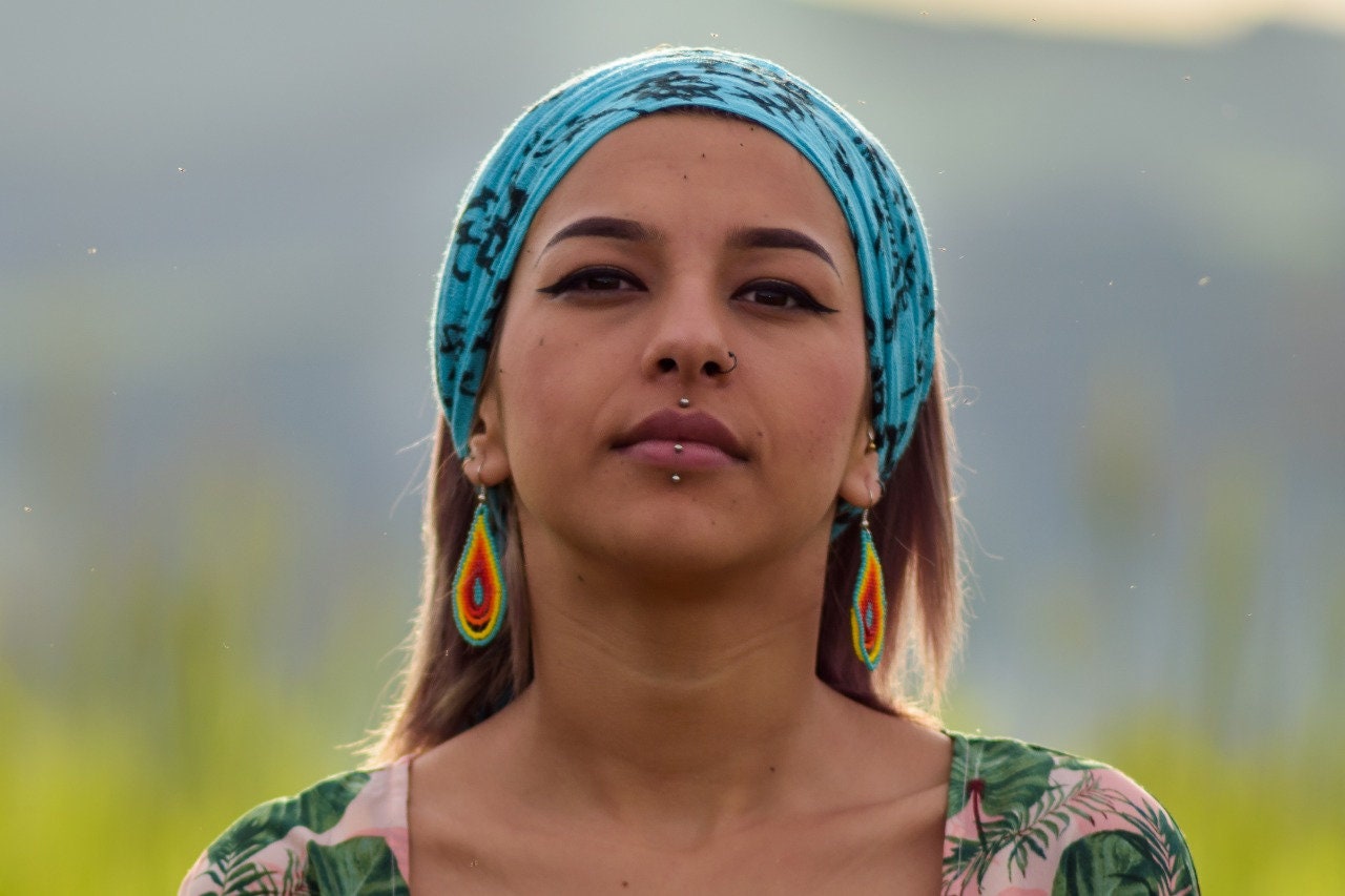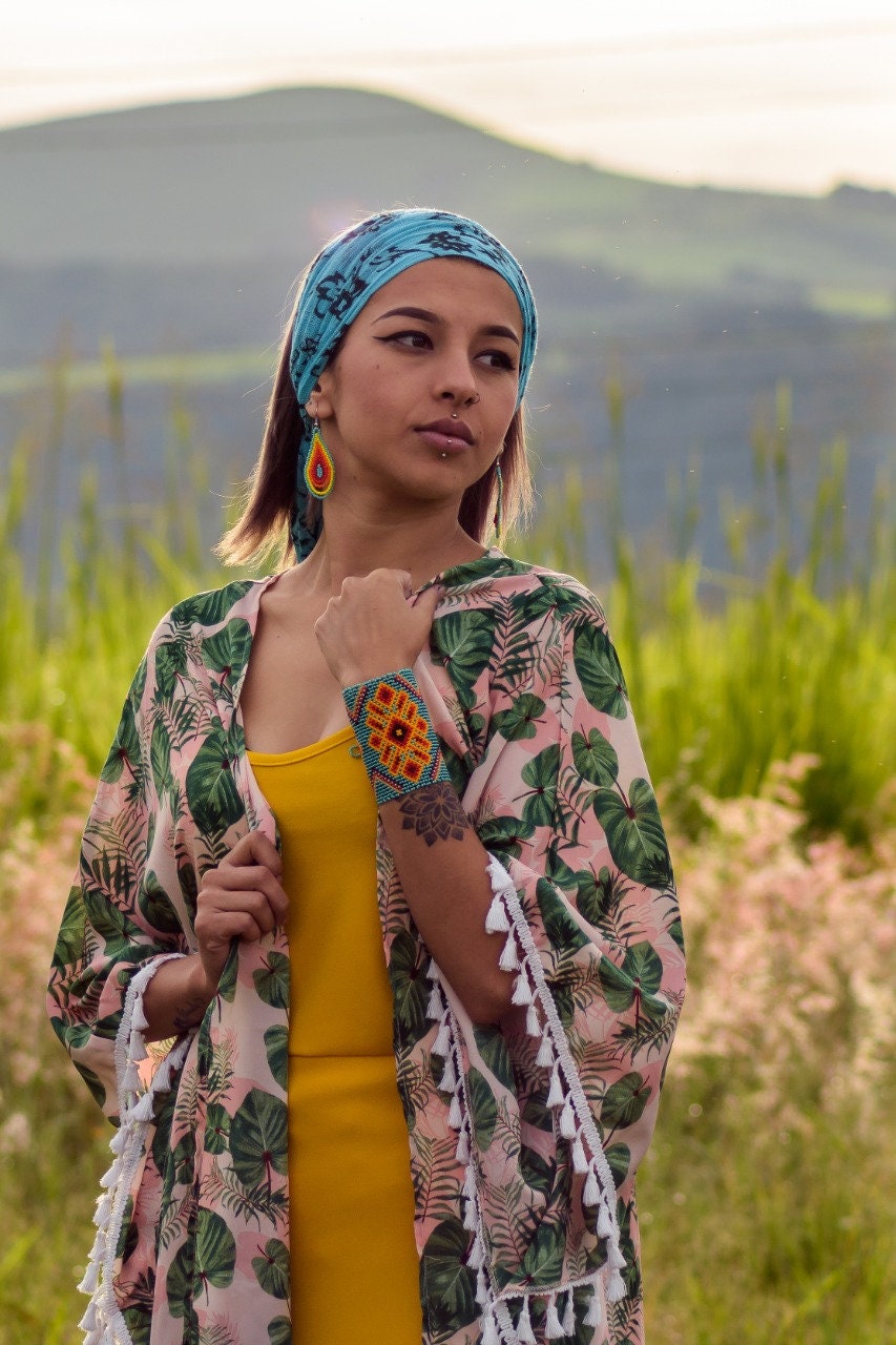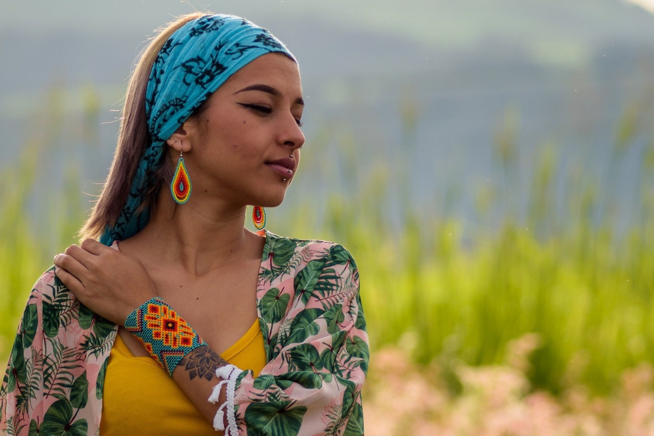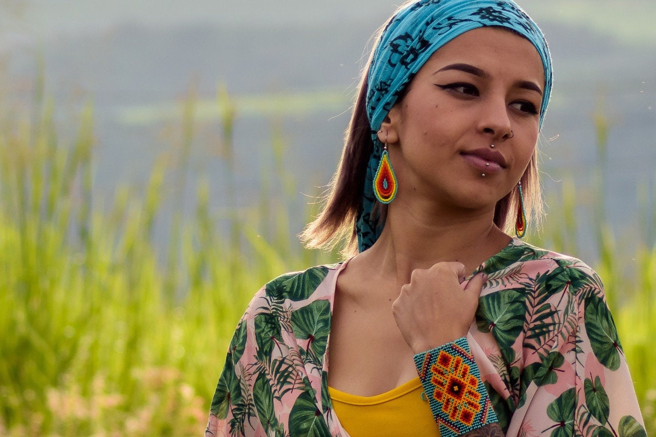 This is a gorgeous boho-tribal style jewelry set combining a wide, statement cuff bracelet and dainty droplet earrings. Turquoise dominates while oranges and reds contrast. The earrings have a touch of yellow as well.