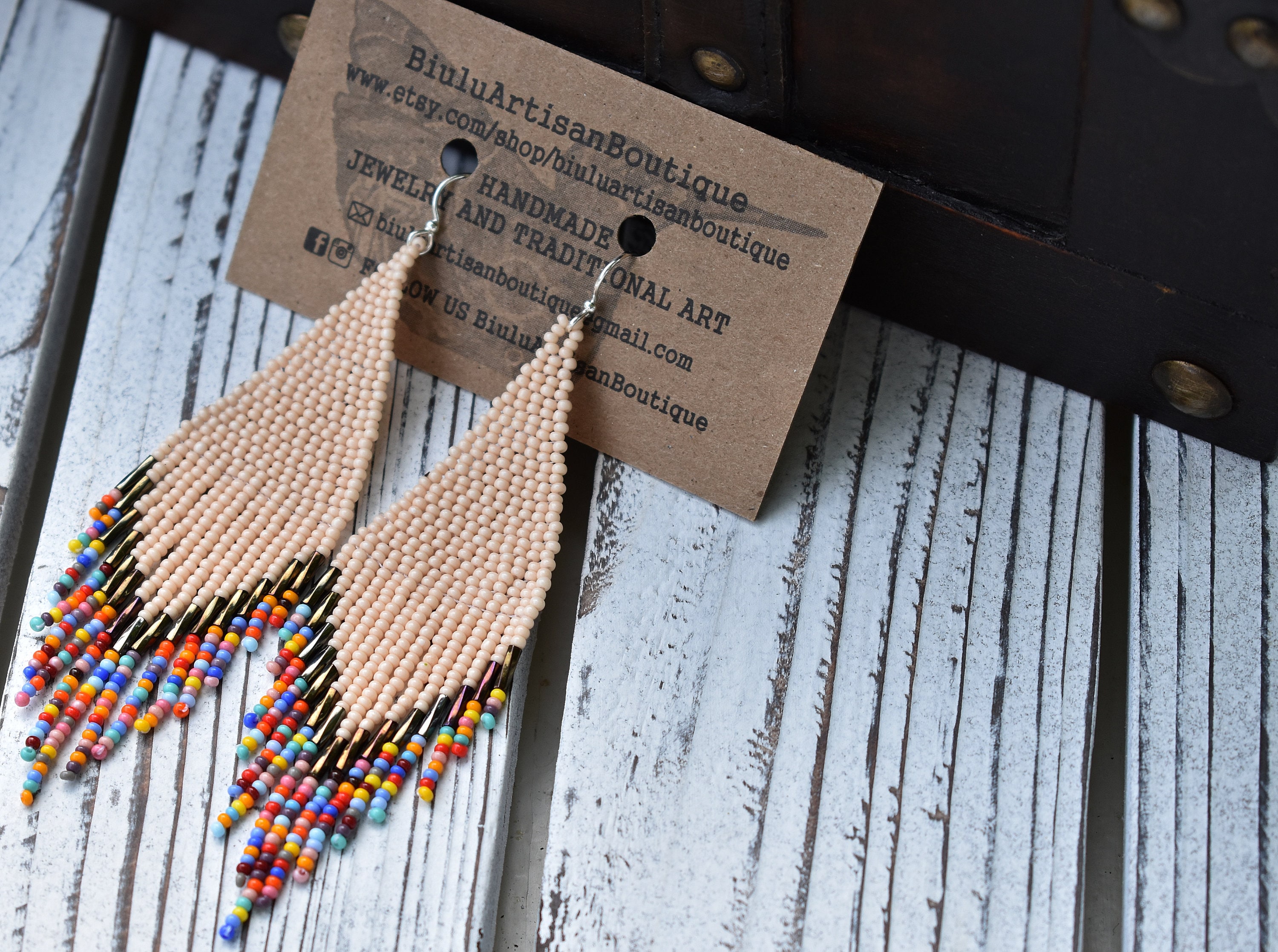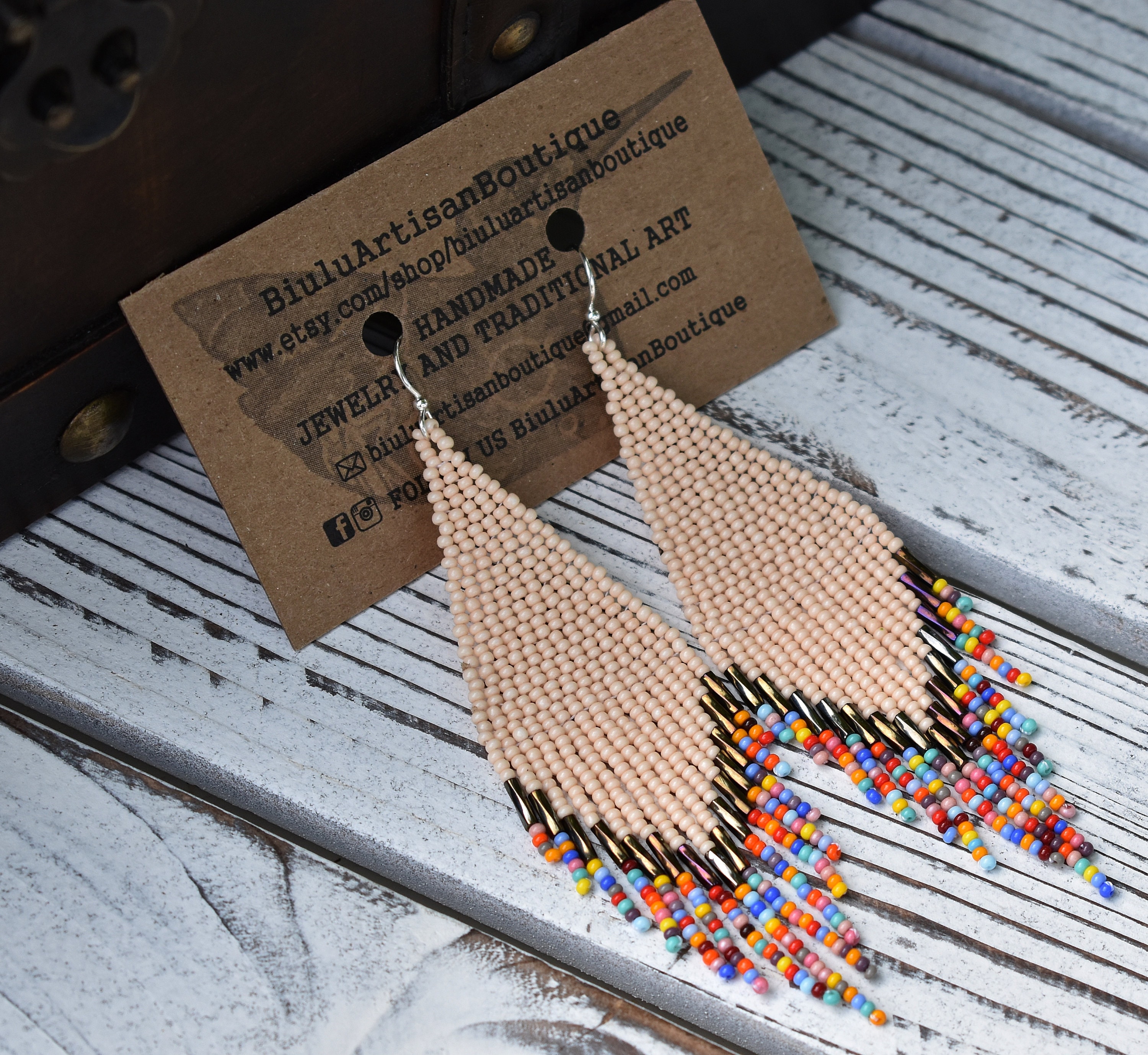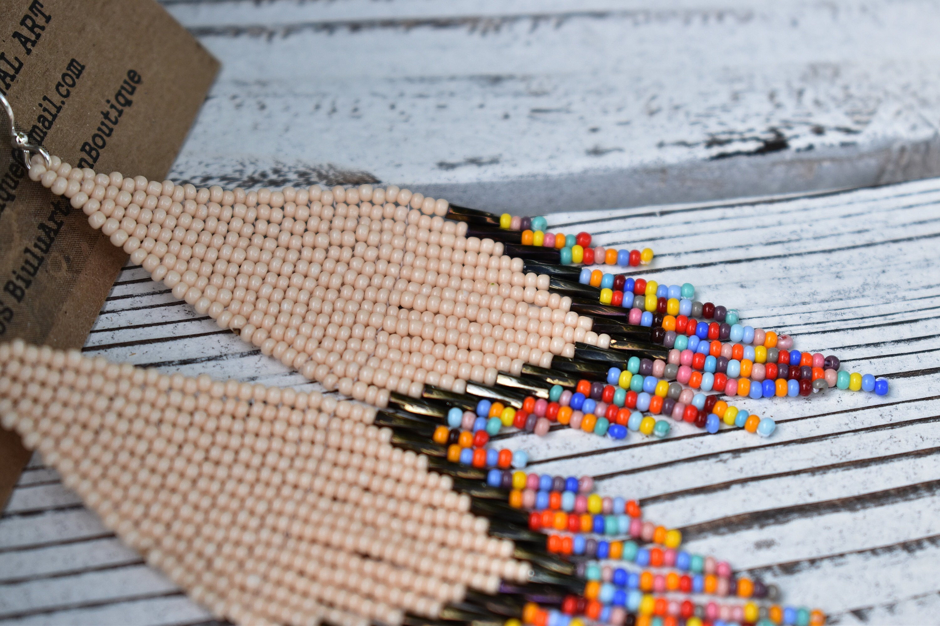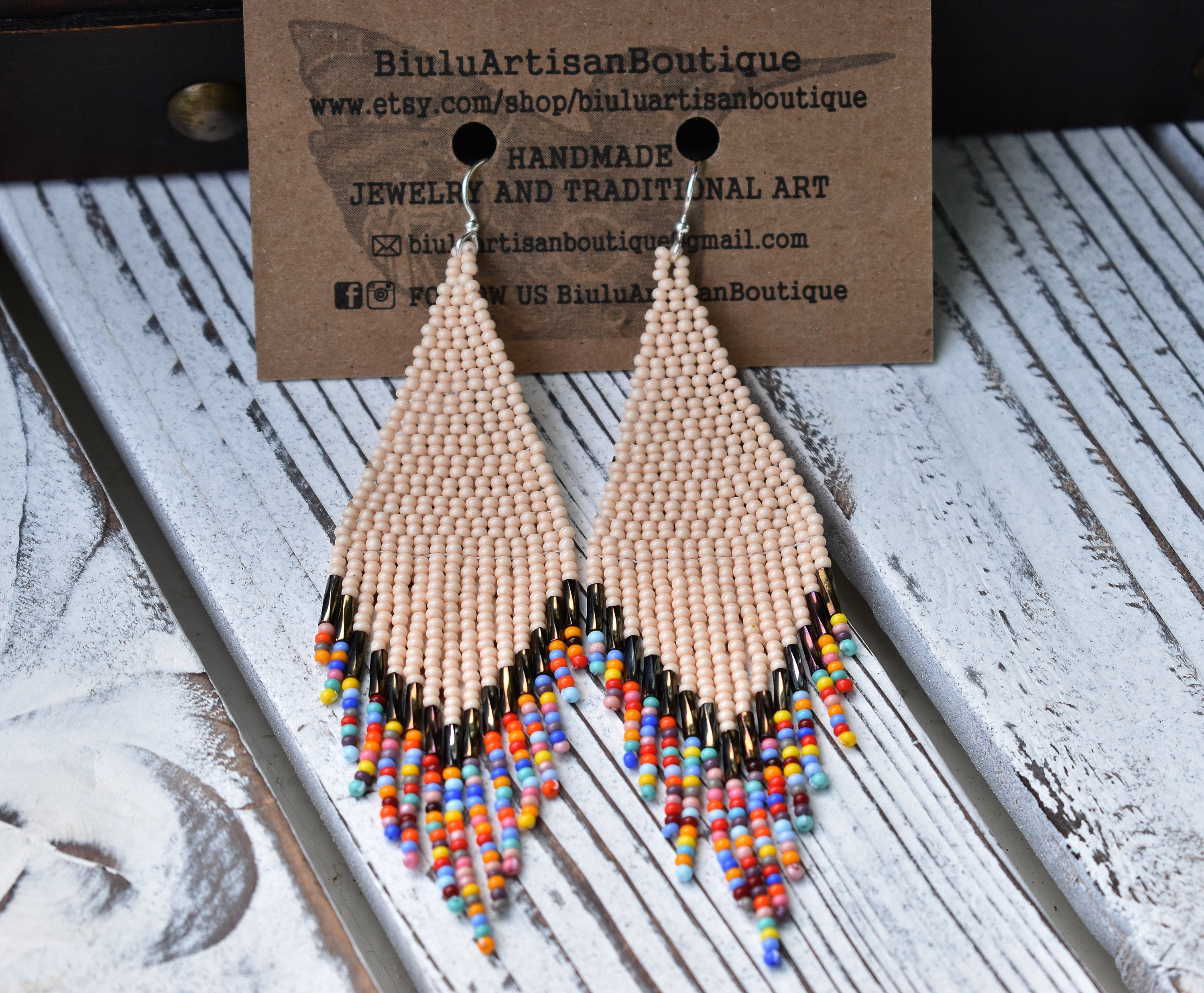 - These stylish boho/contemporary Native style earrings feature a beige body with splashes of color throughout the dangles - a beautiful contrast from conservative (body) to high energy (dangles).