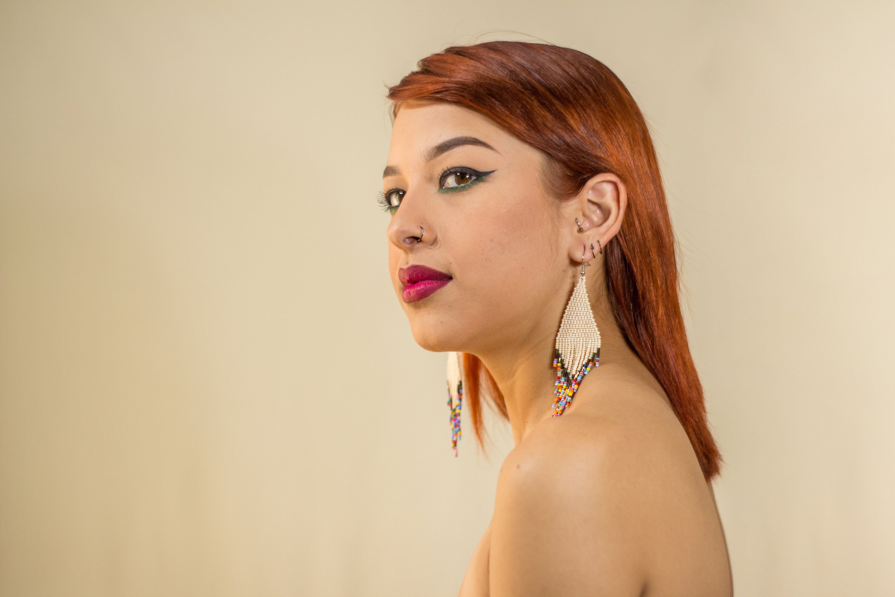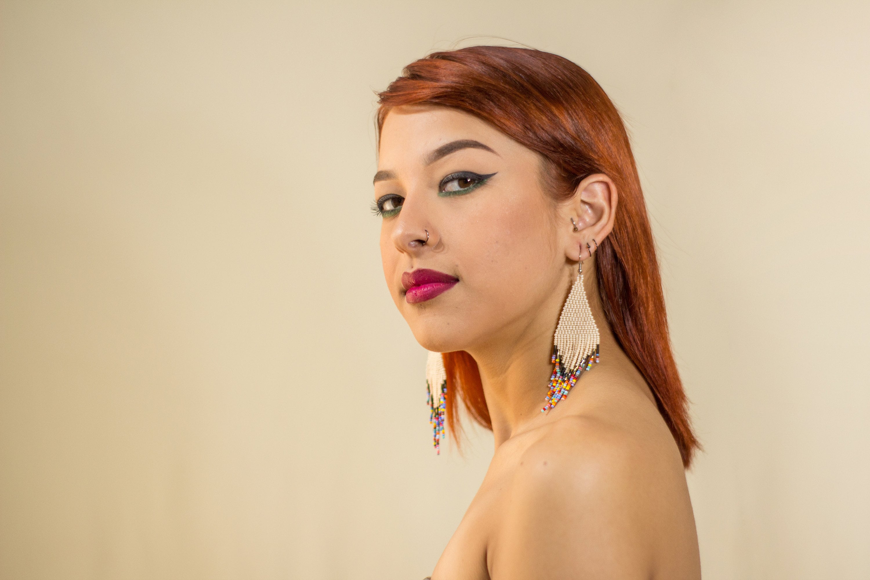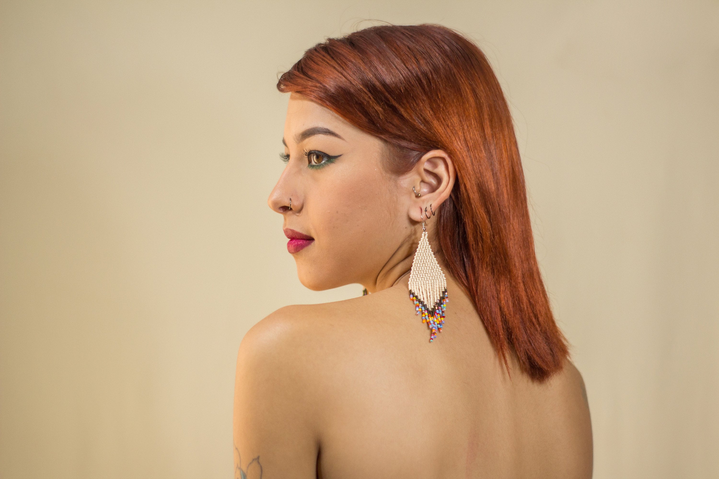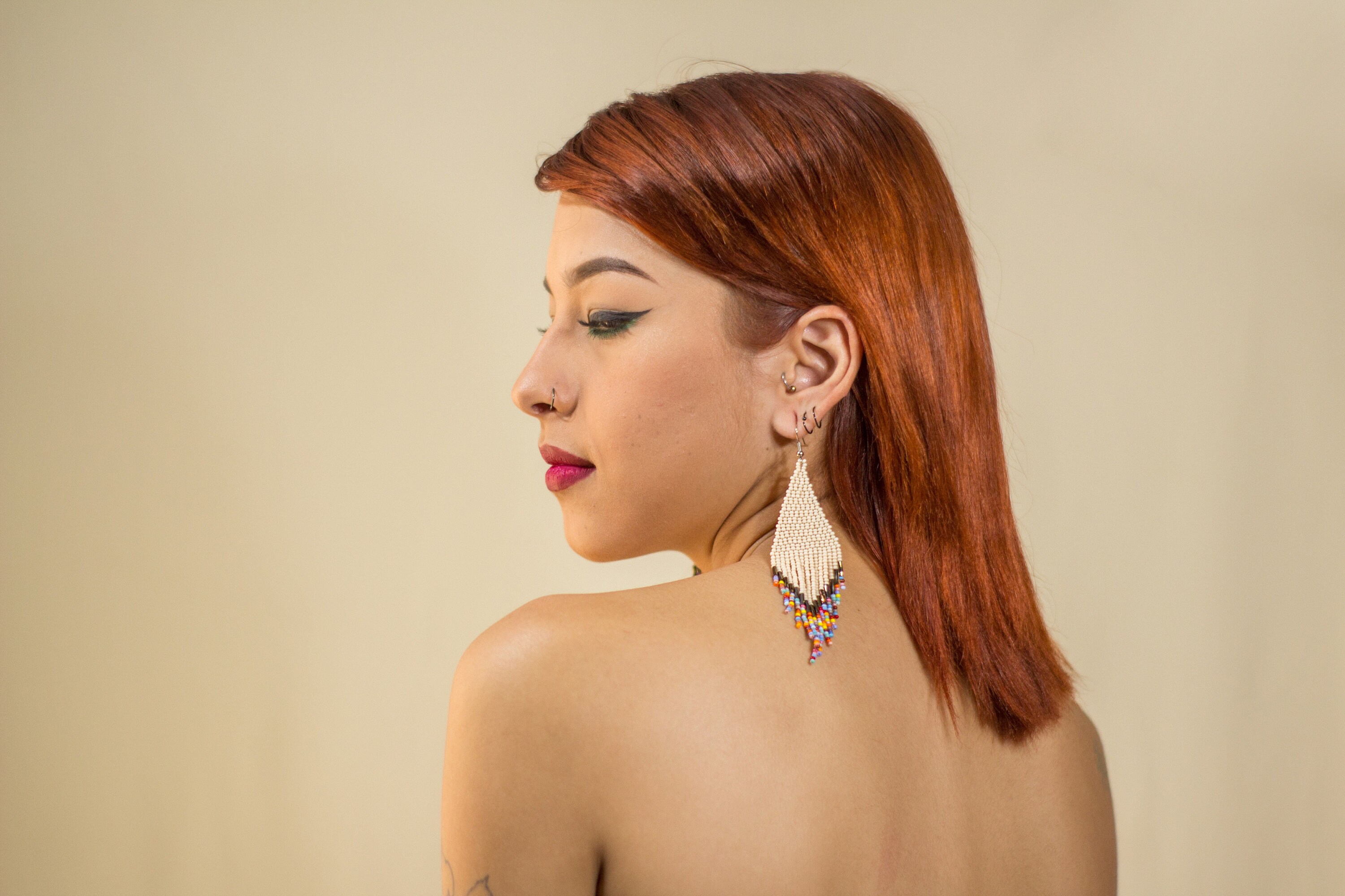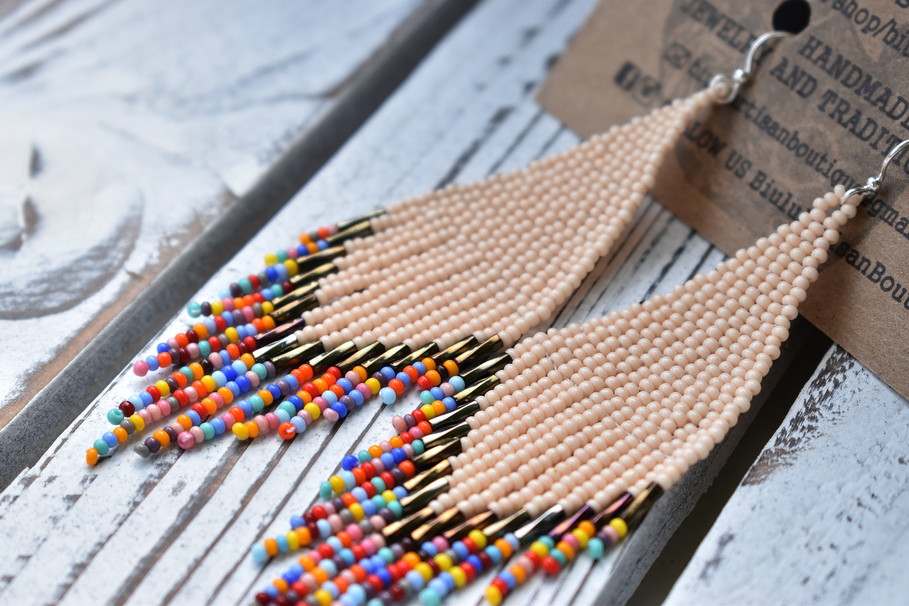 - These stylish boho/contemporary Native style earrings feature a beige body with splashes of color throughout the dangles - a beautiful contrast from conservative (body) to high energy (dangles).