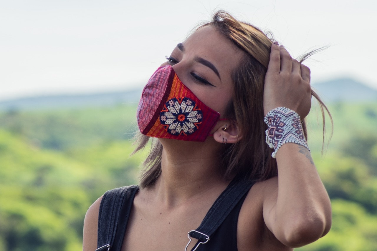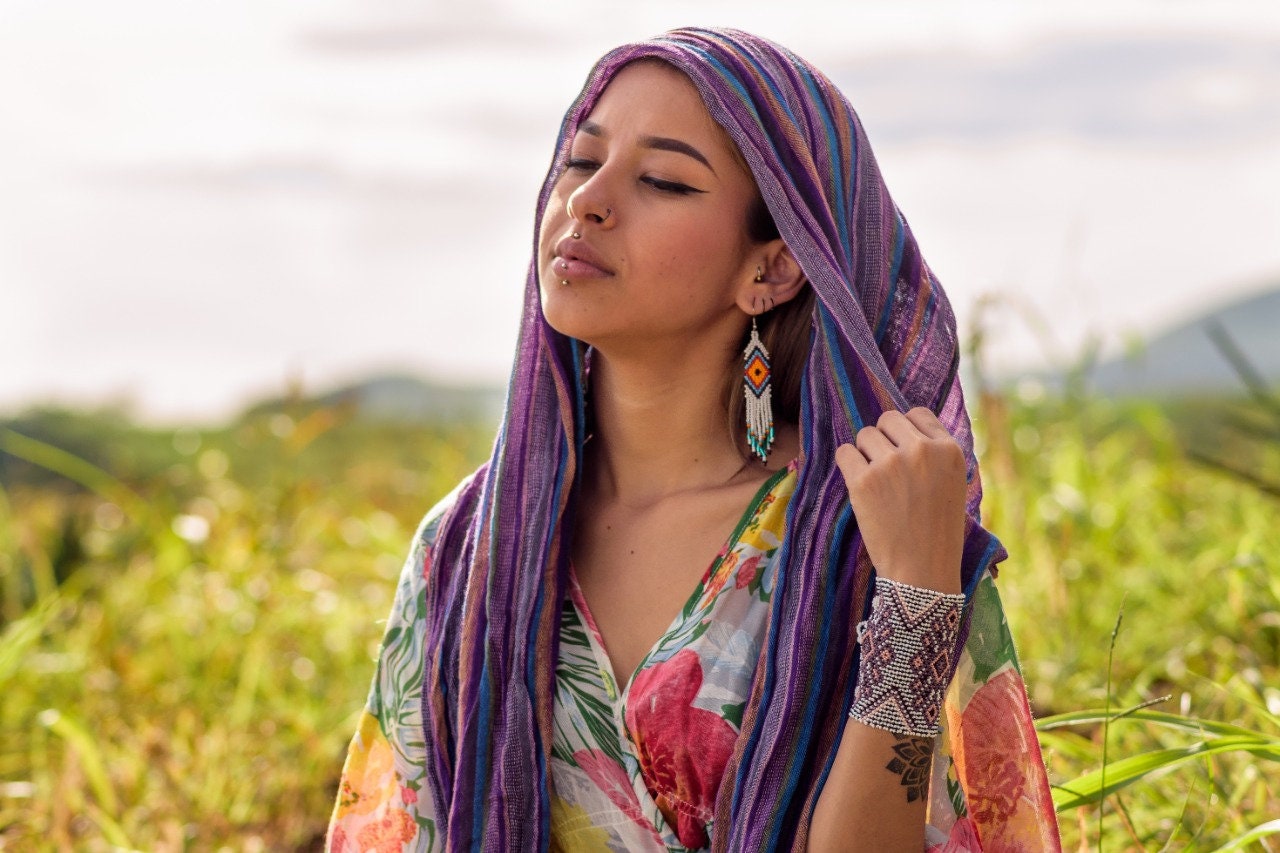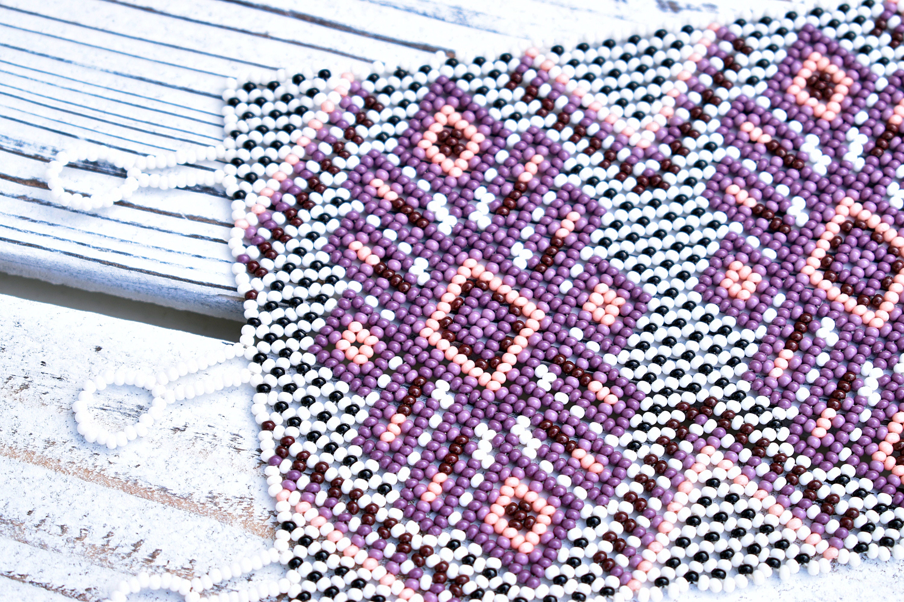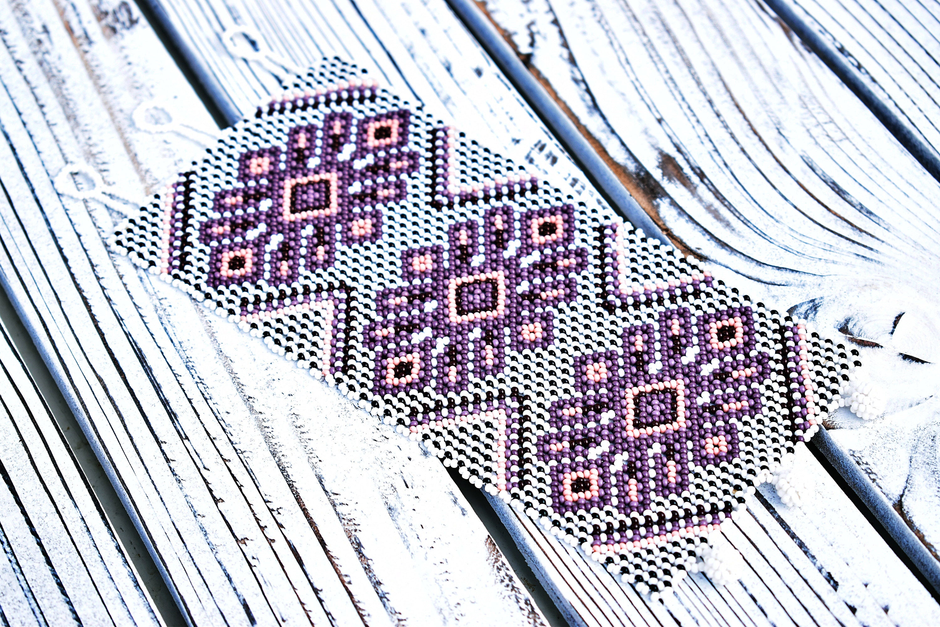 - Black and white make up the body of this luxurious boho-tribal cuff. Purple and pink geometric, peyote-inspired patterns "pop", creating contrast down the center. This bracelet does not only wear on the wrist but it completely owns it and adds a measure of exotic beauty to whatever you're wearing.