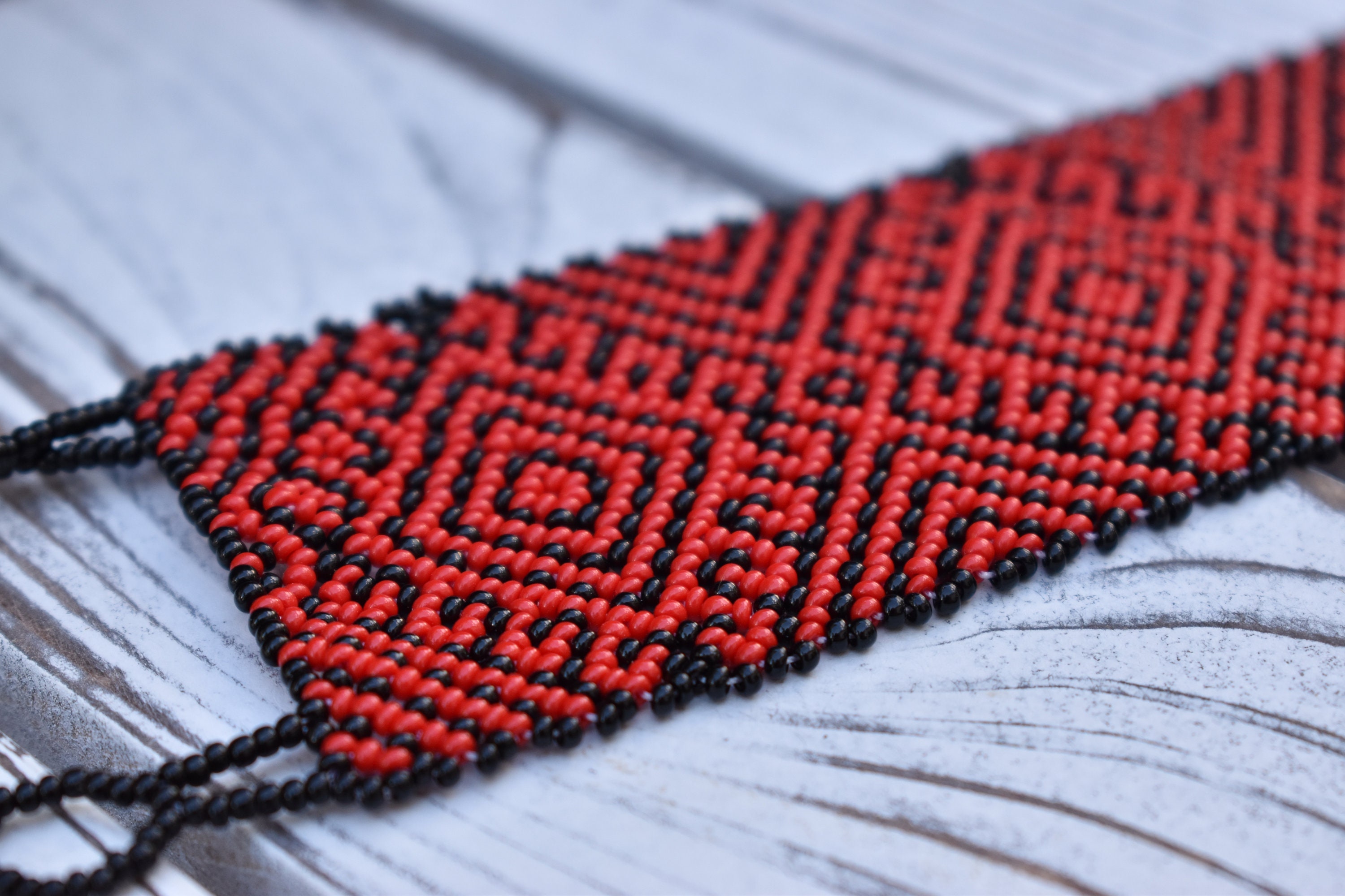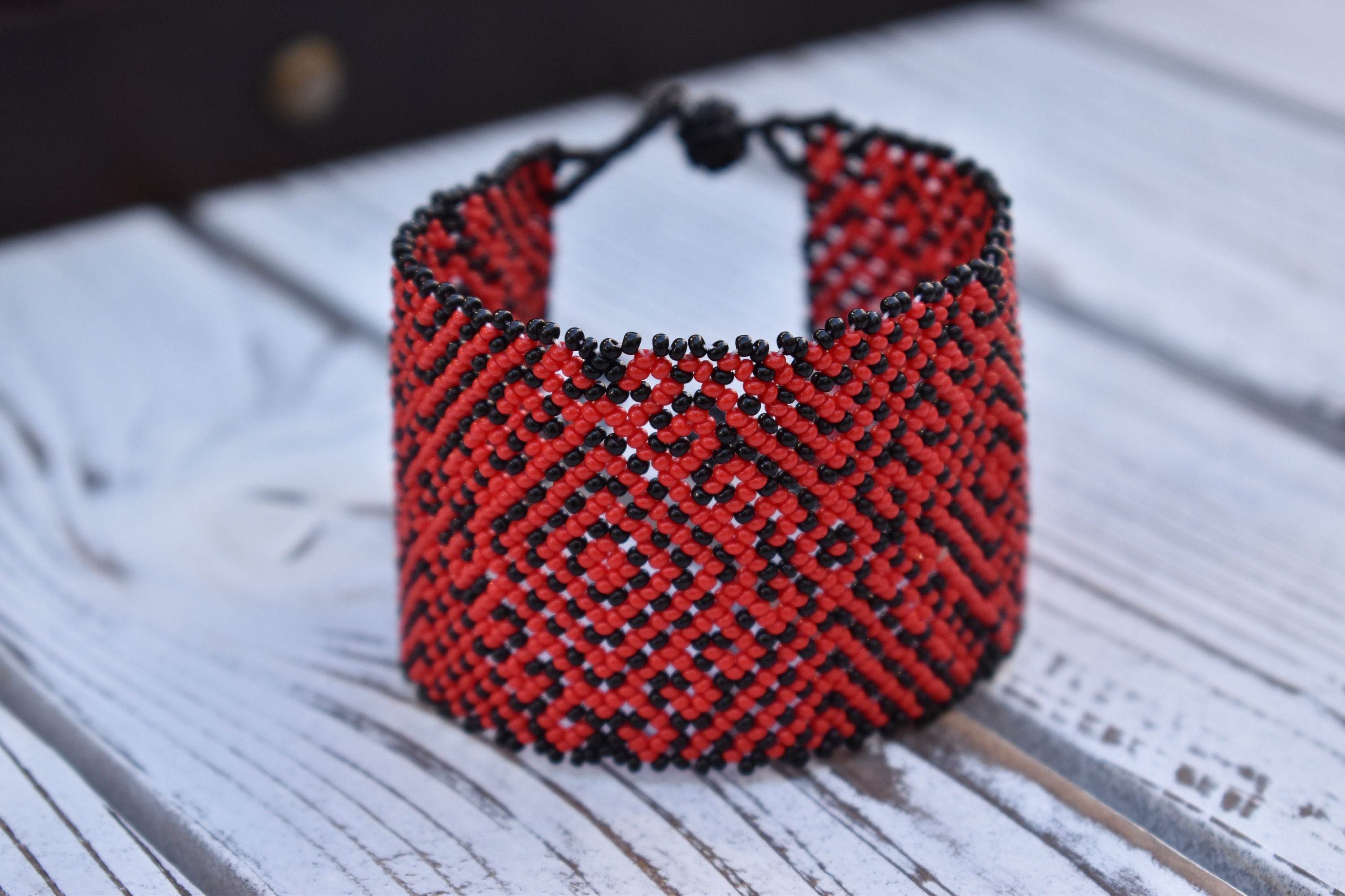 - This beaded cuff bracelet features bright red contrasted against black. The band has good width at 2" and definitely maintains a solid presence on the wrist.