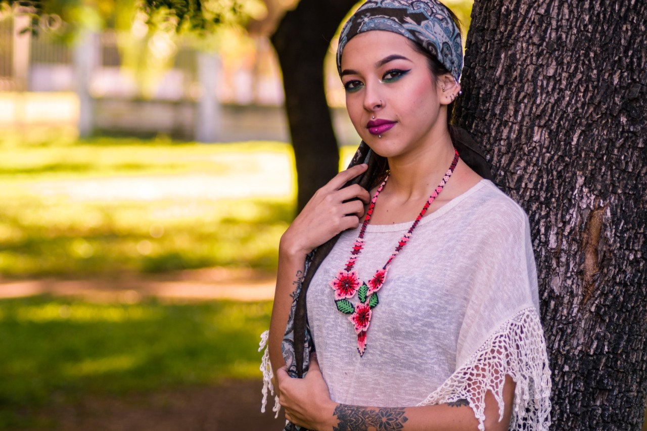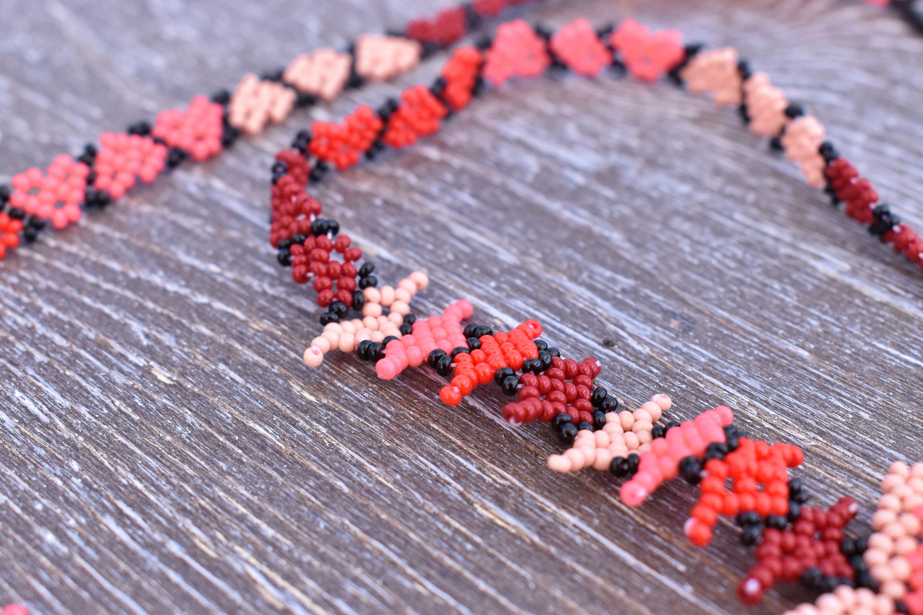 This vibrant and color "popping", contemporary boho/Huichol style necklace features a beautiful blend of pinks and reds.