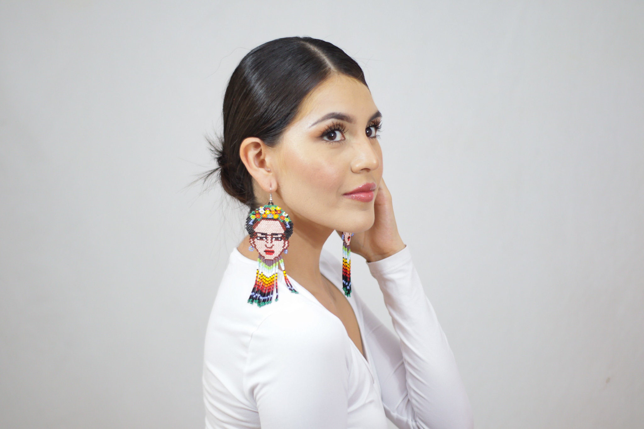 - These large figure earrings feature an indigenous woman with a floral headdress and earrings. The colorful dangles add splashes of color down to the shoulder tops.