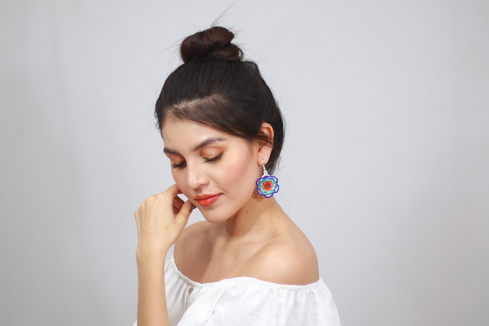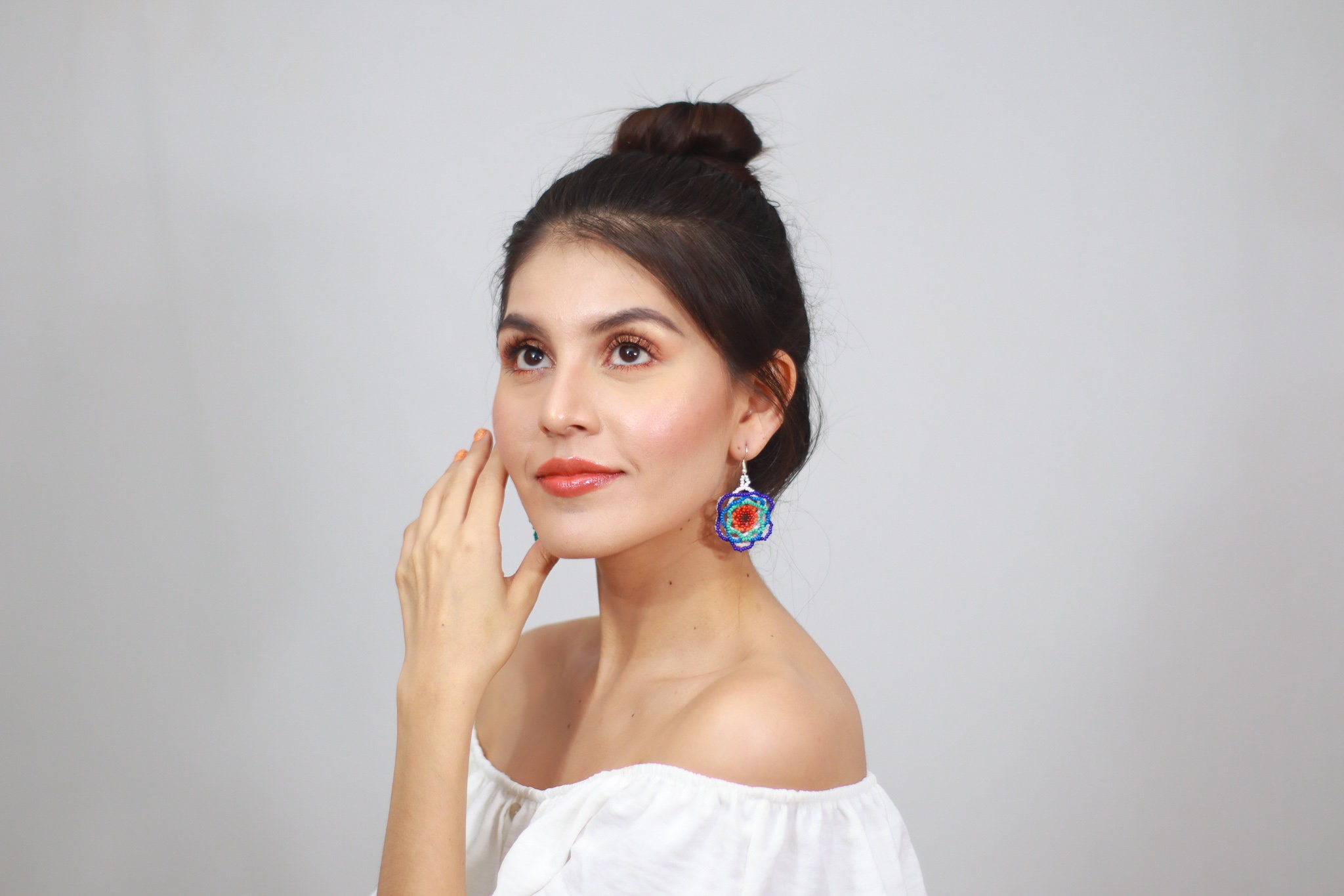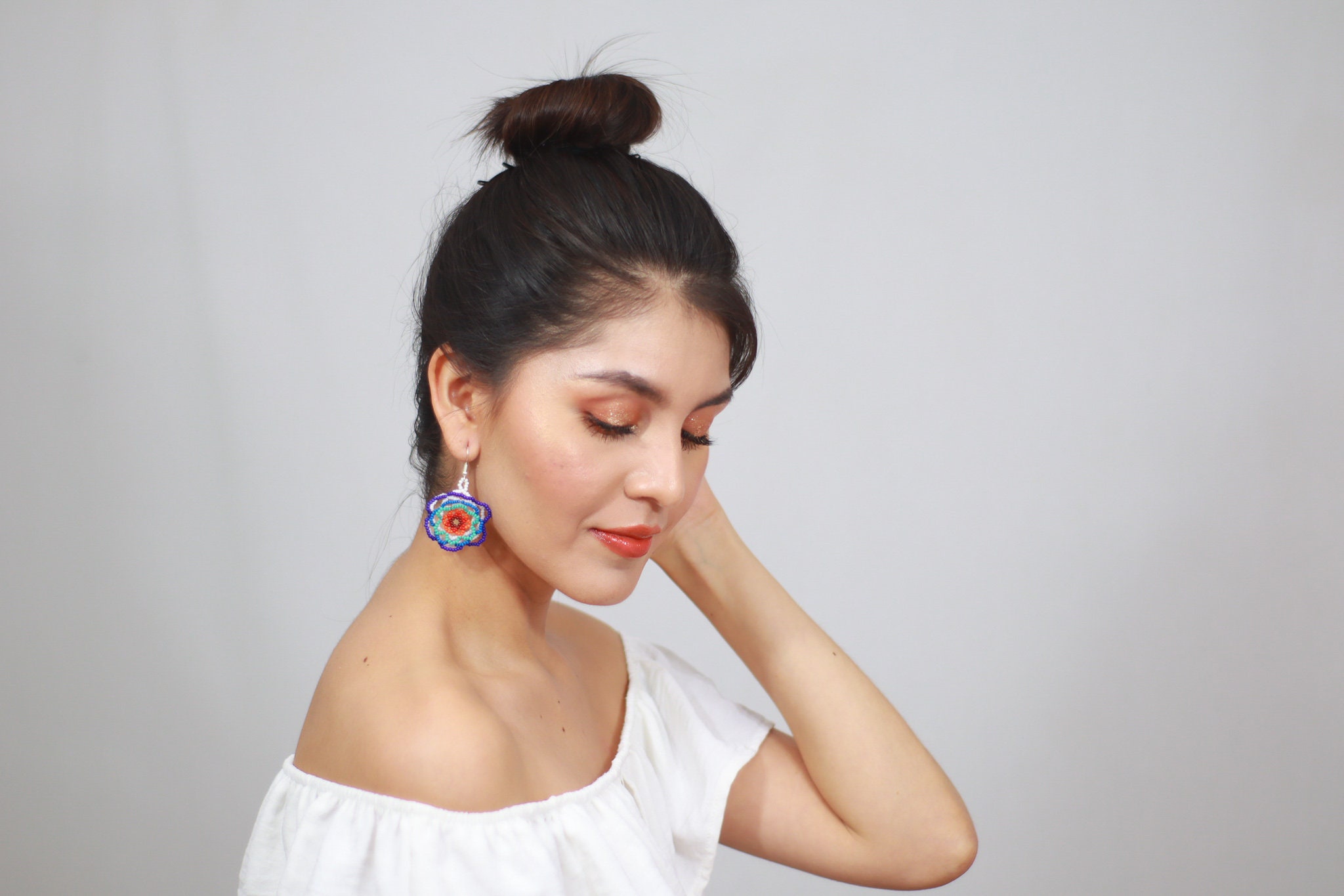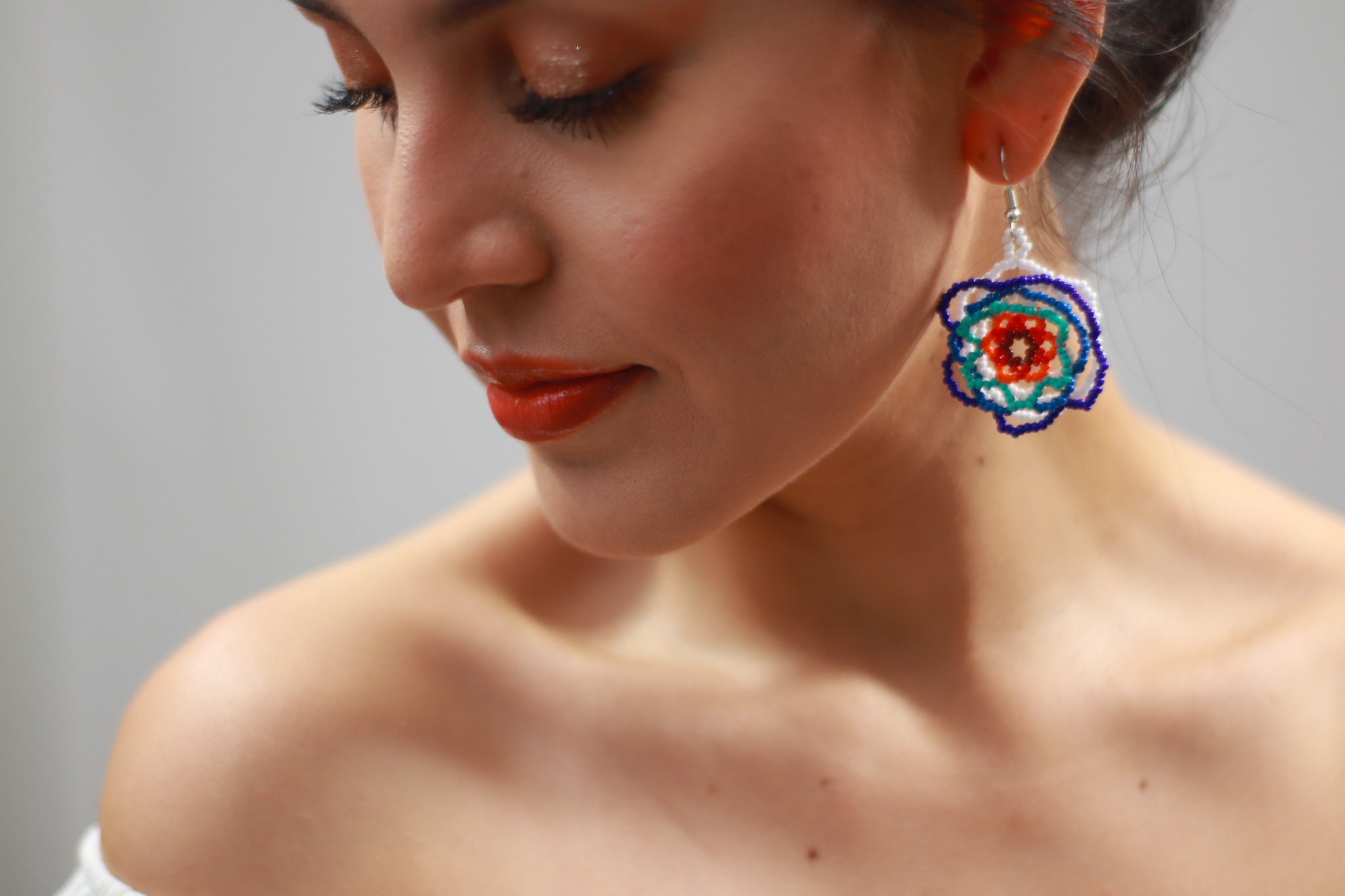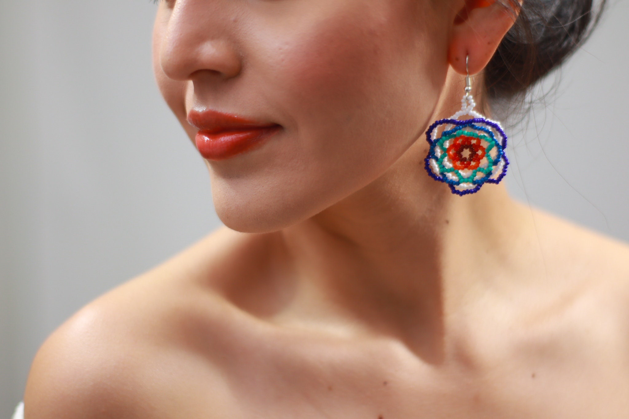 - These hand beaded earrings feature a lightweight floral design with layers of cobalt, lapis and turquoise blues against white and a red and orange center. The earrings are not flat and they project outwards creating a 3D lushness.