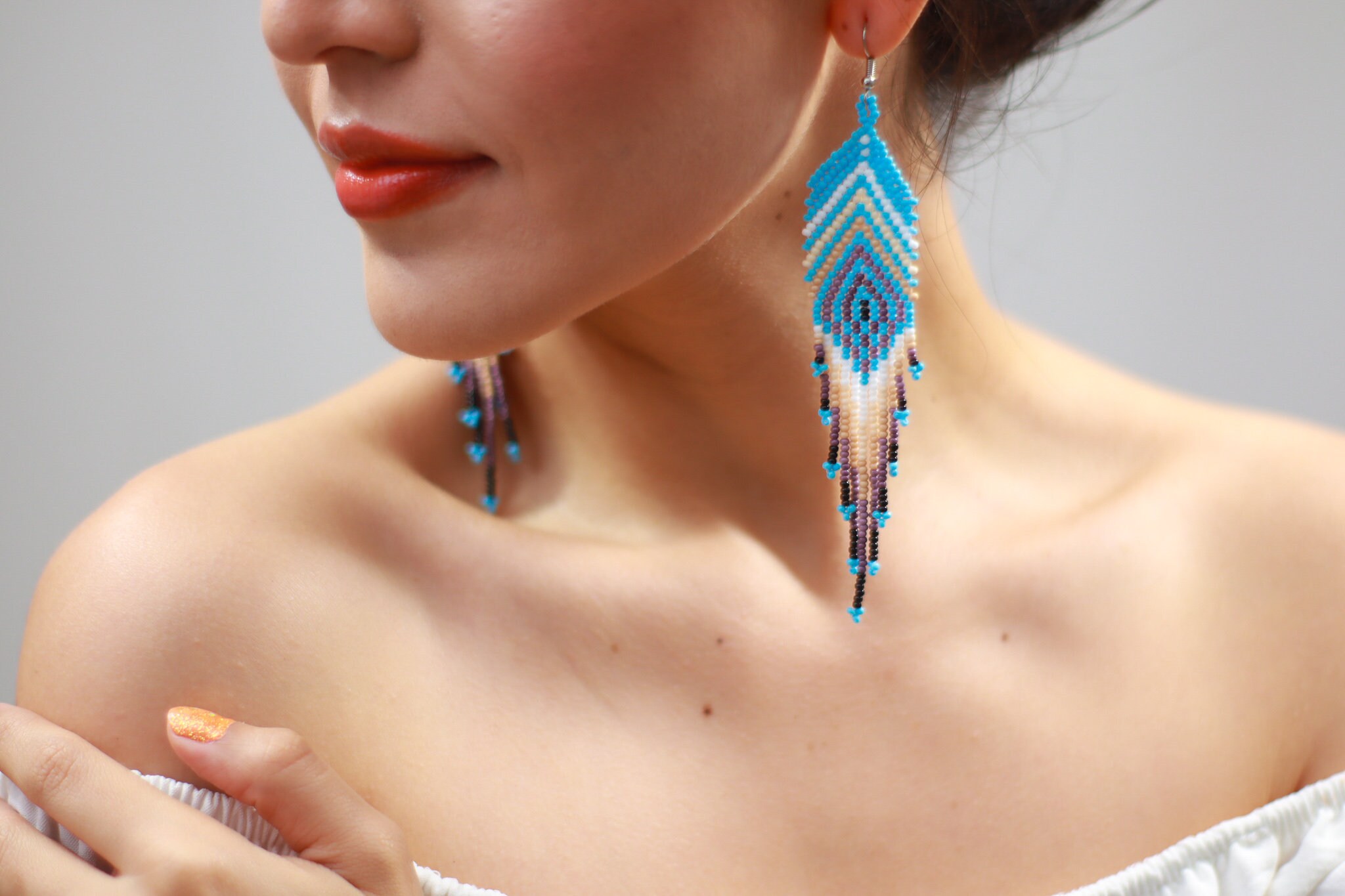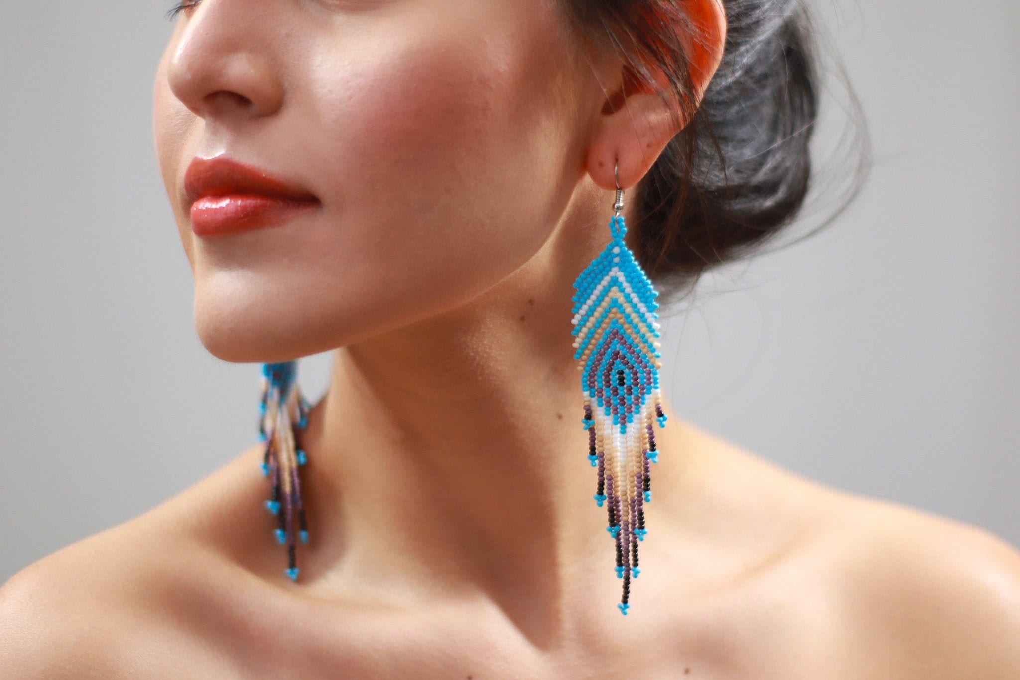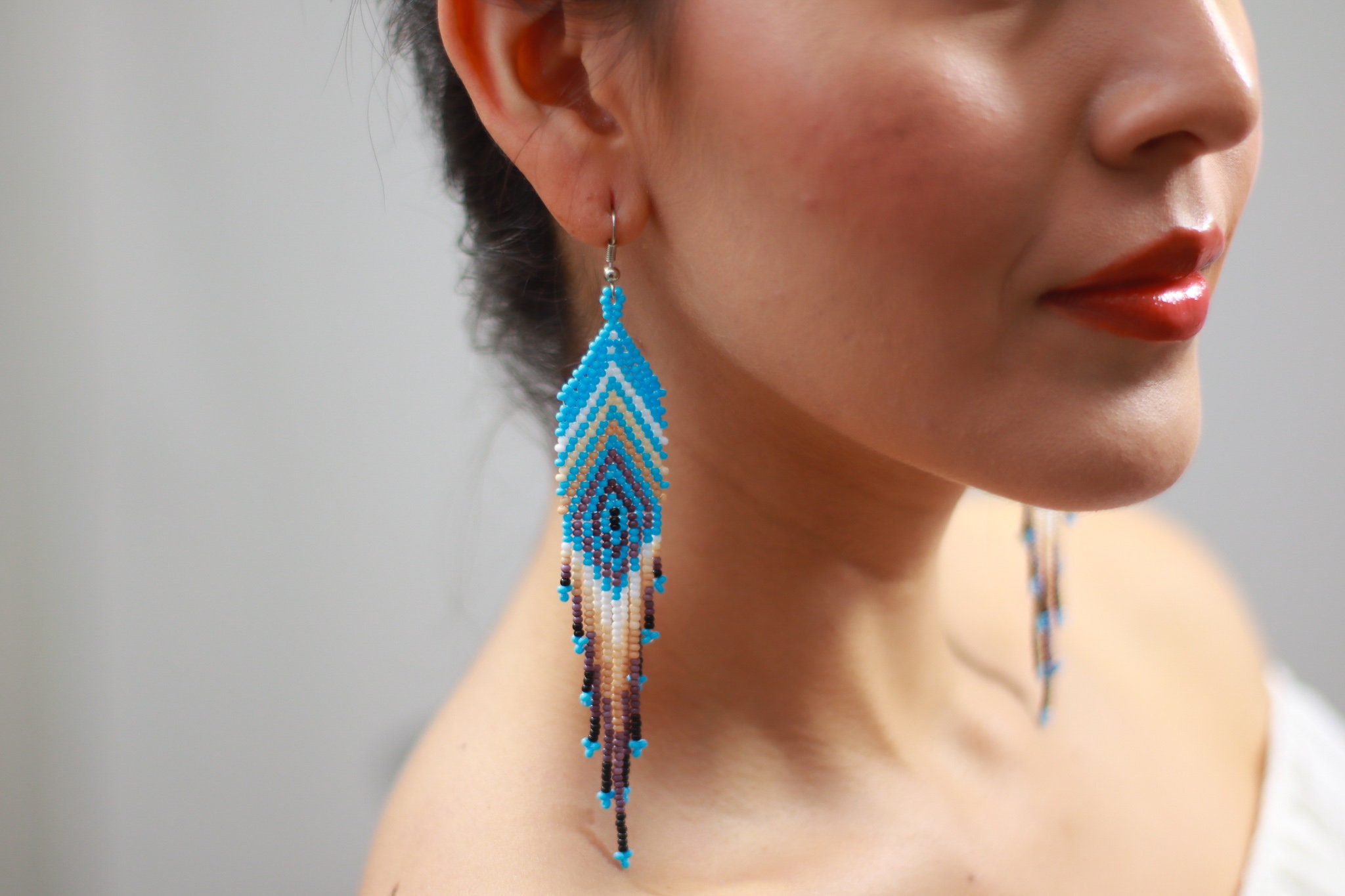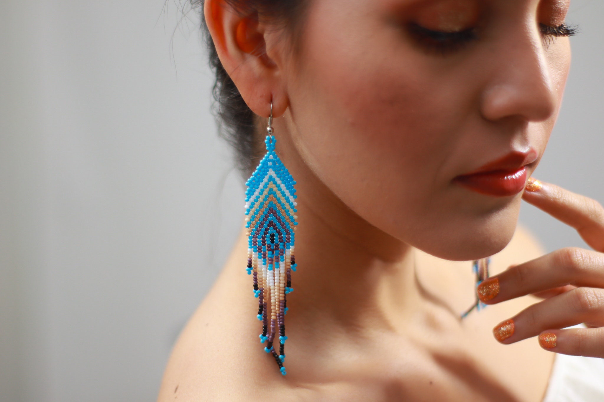 These beaded earrings feature a feather inspired design with a sky blue base. Earthy tones throughout the pattern create a soft contrast.