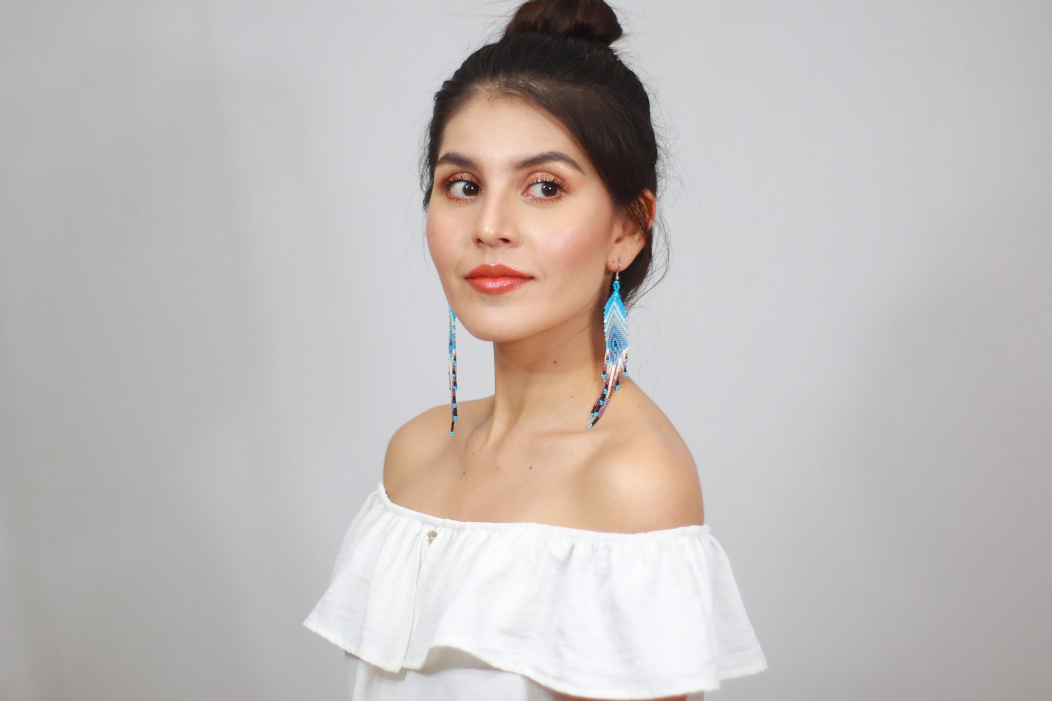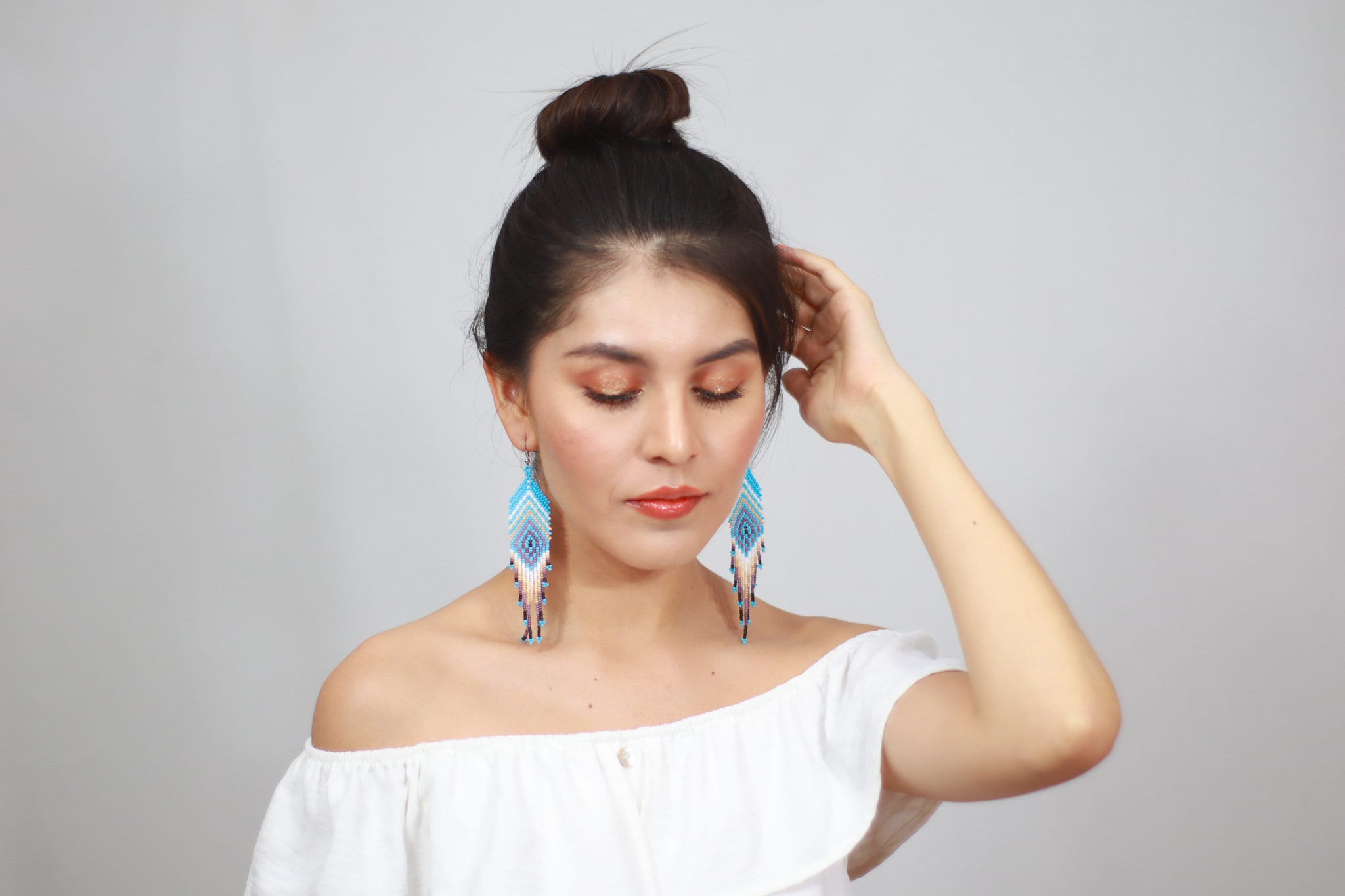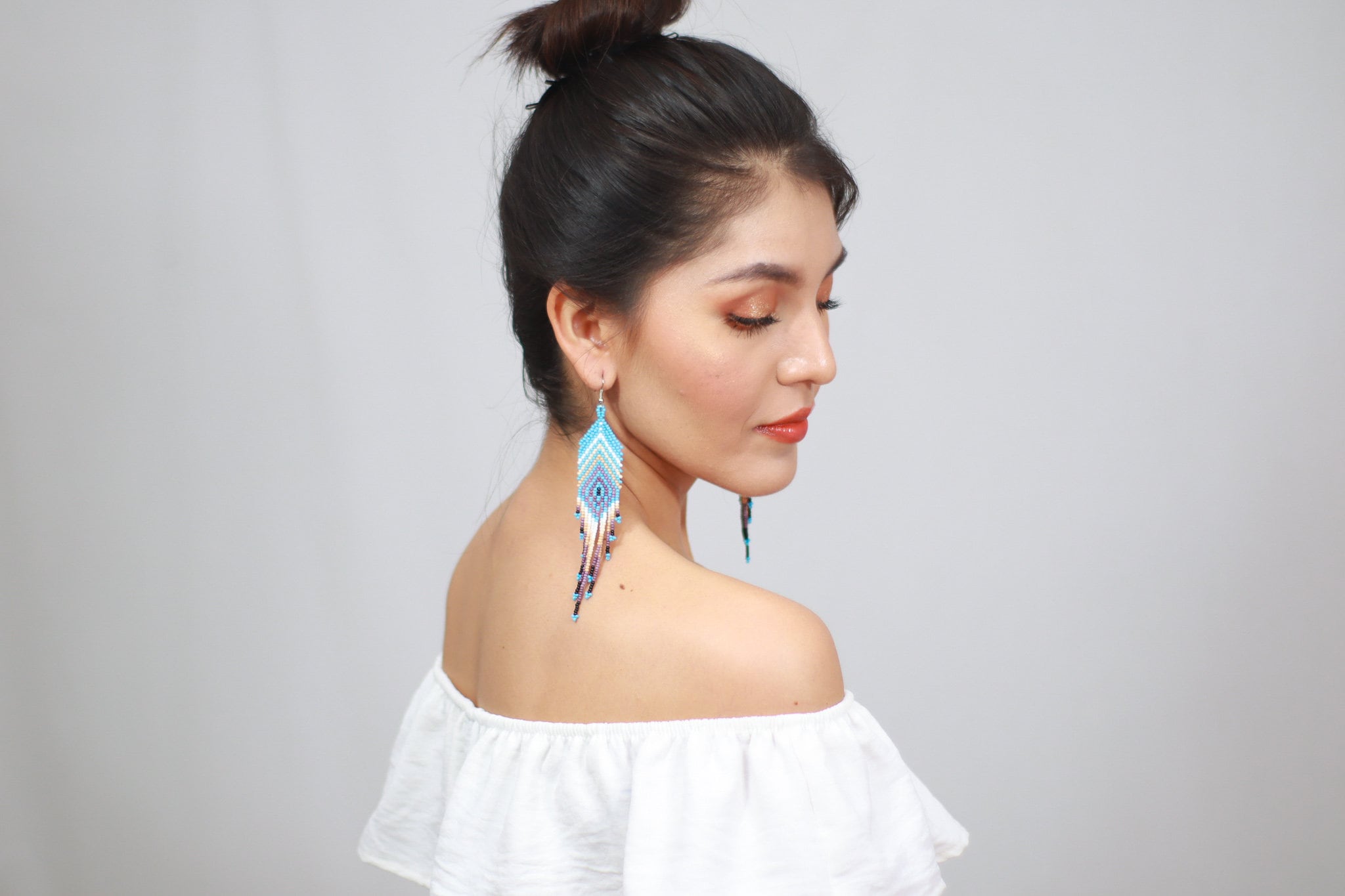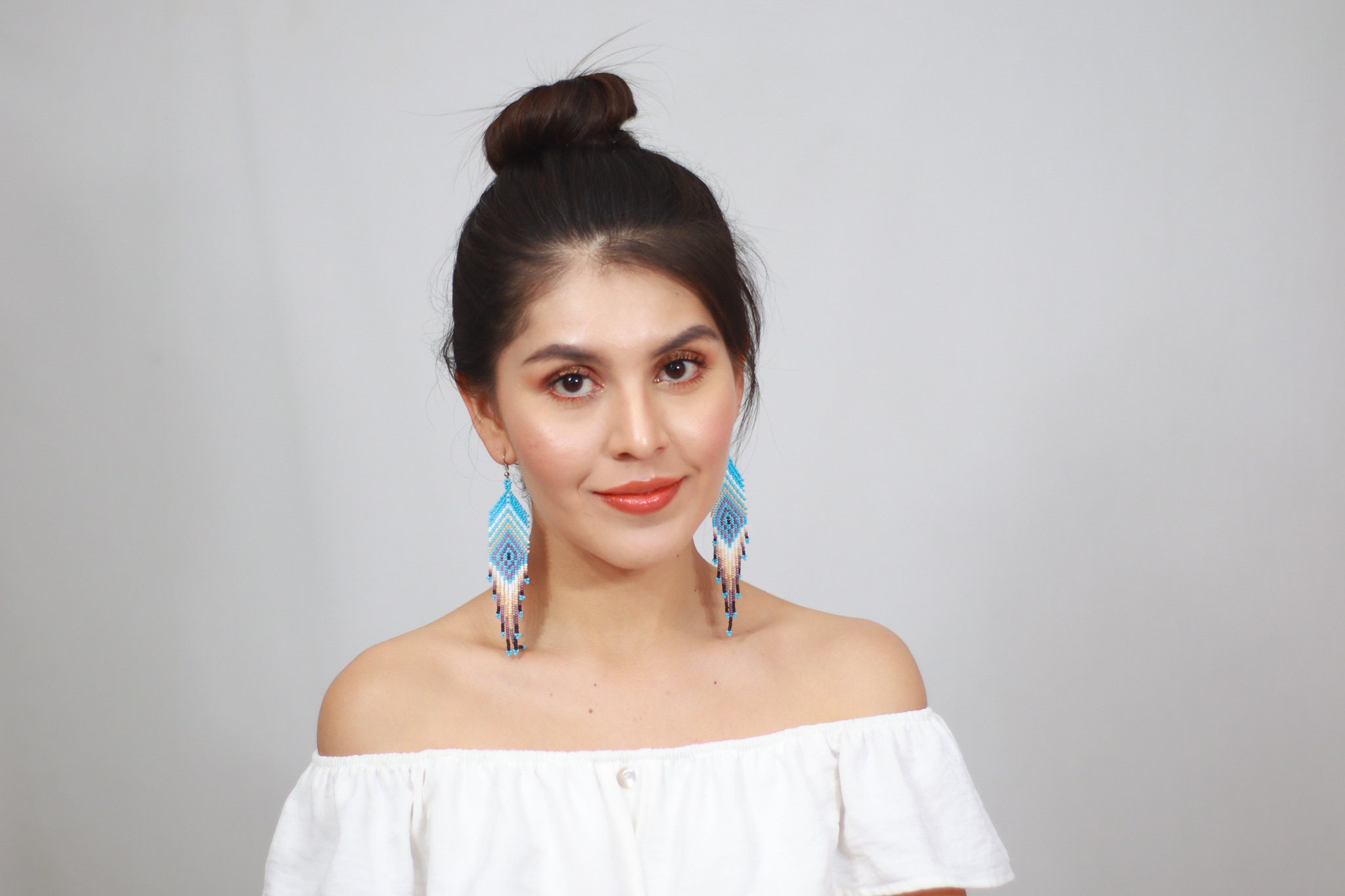 These beaded earrings feature a feather inspired design with a sky blue base. Earthy tones throughout the pattern create a soft contrast.