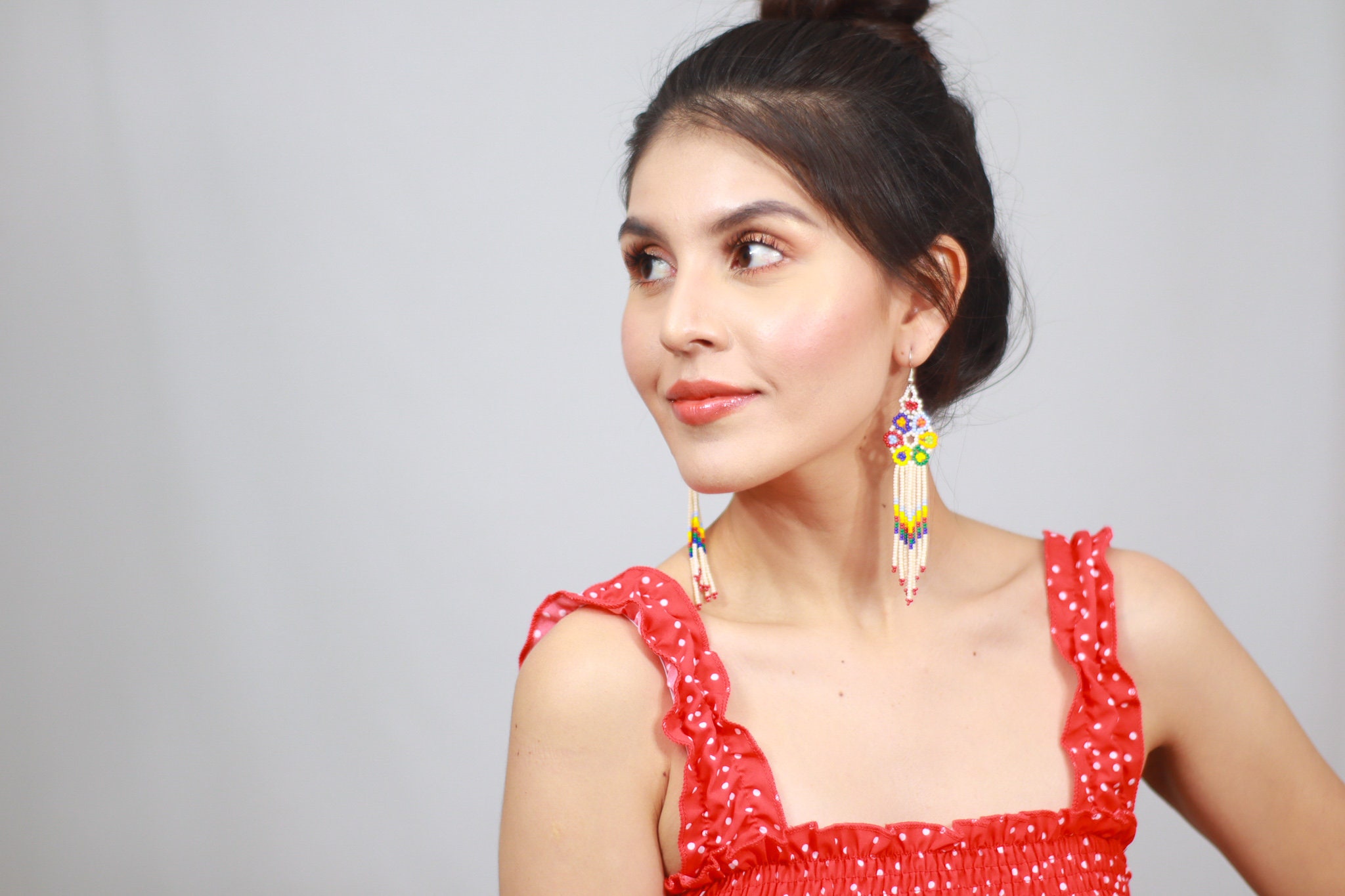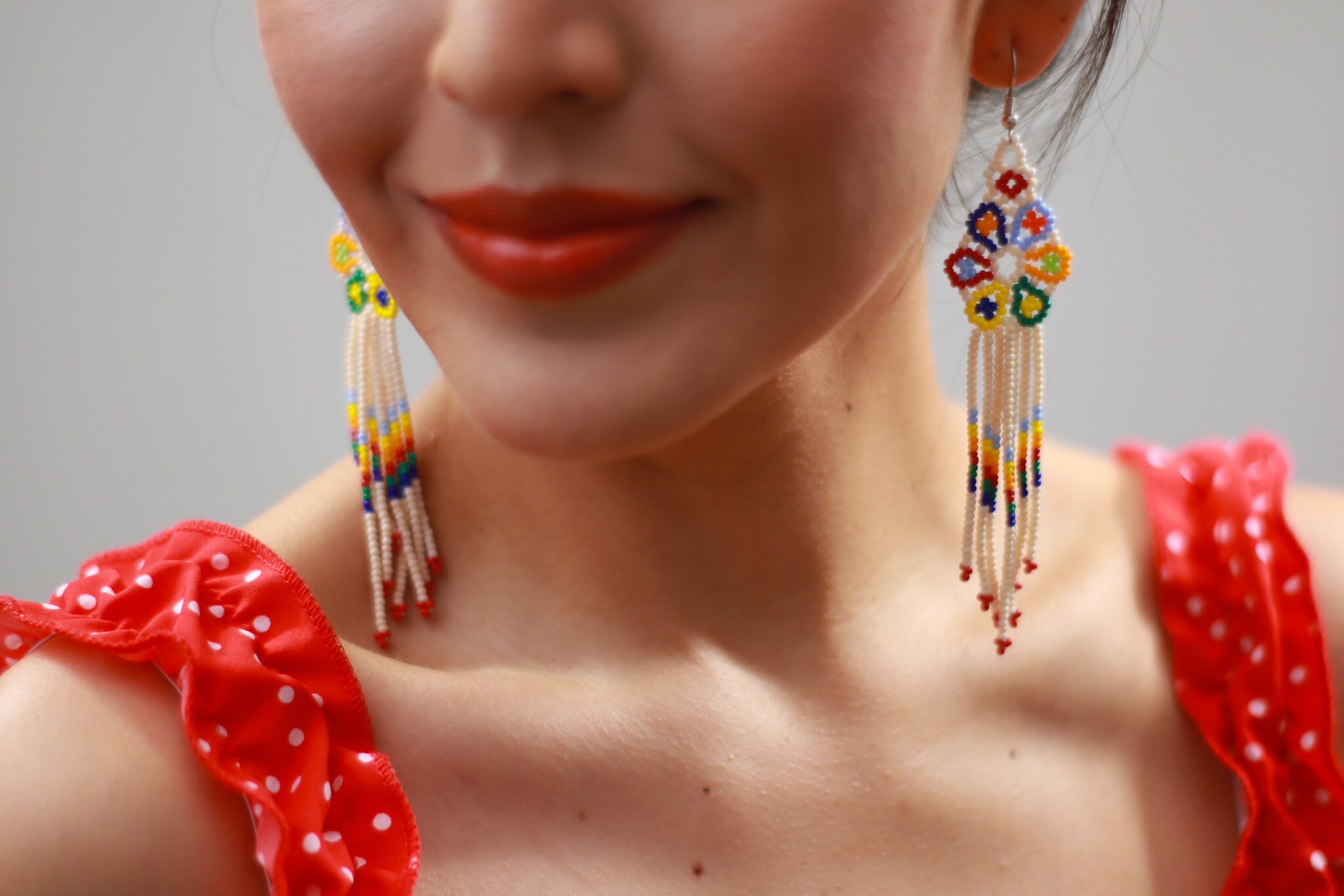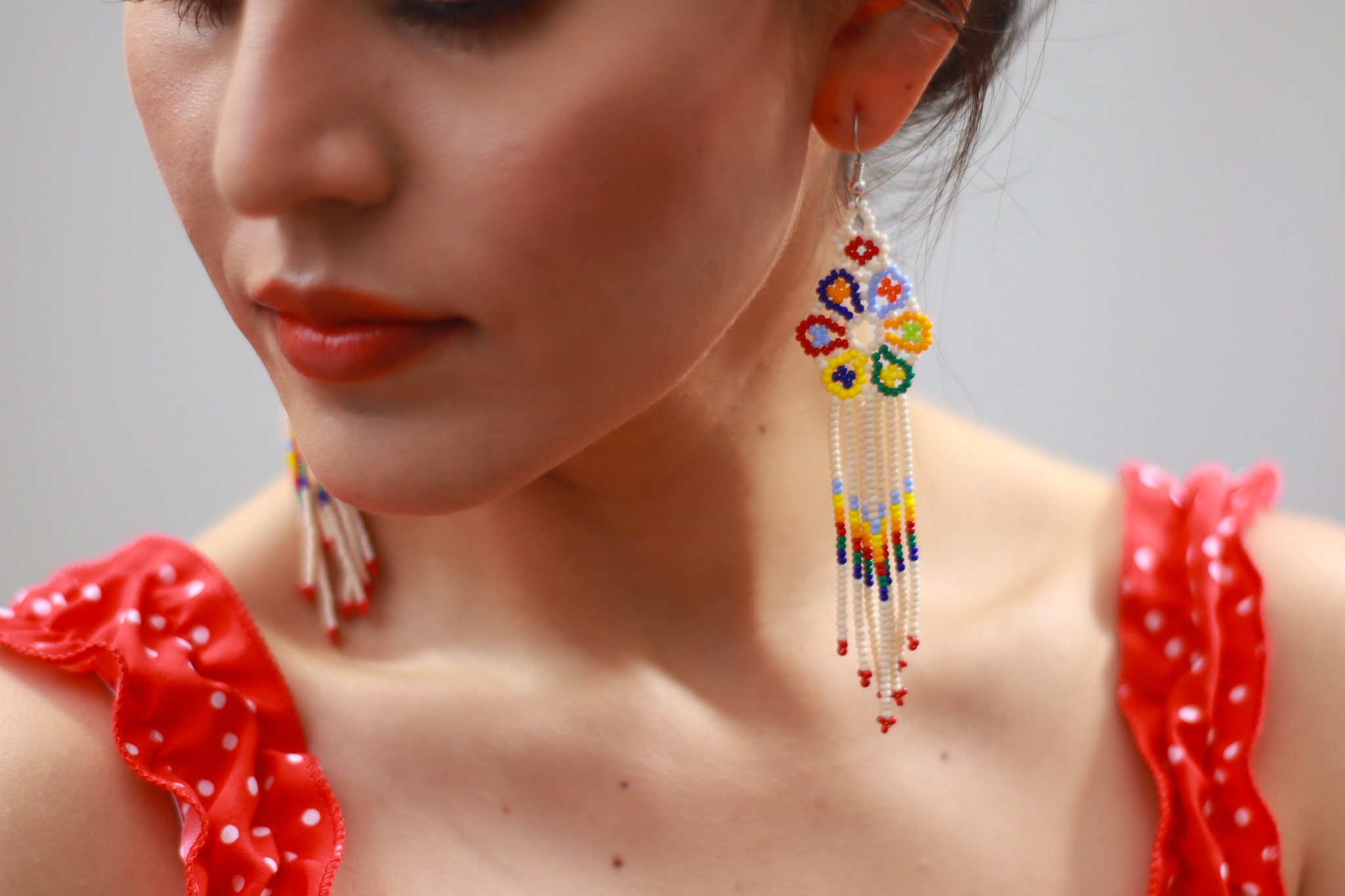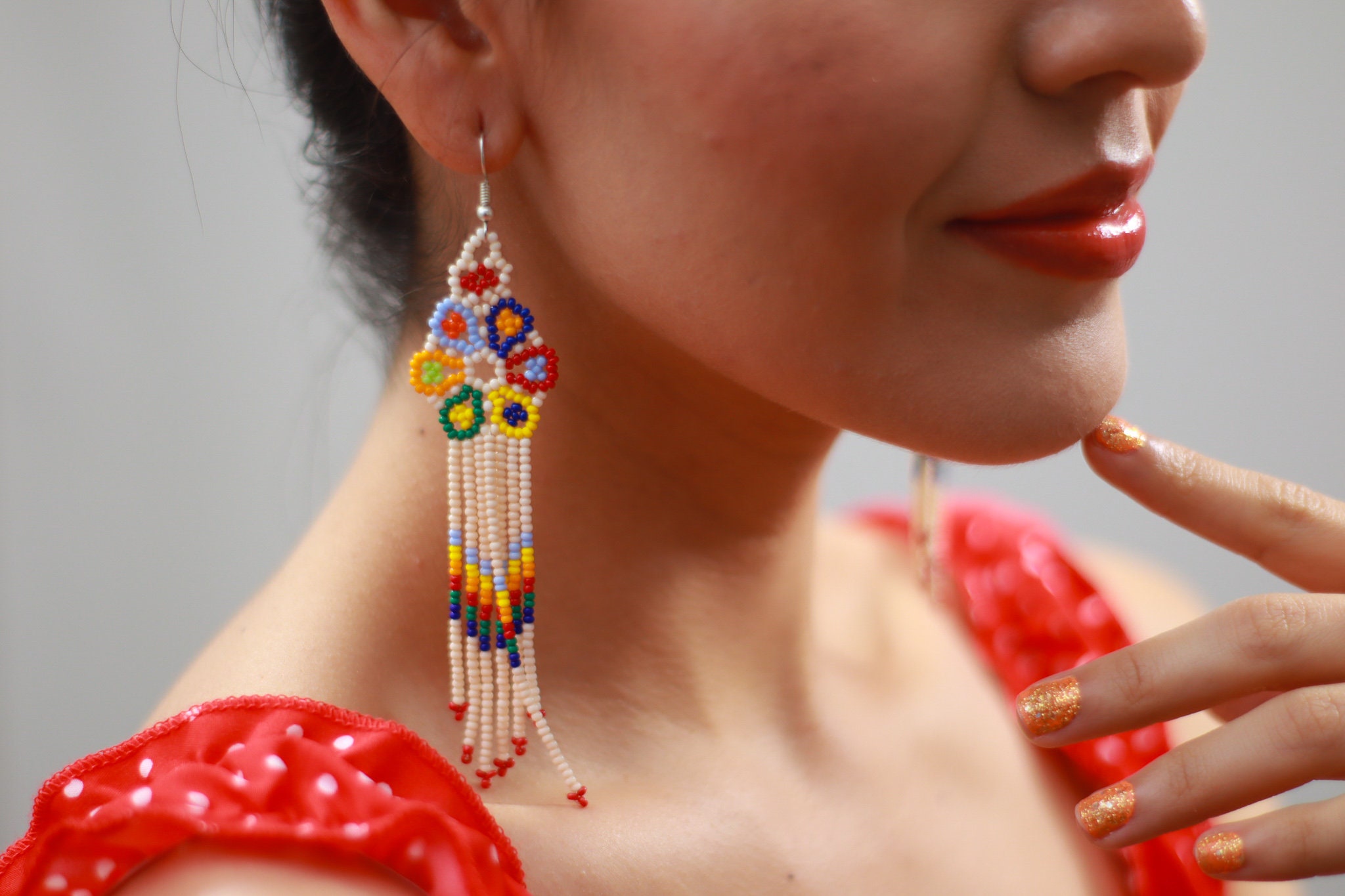 - These cream color based beaded earrings feature a lightweight peyote "flower" design with bright and rich complementary colors. They are a great balance between size and weight and will brighten up any outfit with their big presence.