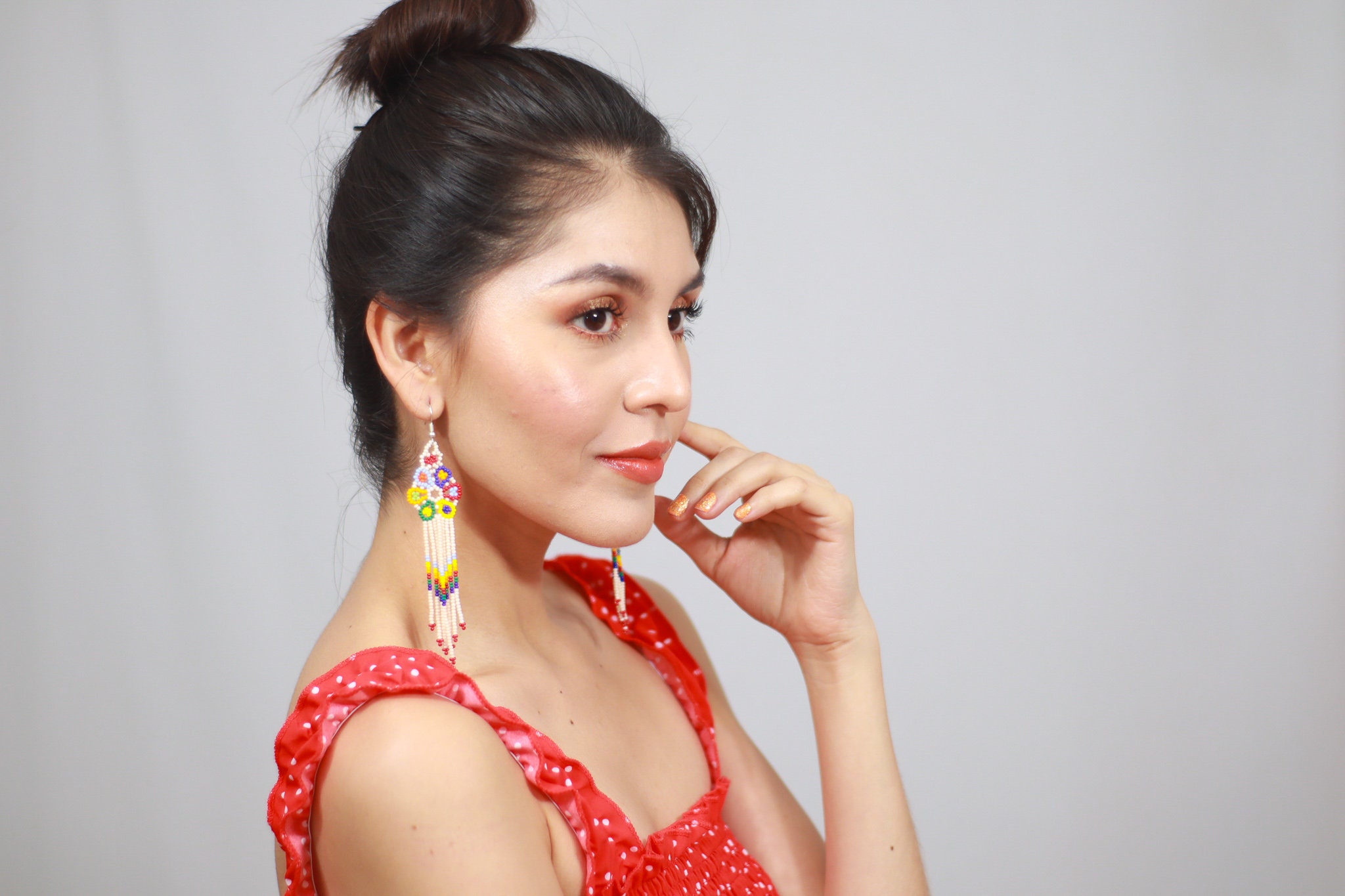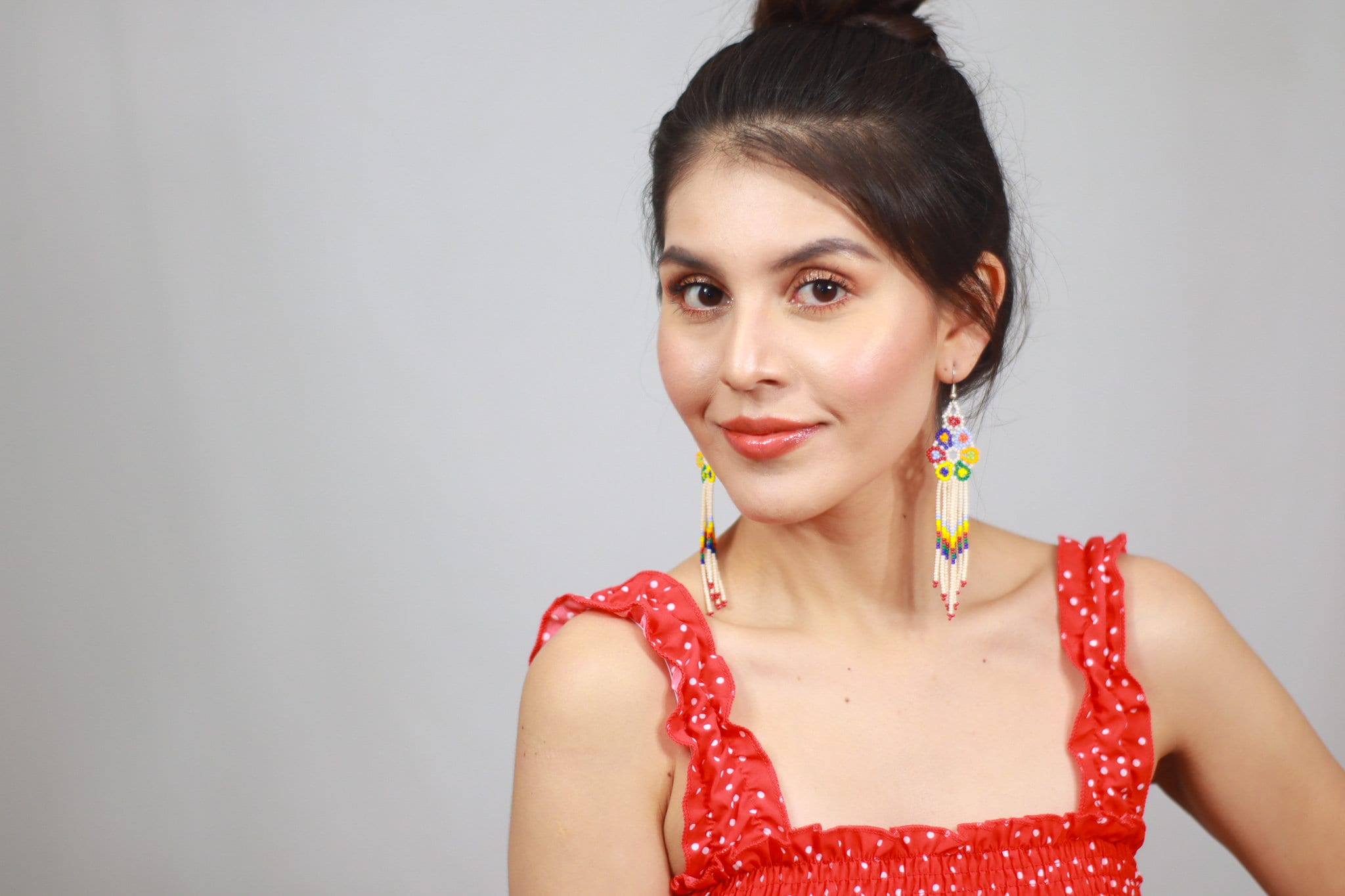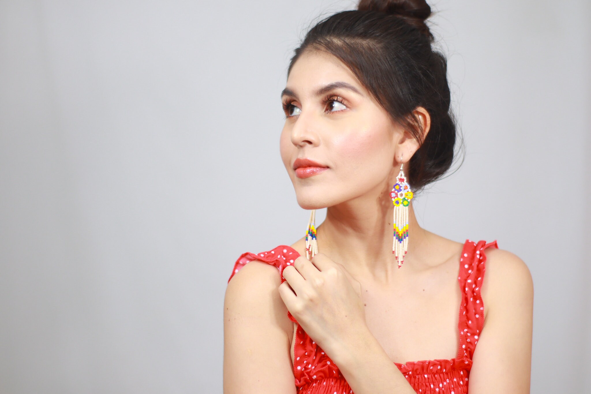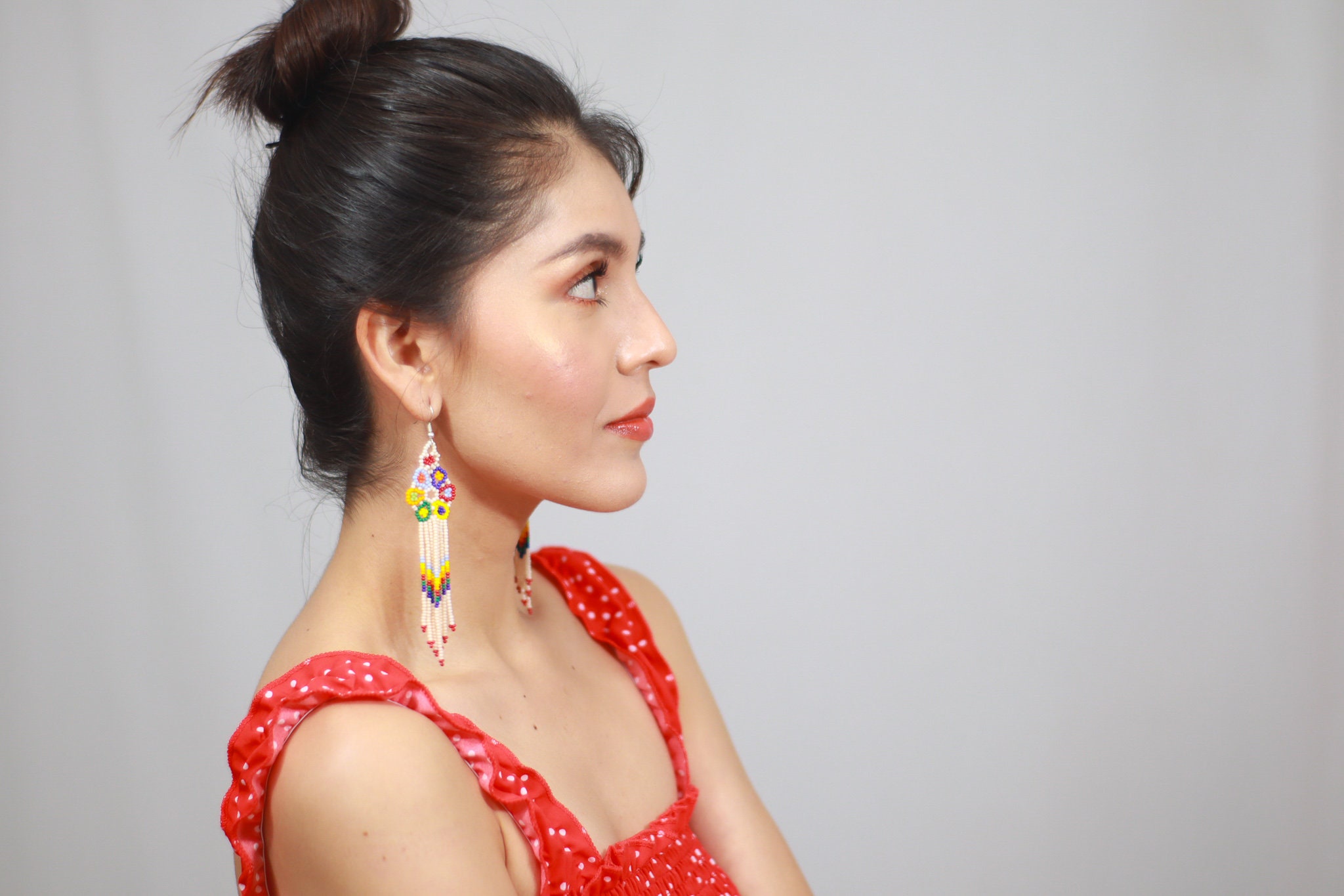 - These cream color based beaded earrings feature a lightweight peyote "flower" design with bright and rich complementary colors. They are a great balance between size and weight and will brighten up any outfit with their big presence.