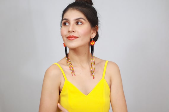 Native American Seed Bead Earrings, Native Beaded Earrings, Huichol Earrings, Native American Beadwork, Beaded Chandelier Earrings, Bright